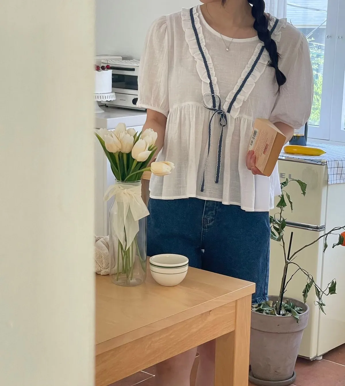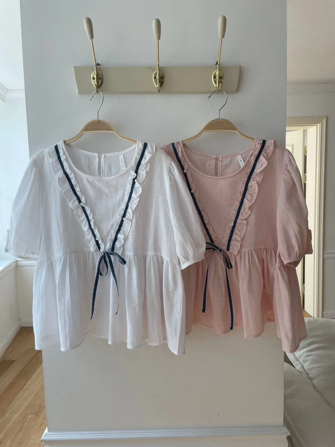 KM367法式緞帶薄款娃娃裝美衣 白 粉 官網價$760 線上價$730