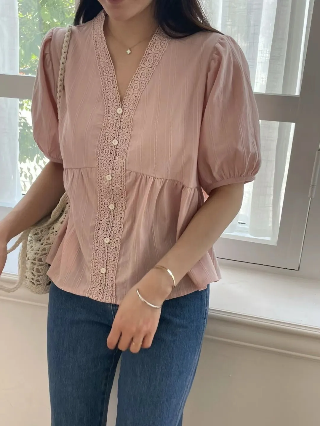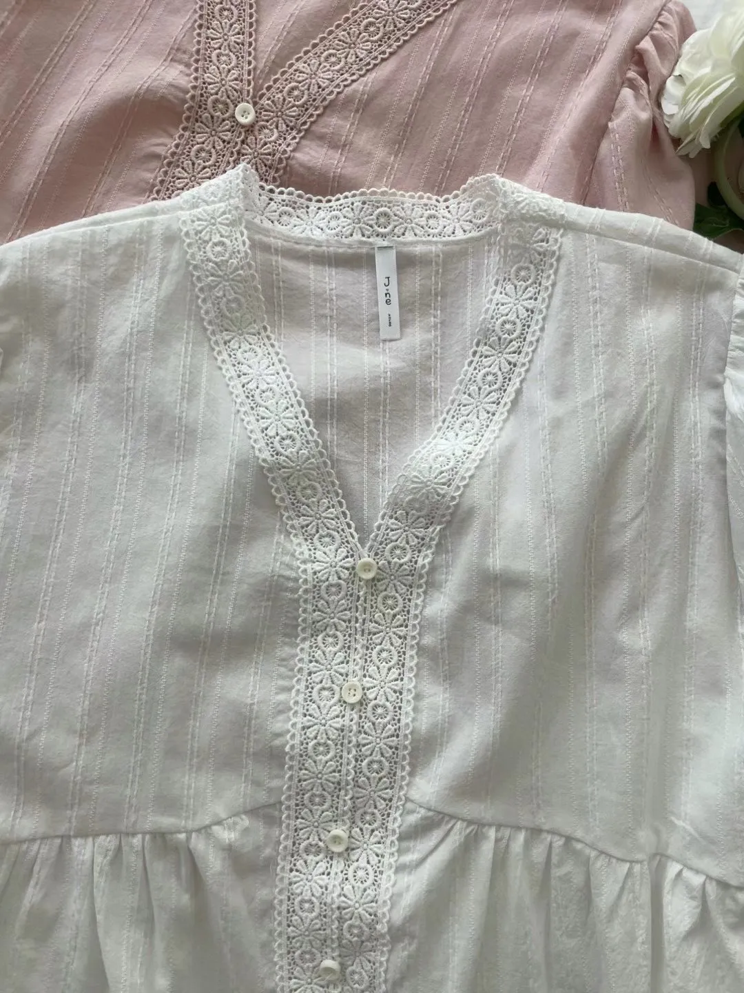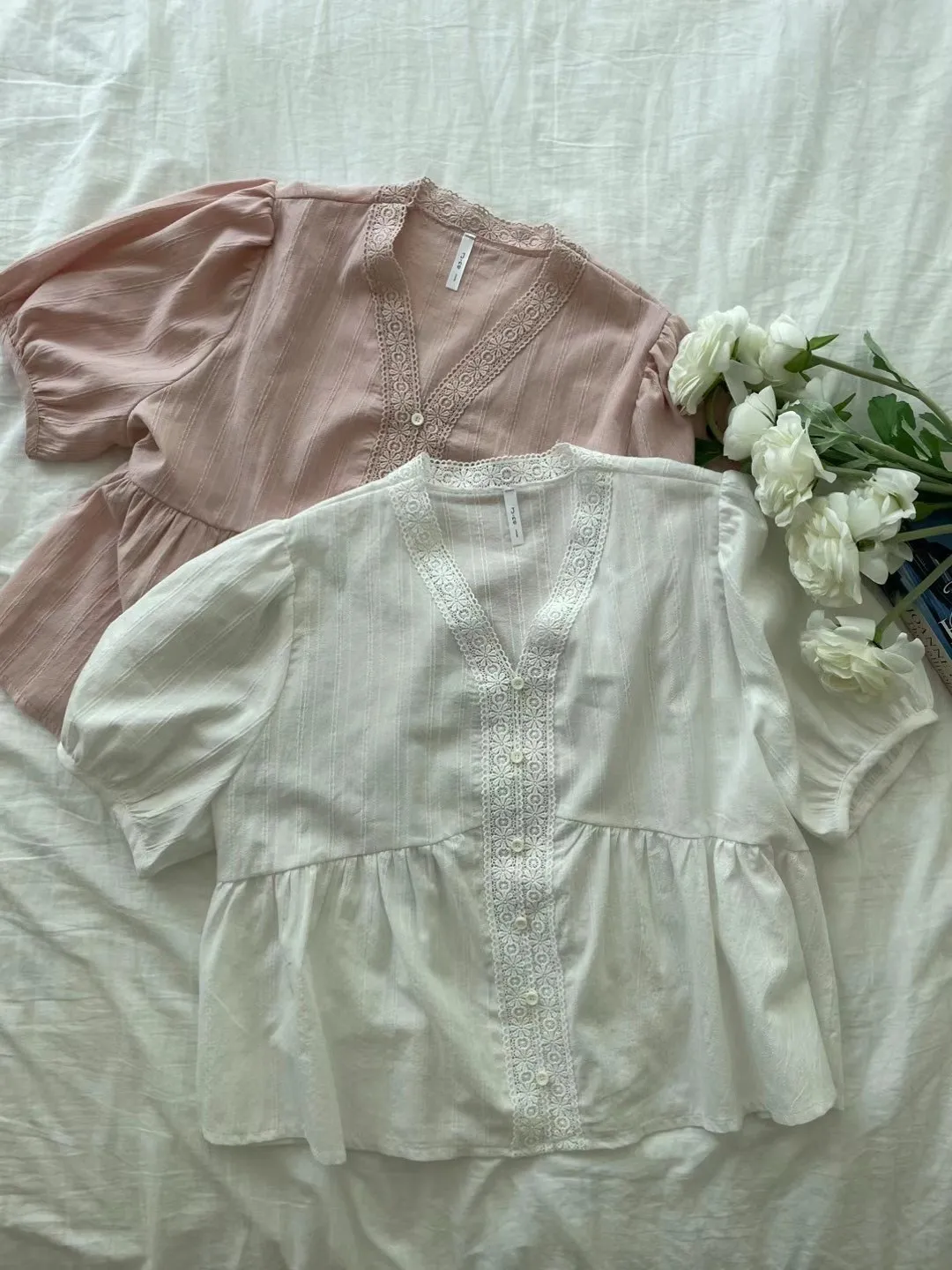 KM368氣質細緻V領娃娃裝上衣 白 粉 官網價$729 線上價$699