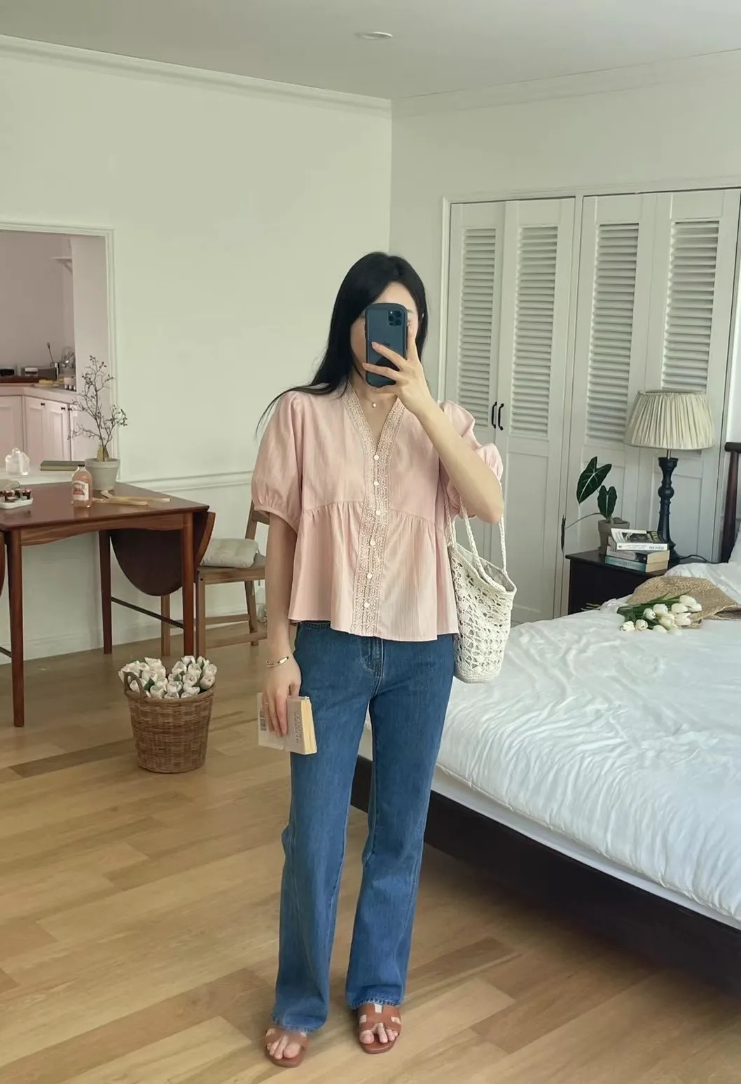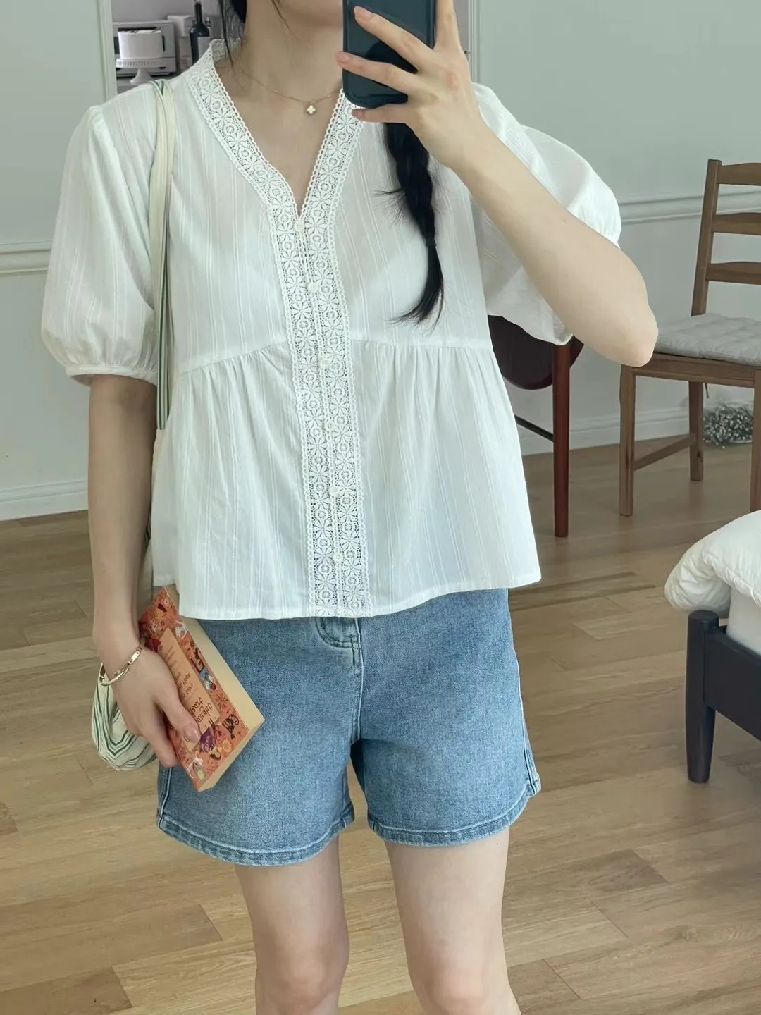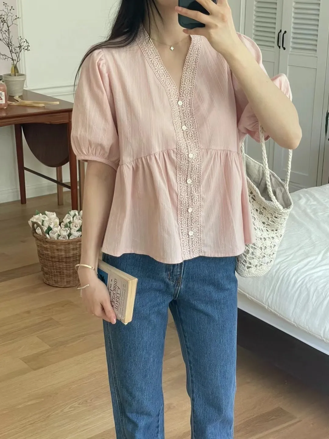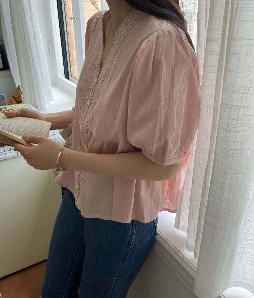 KM368氣質細緻V領娃娃裝上衣 白 粉 官網價$729 線上價$699