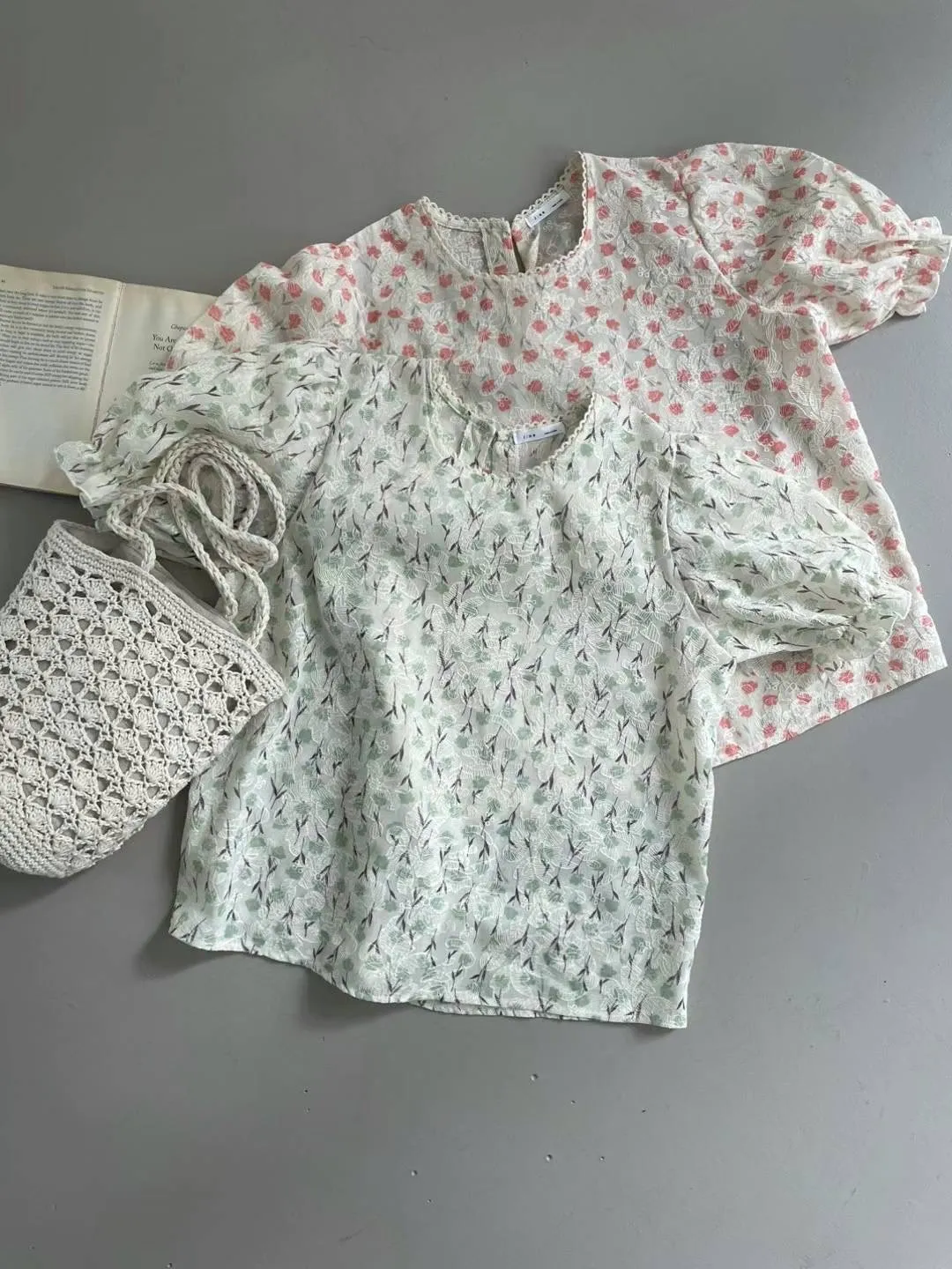 KM373可愛滿版小花蕾絲滾邊上衣 綠 粉 官網價$810 線上價$780