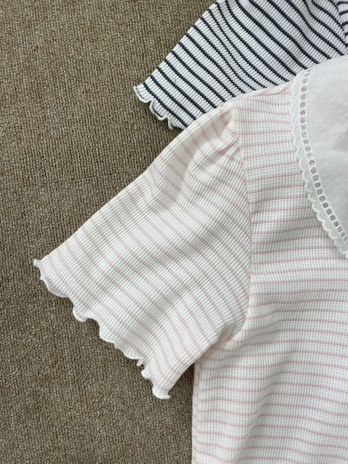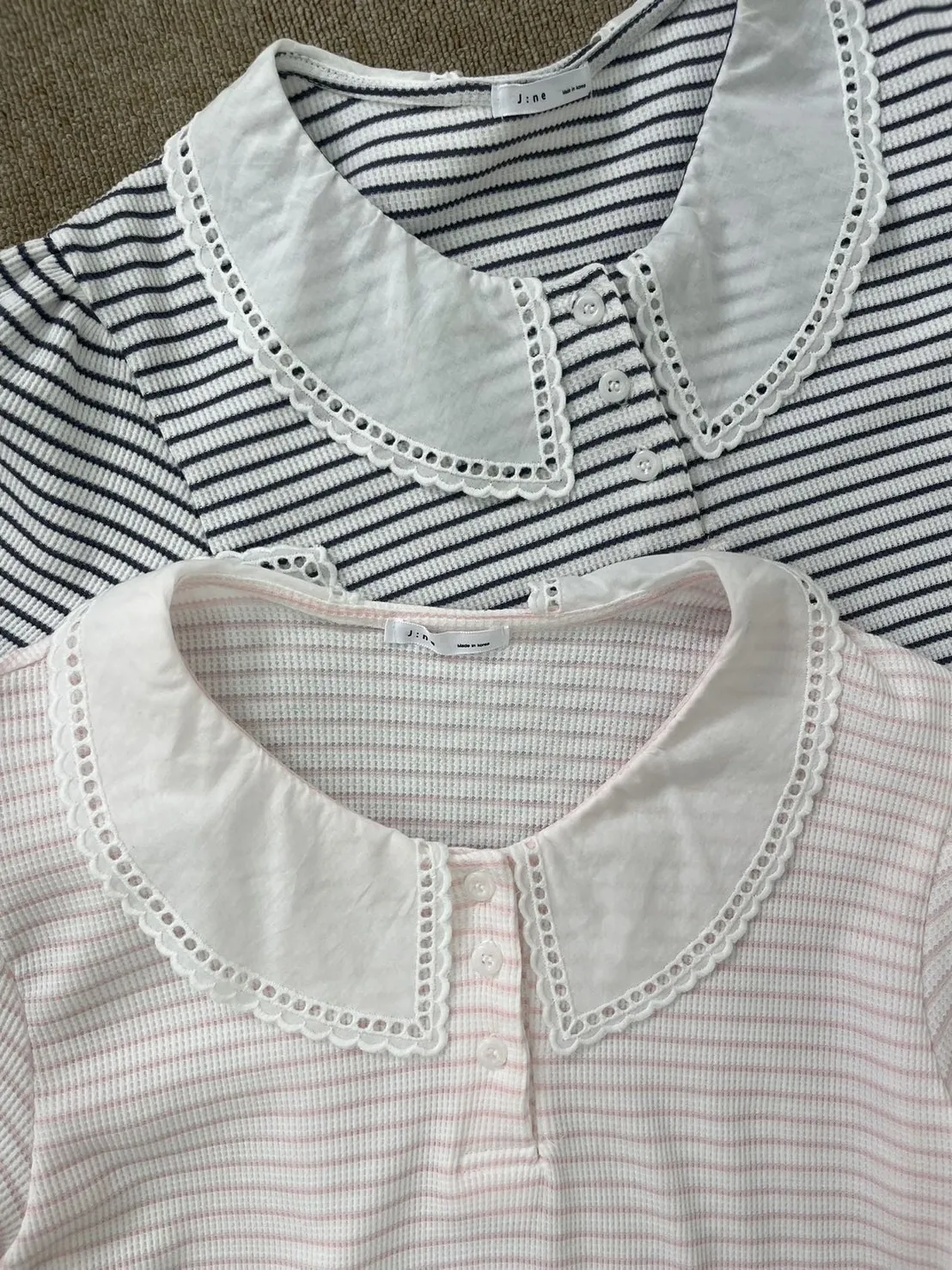 棉 華夫格面料 軟蕾絲細洞簍空翻領 有彈性 不易皺面料 穿到L號