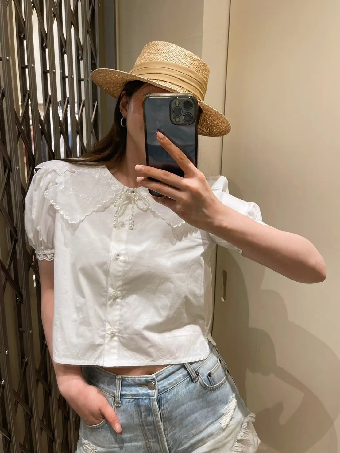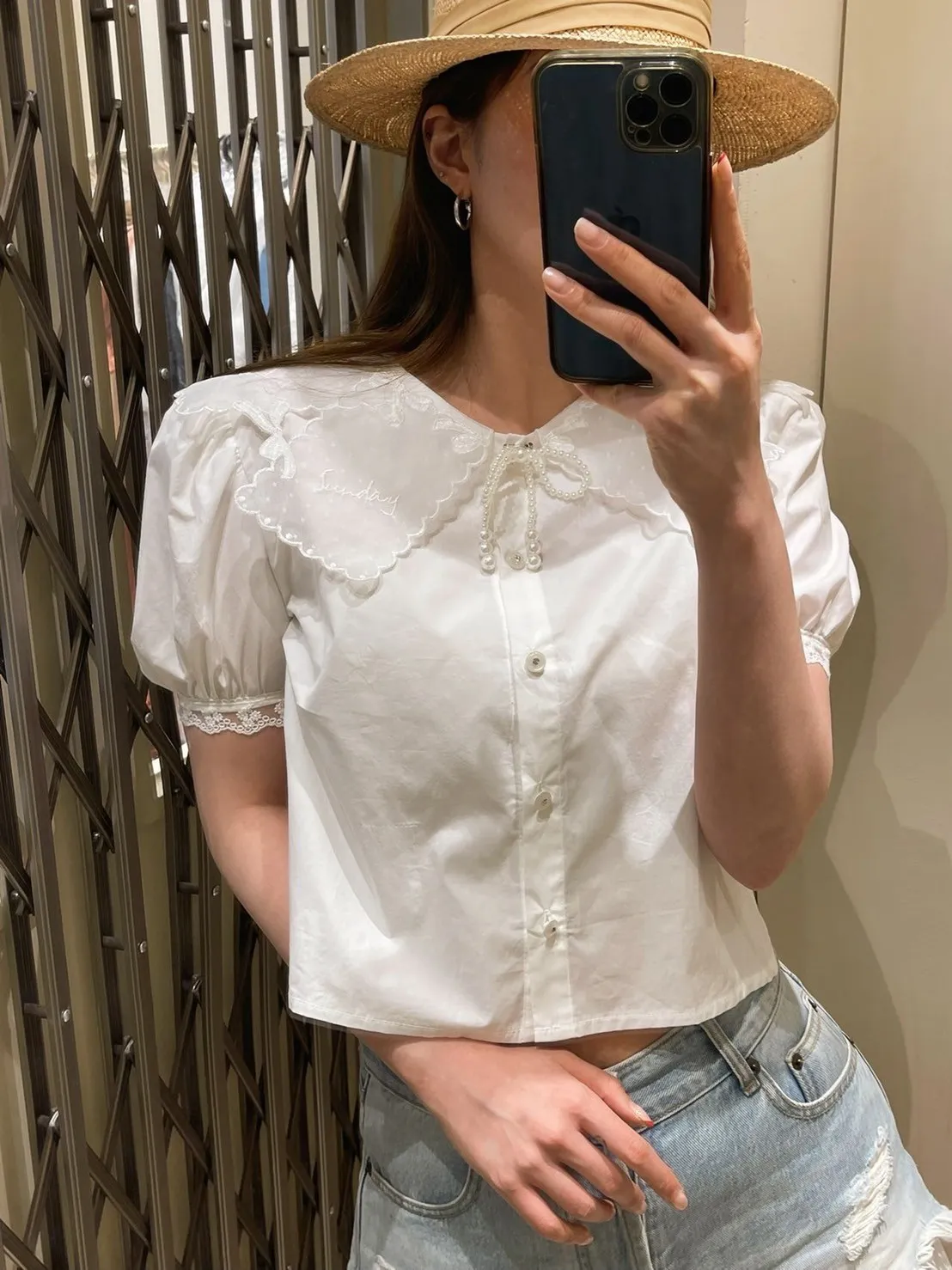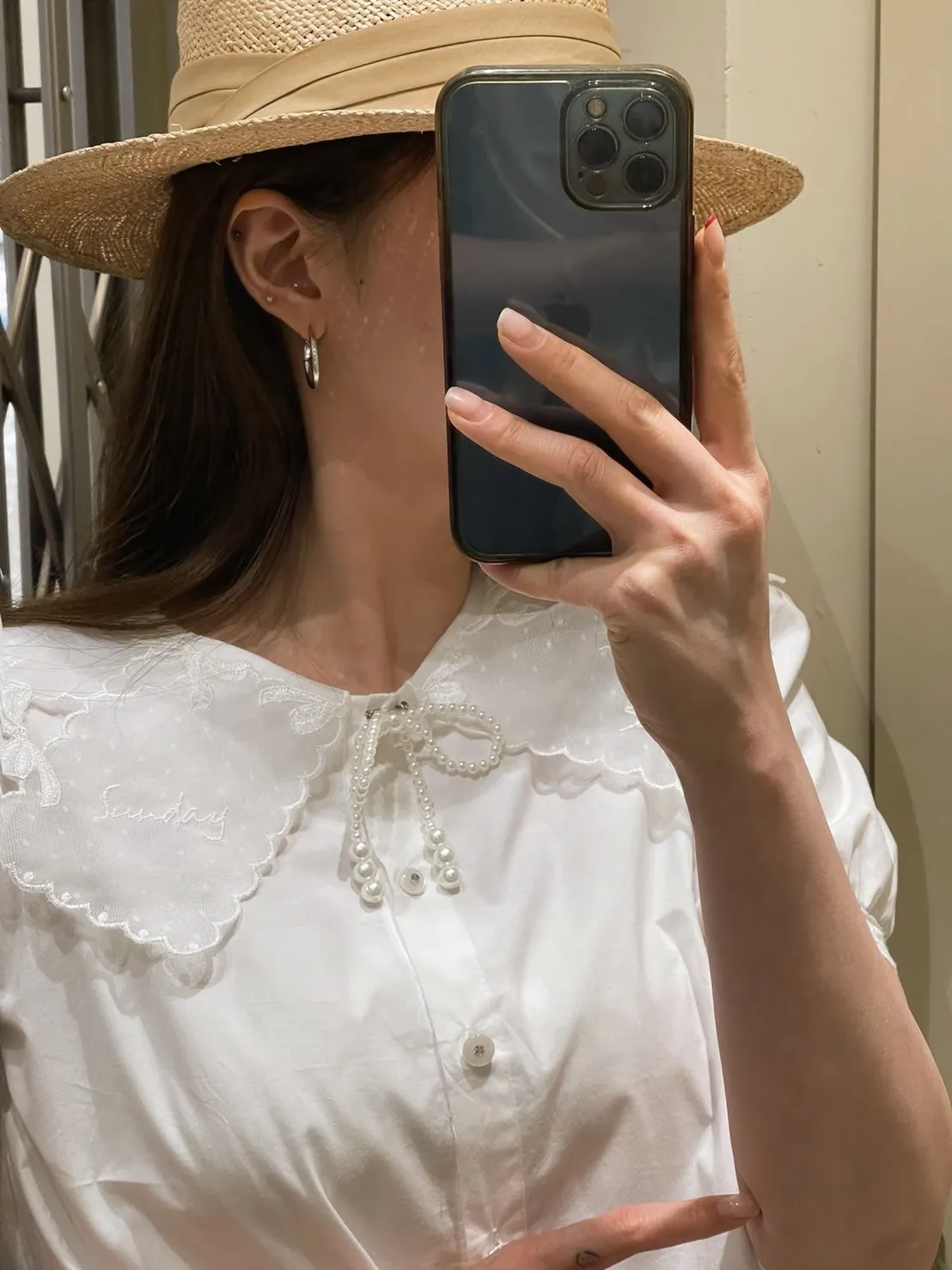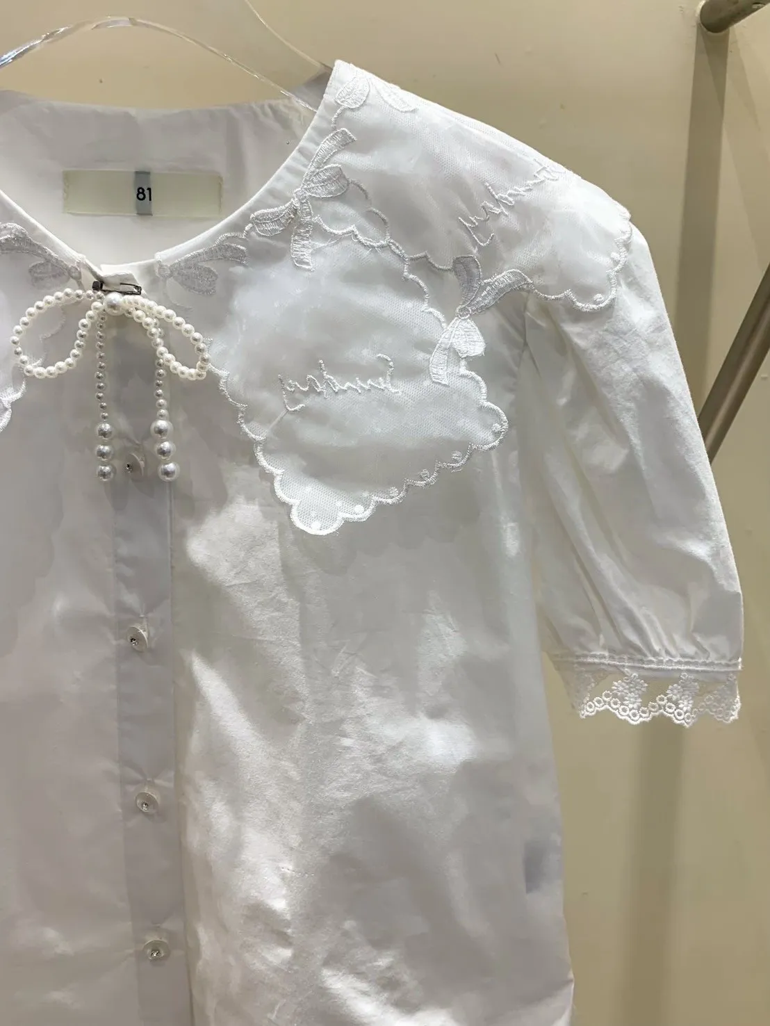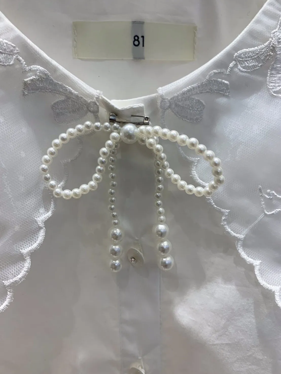棉+聚酯 精緻英文刺繡 透光美視覺翻領 蝴蝶結裝飾 鑽釦穿脫