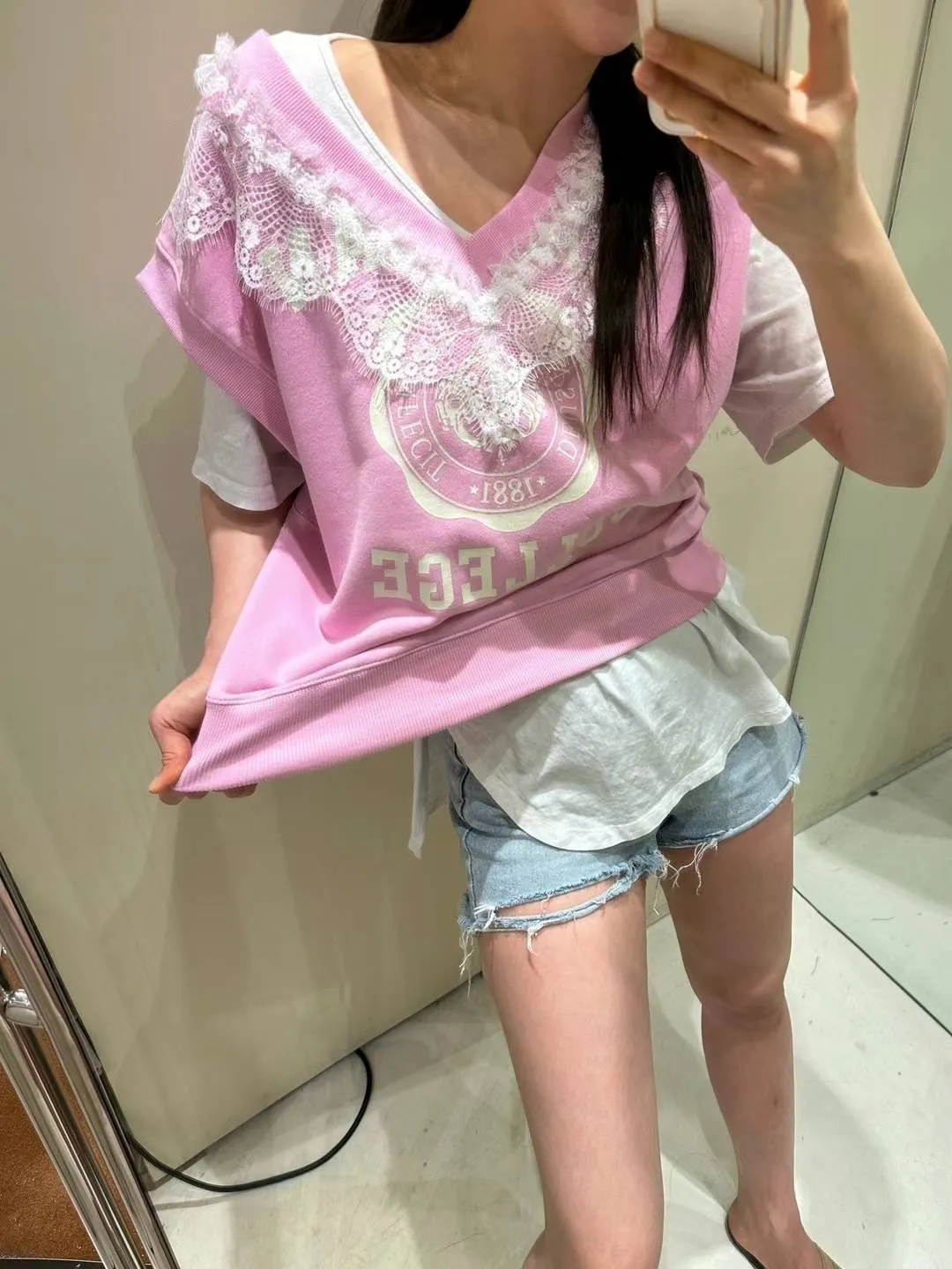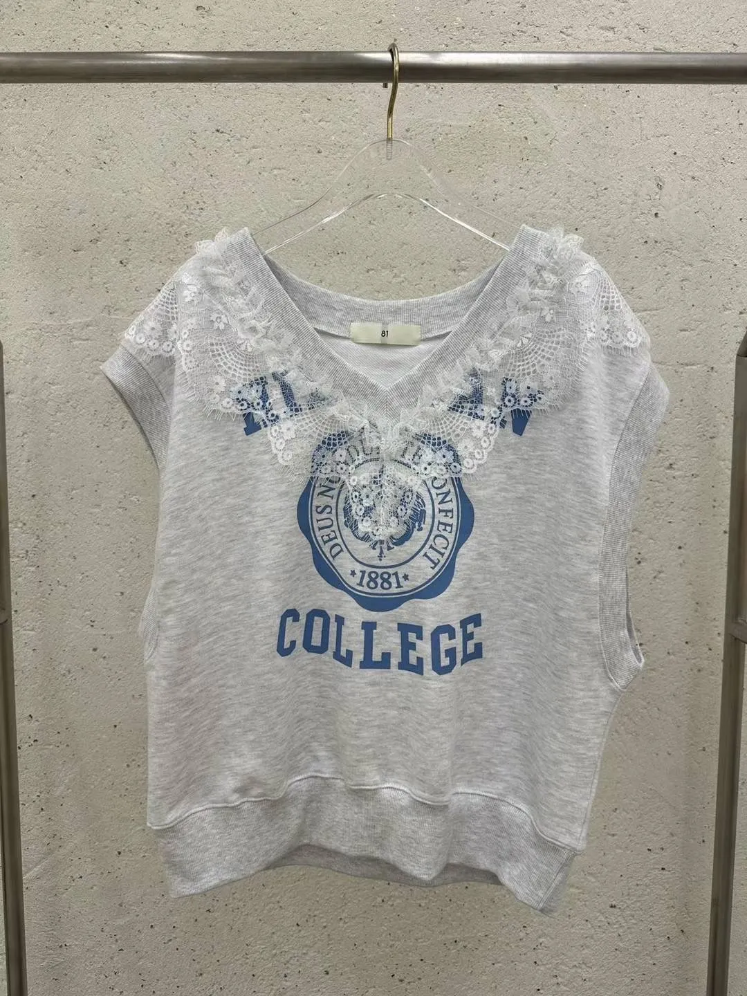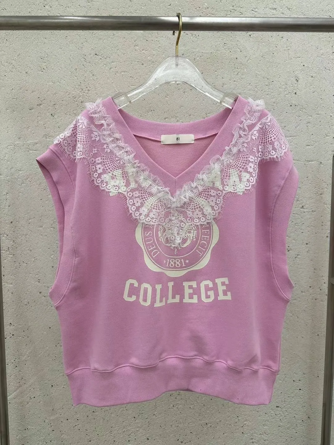KM412學院風V領蕾絲無袖背心 灰 粉 官網價$1210 線上價$1180