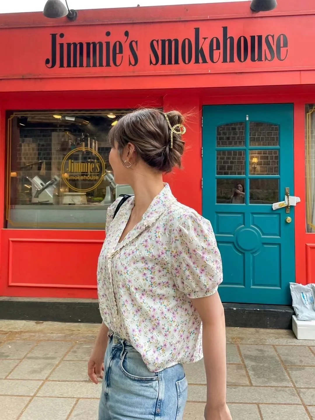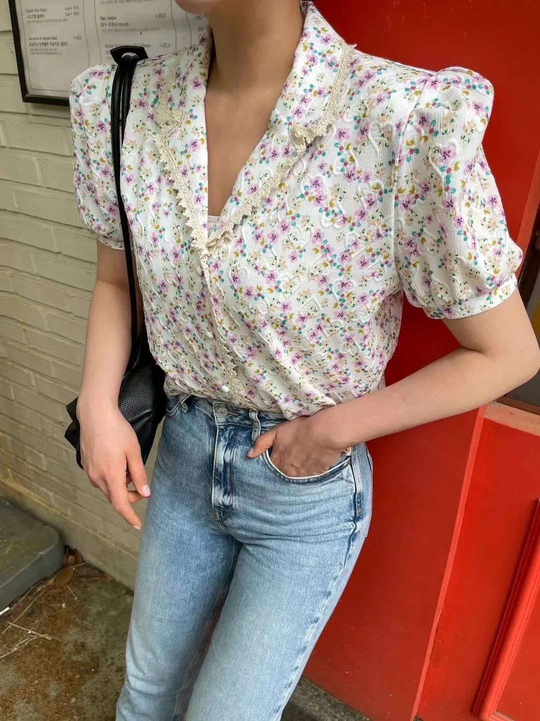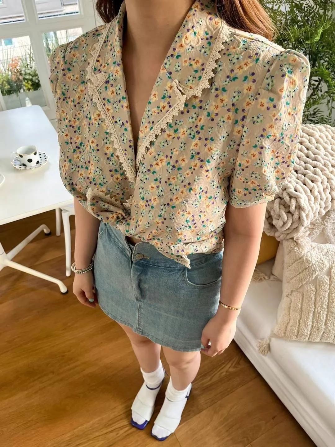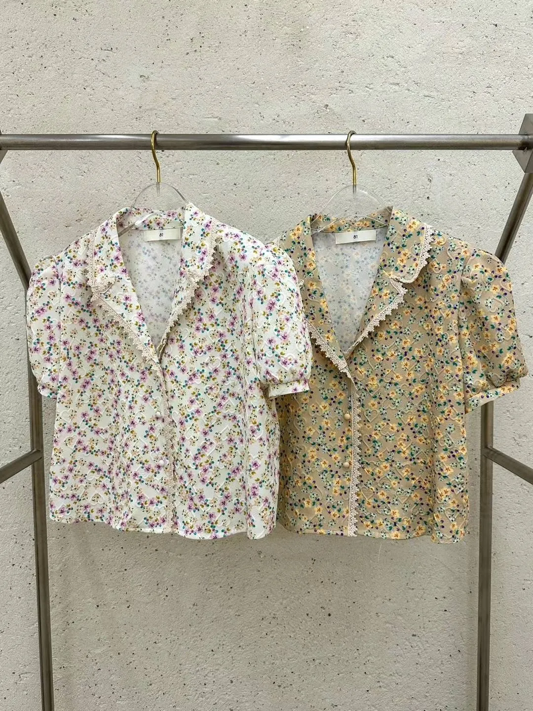 KM413蕾絲滾邊愛心壓紋小花上衣 白 黃 官網價$1450 線上價$1420