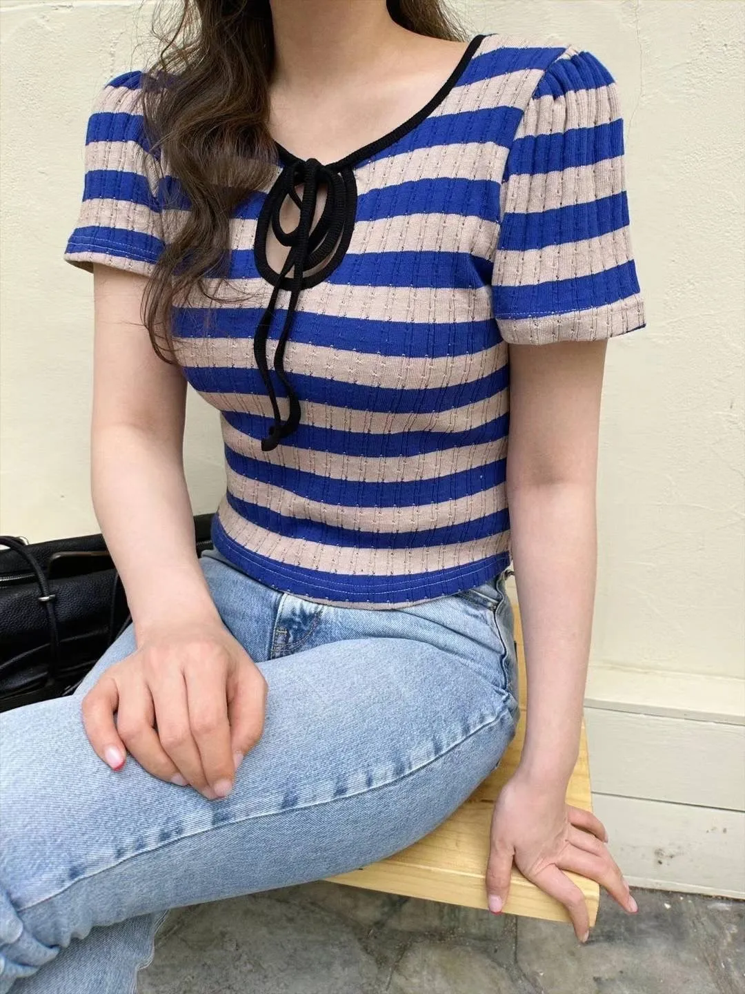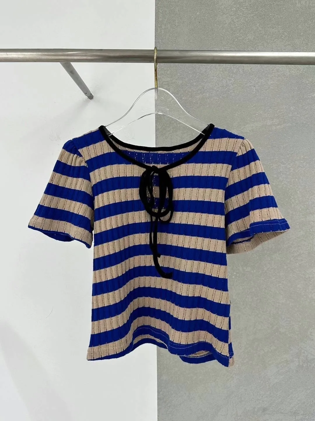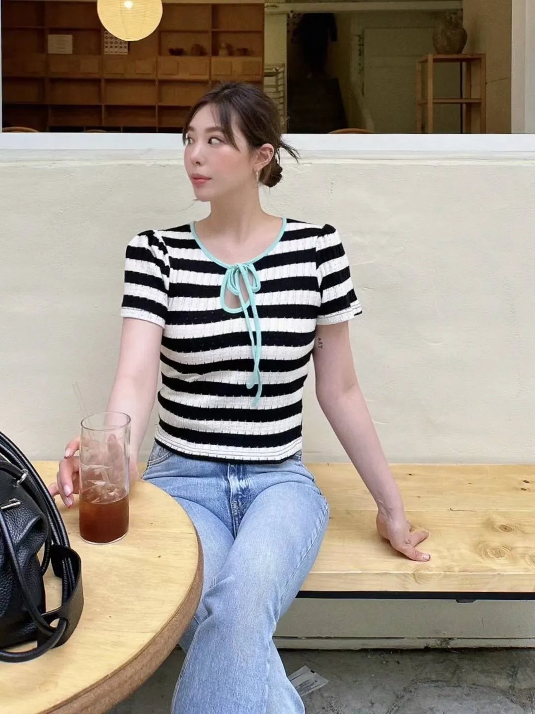KM415跳色胸綁帶橫條上衣(橫條分色) 黑 藍 官網價$1050 線上價$1020