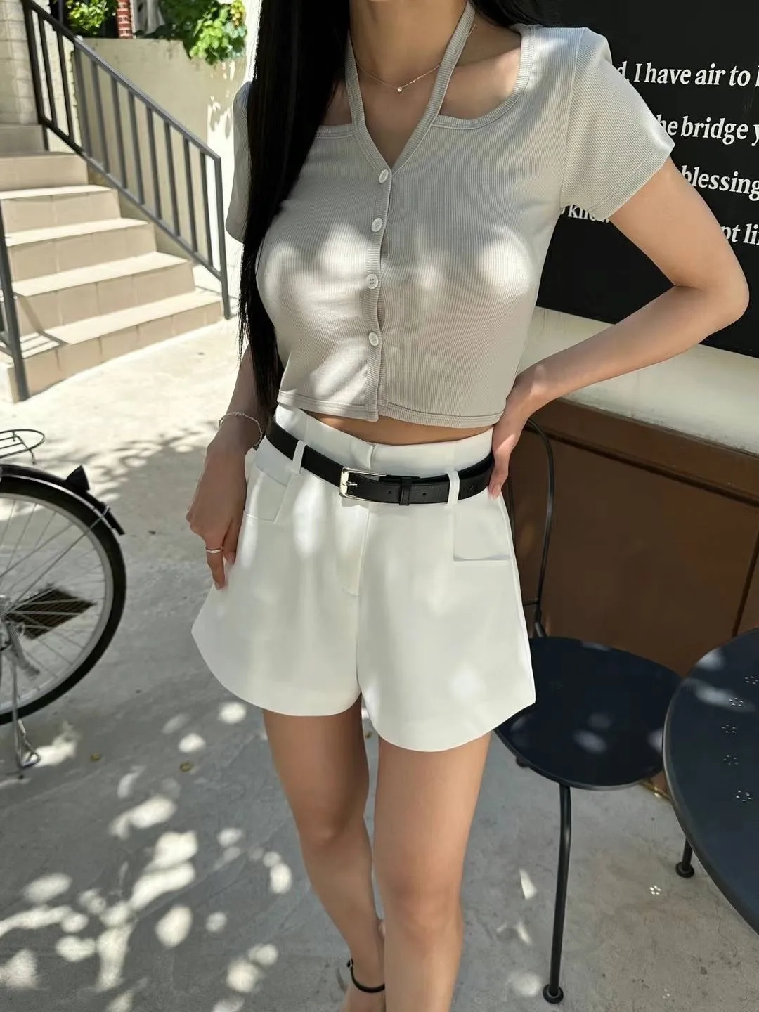 KM422美頸雙條簍空短版上衣 白 粉 黑 米綠 官網價$590 線上價$560