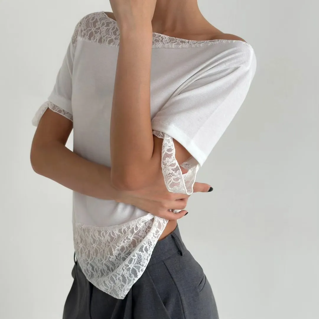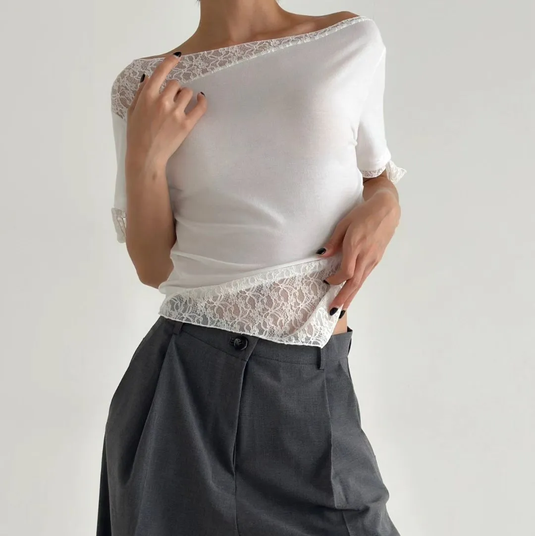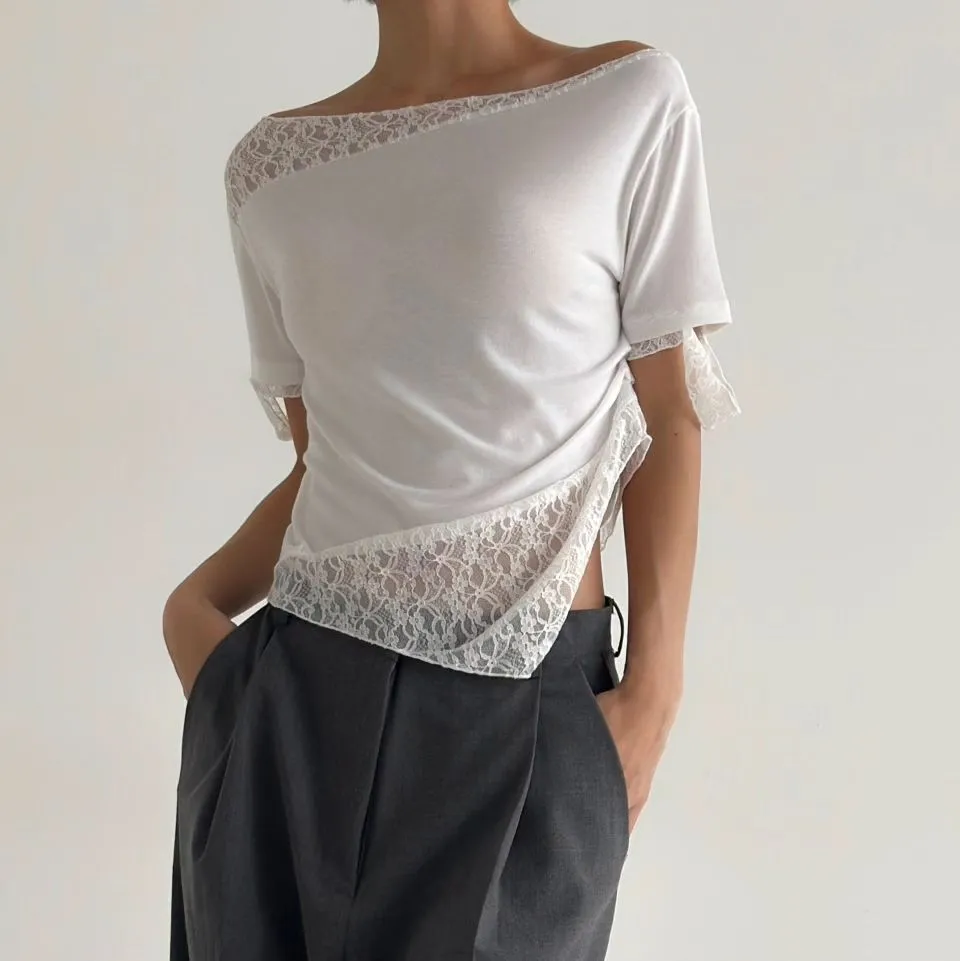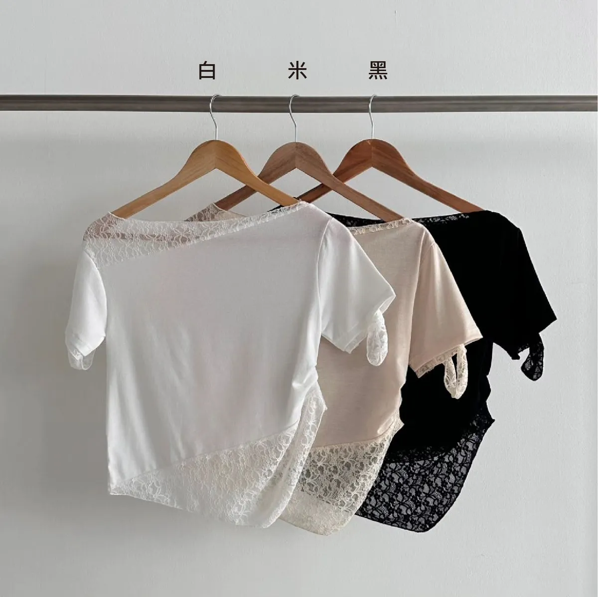 KM455推薦款拼接蕾絲不規則下擺美衣 白 米 黑 官網價$420 線上價$390棉 莫代爾觸感 輕盈親膚 柔軟舒適 蕾絲拼接透膚