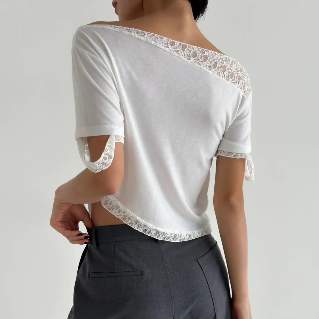 KM455推薦款拼接蕾絲不規則下擺美衣 白 米 黑 官網價$420 線上價$390