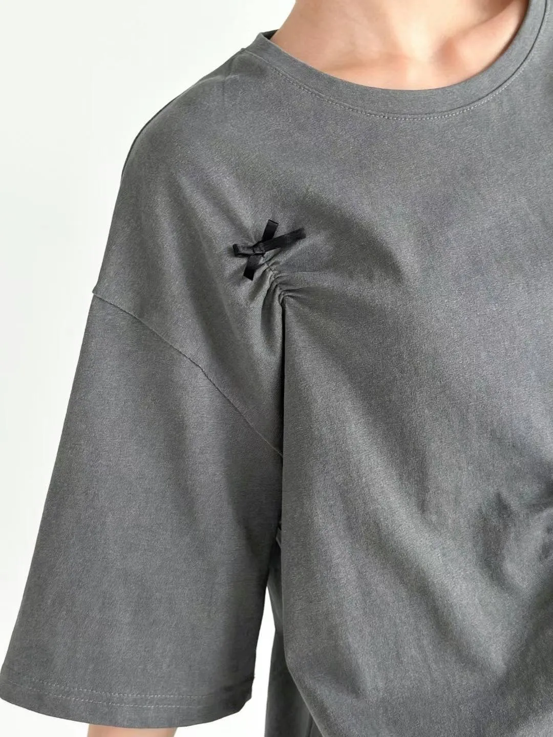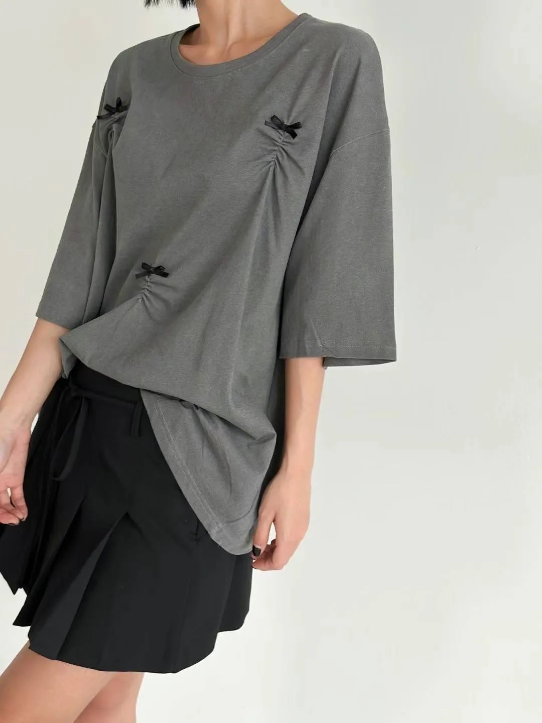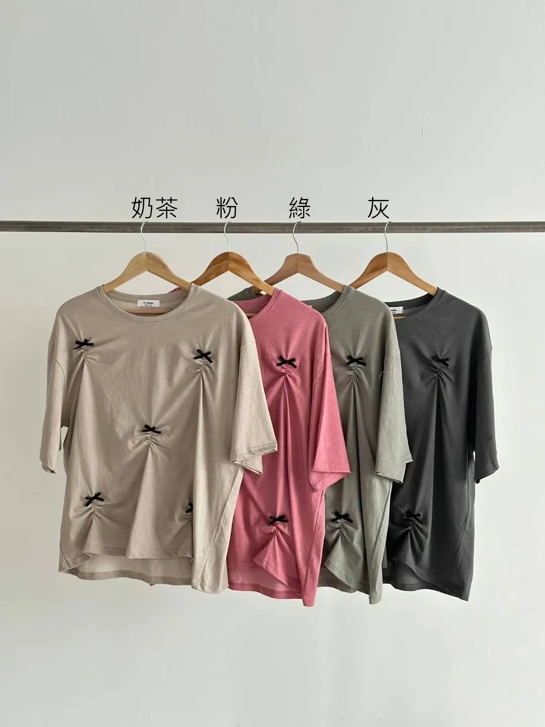KM457可愛蝴蝶結抓皺可愛Tshirt 奶茶 粉 綠 灰 官網價$570 線上價$540棉+縲縈+聚酯,薄款涼感 柔軟Q彈 仿舊作風 適合台灣夏天