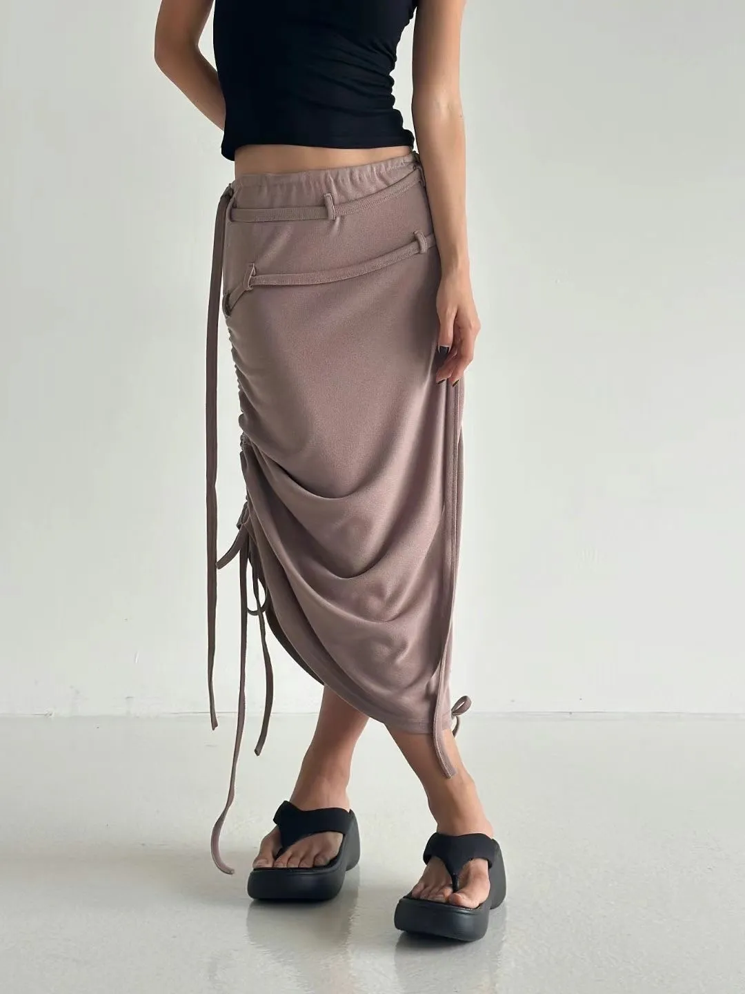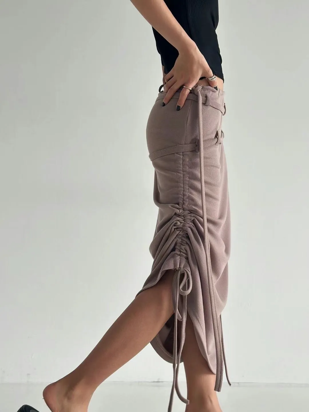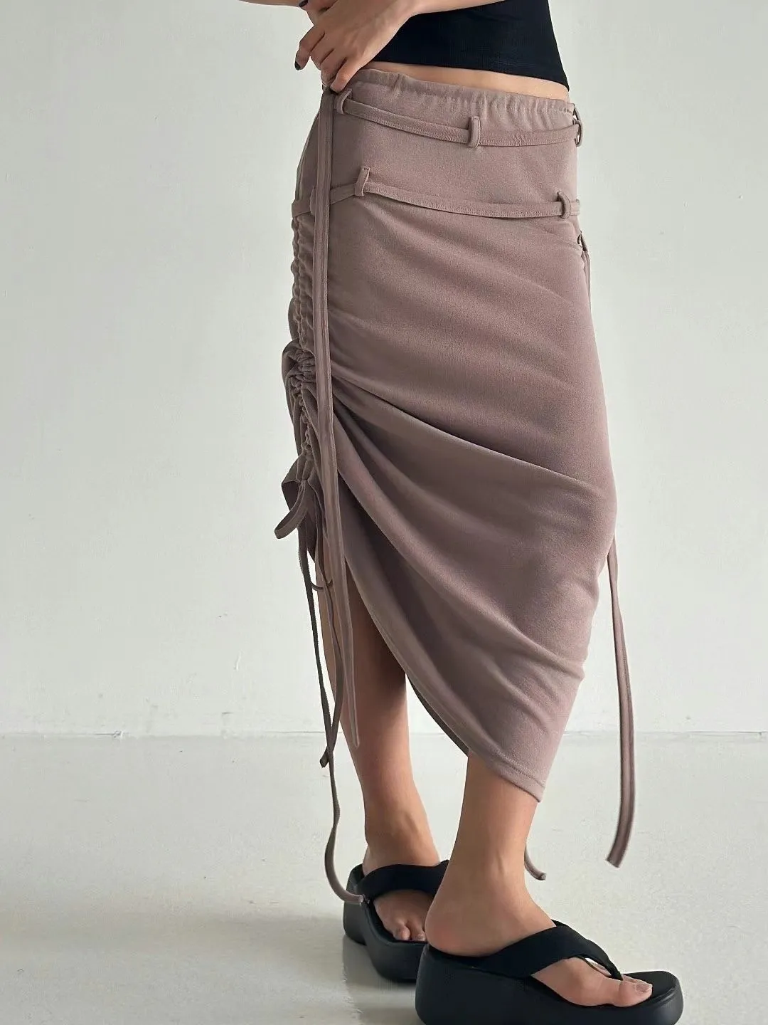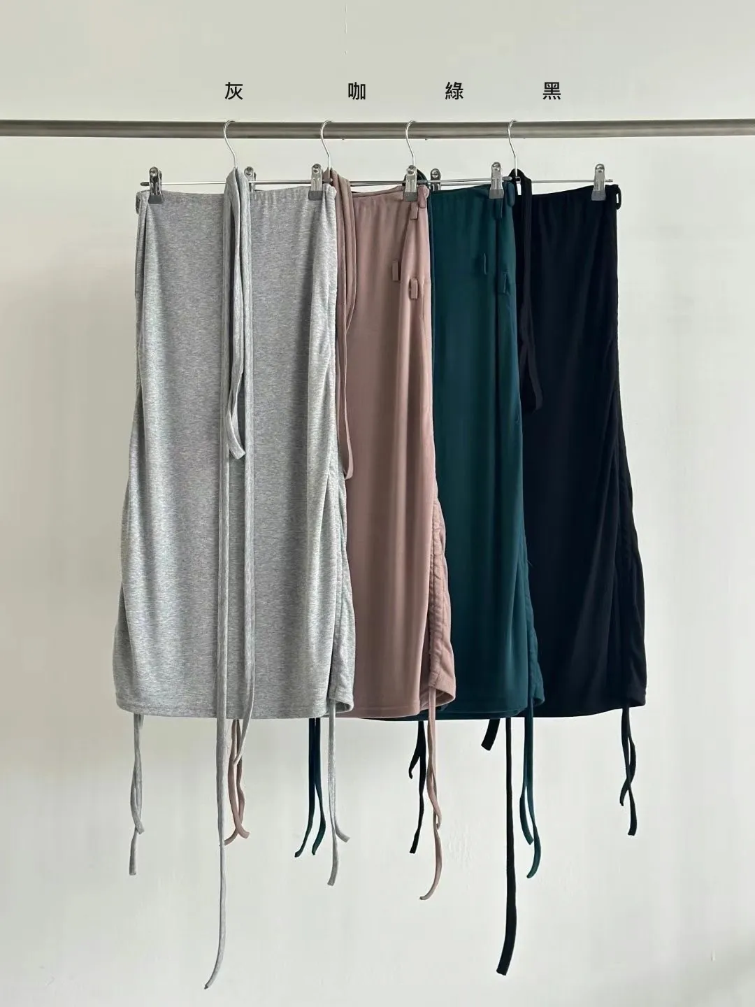 KM472設計感側腿抽繩美裙 灰 咖 綠 黑 官網價$580 線上價$550