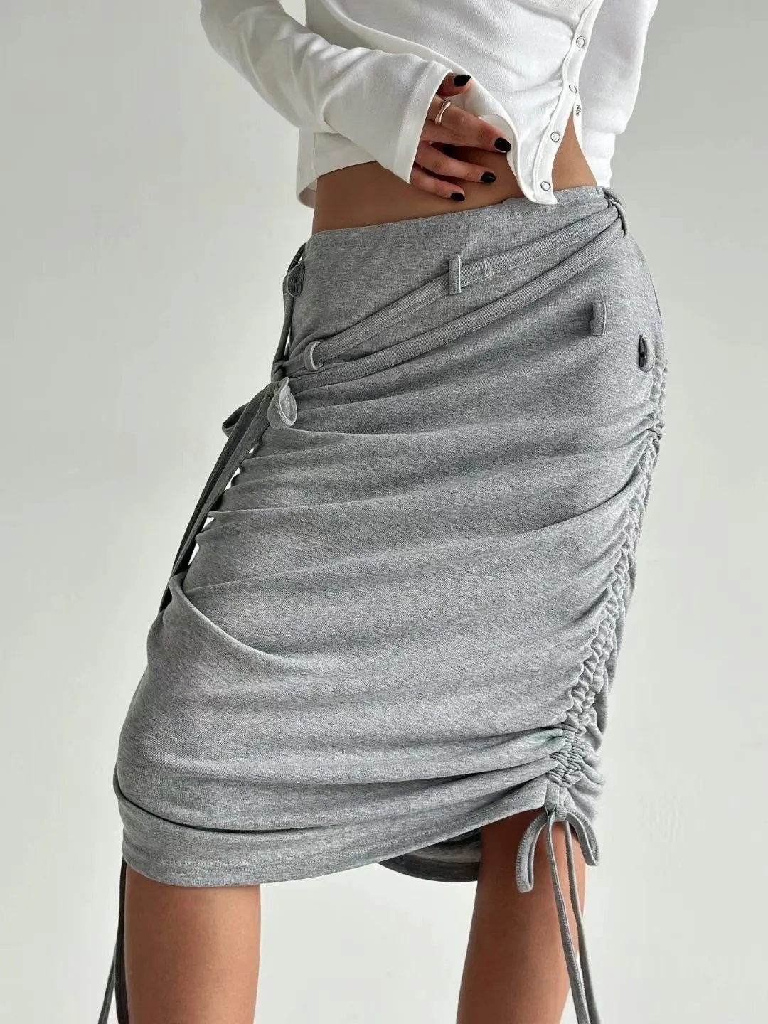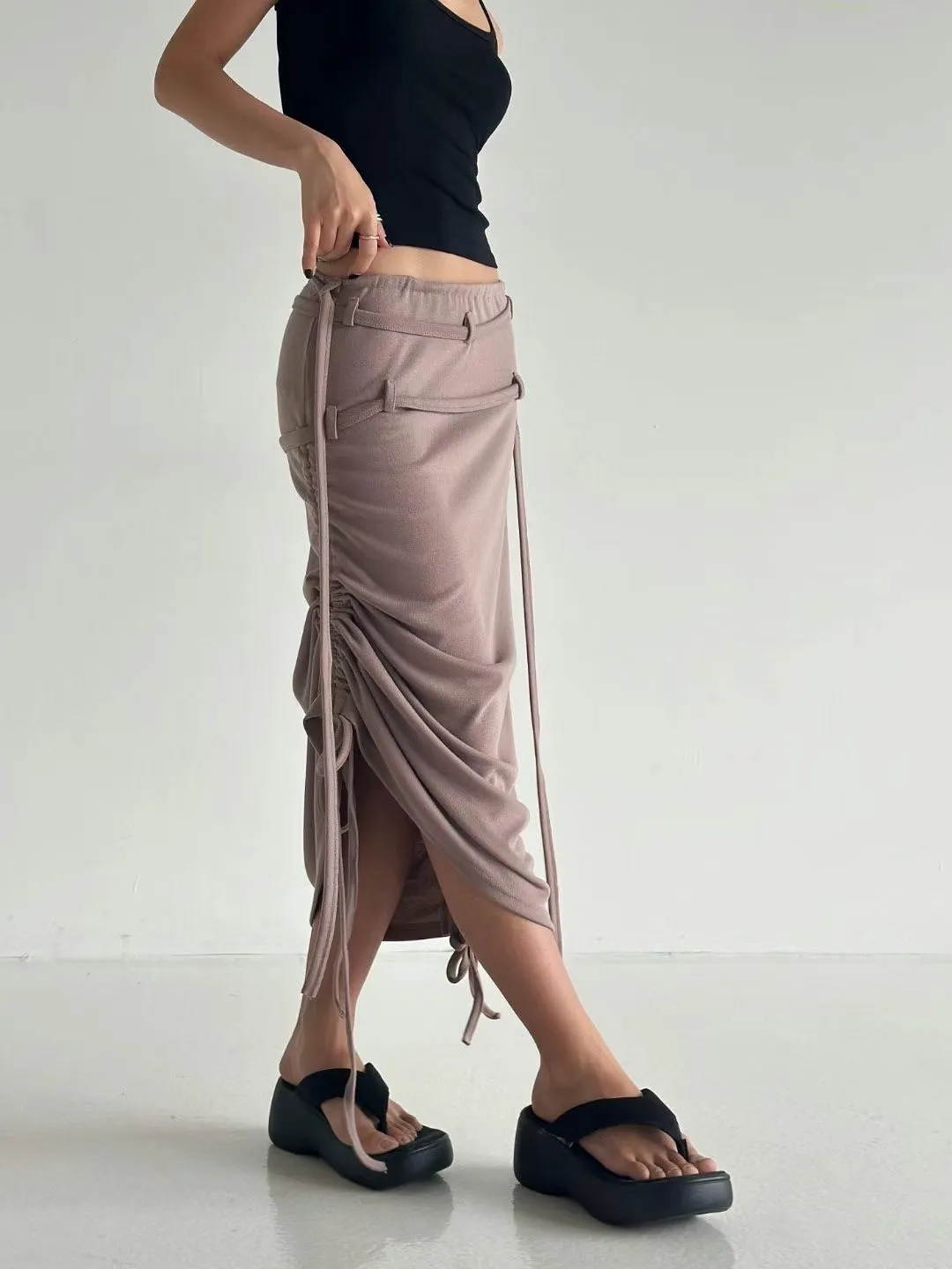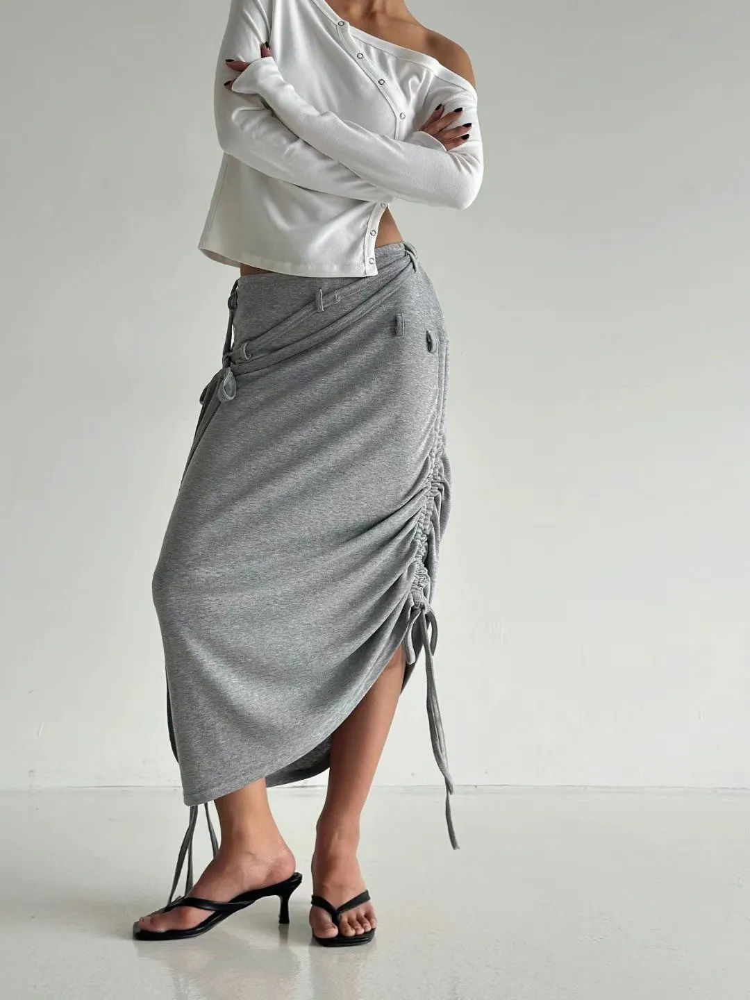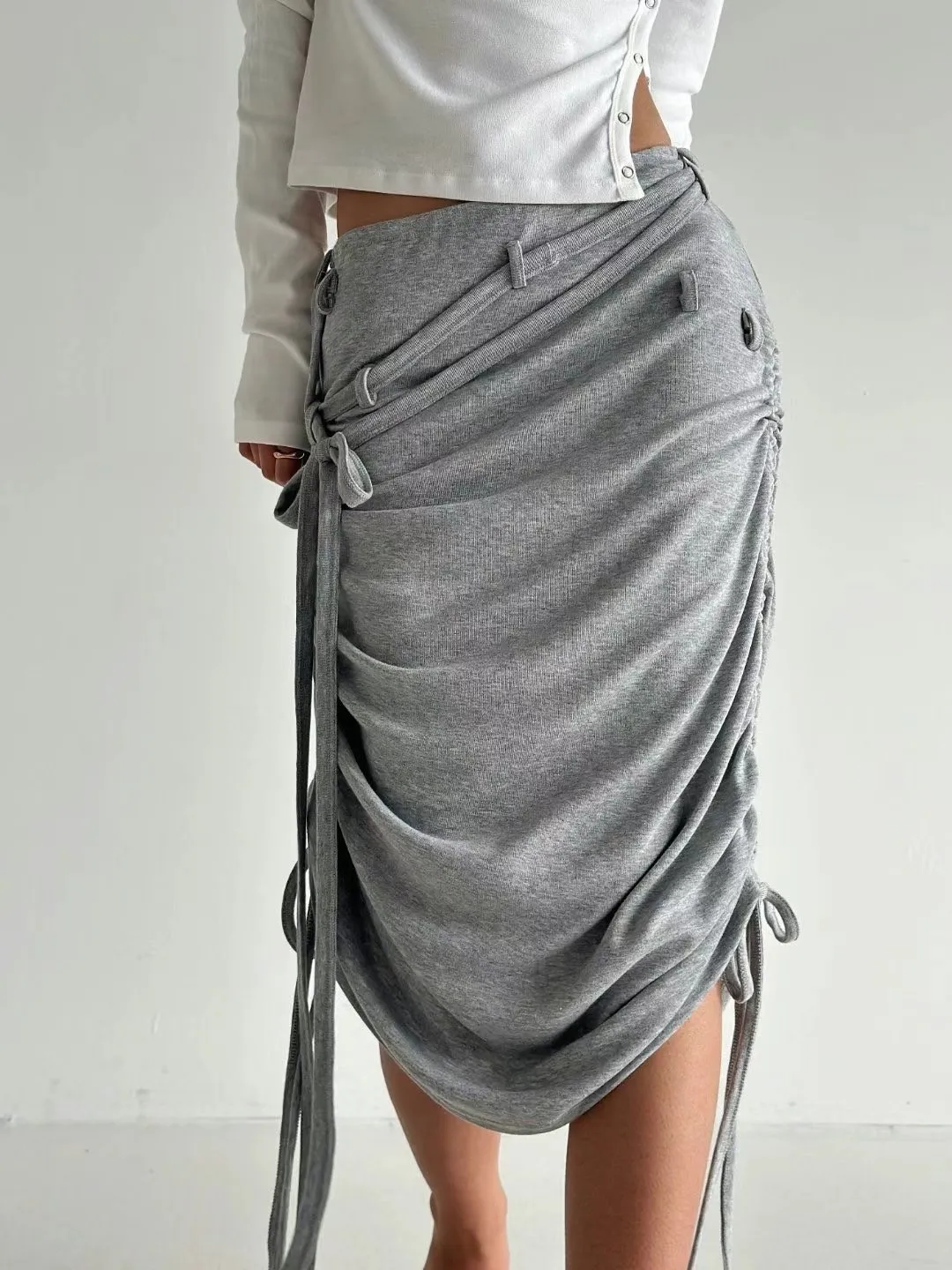 KM472設計感側腿抽繩美裙 灰 咖 綠 黑 官網價$580 線上價$550