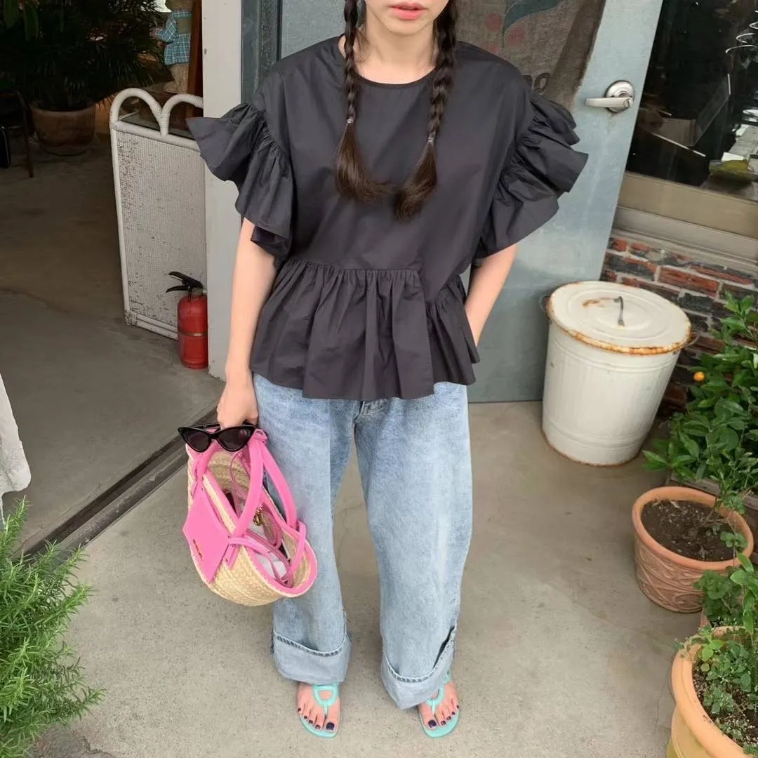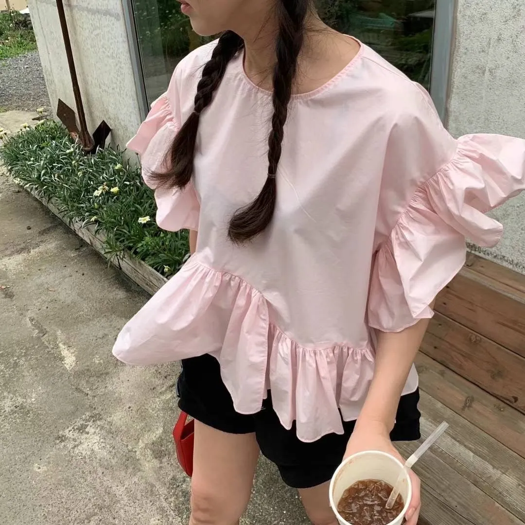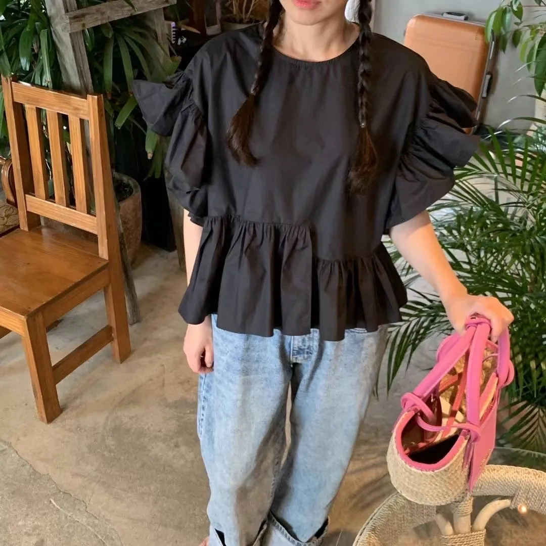 KM517設計感立體下擺娃娃裝上衣 黃 粉 墨 官網價$1190 線上價$1160