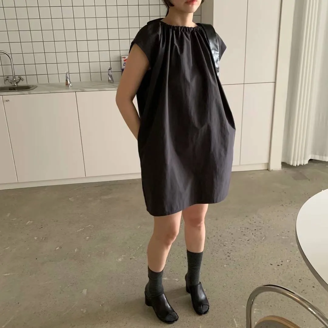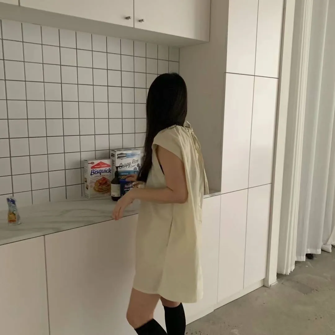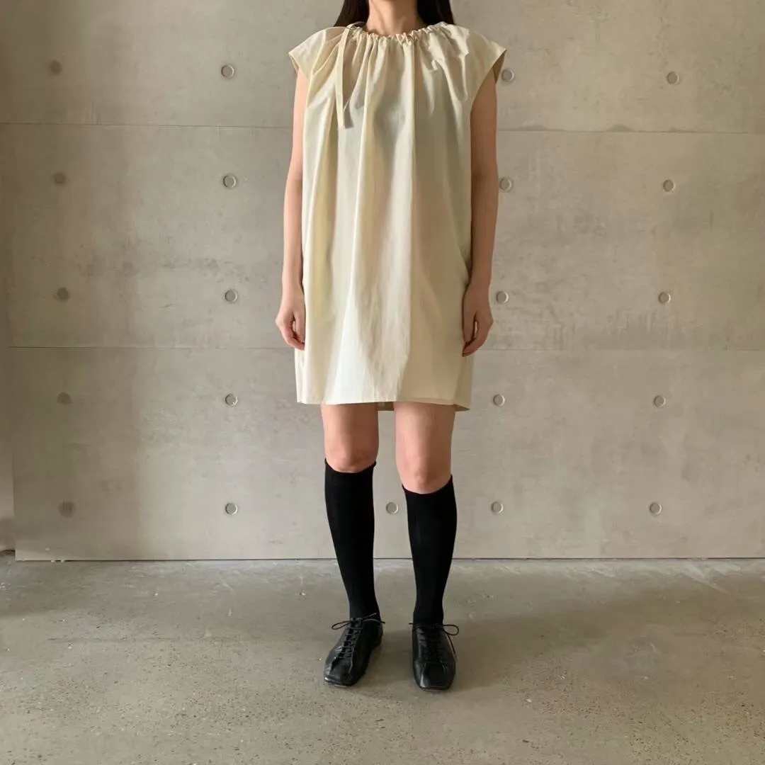 KM545抓皺圓領後頸綁帶洋裝 黃 灰 官網價$1490 線上價$1460