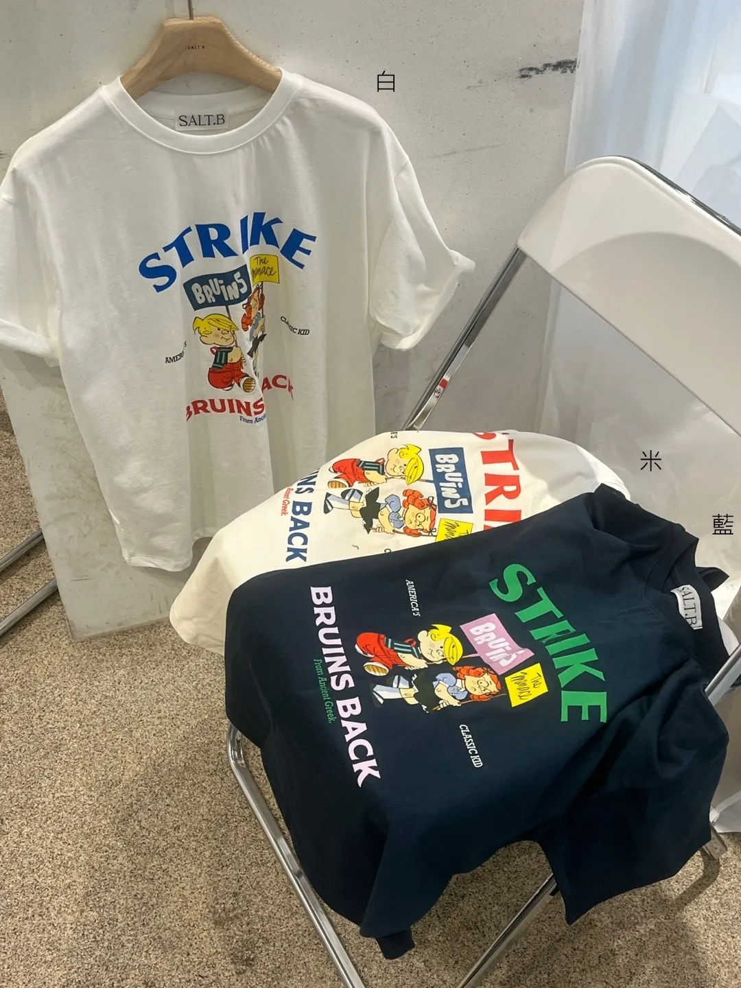 KM559可愛STRIKE卡通Tshirt 白 米 藍 官網價$560 線上價$530