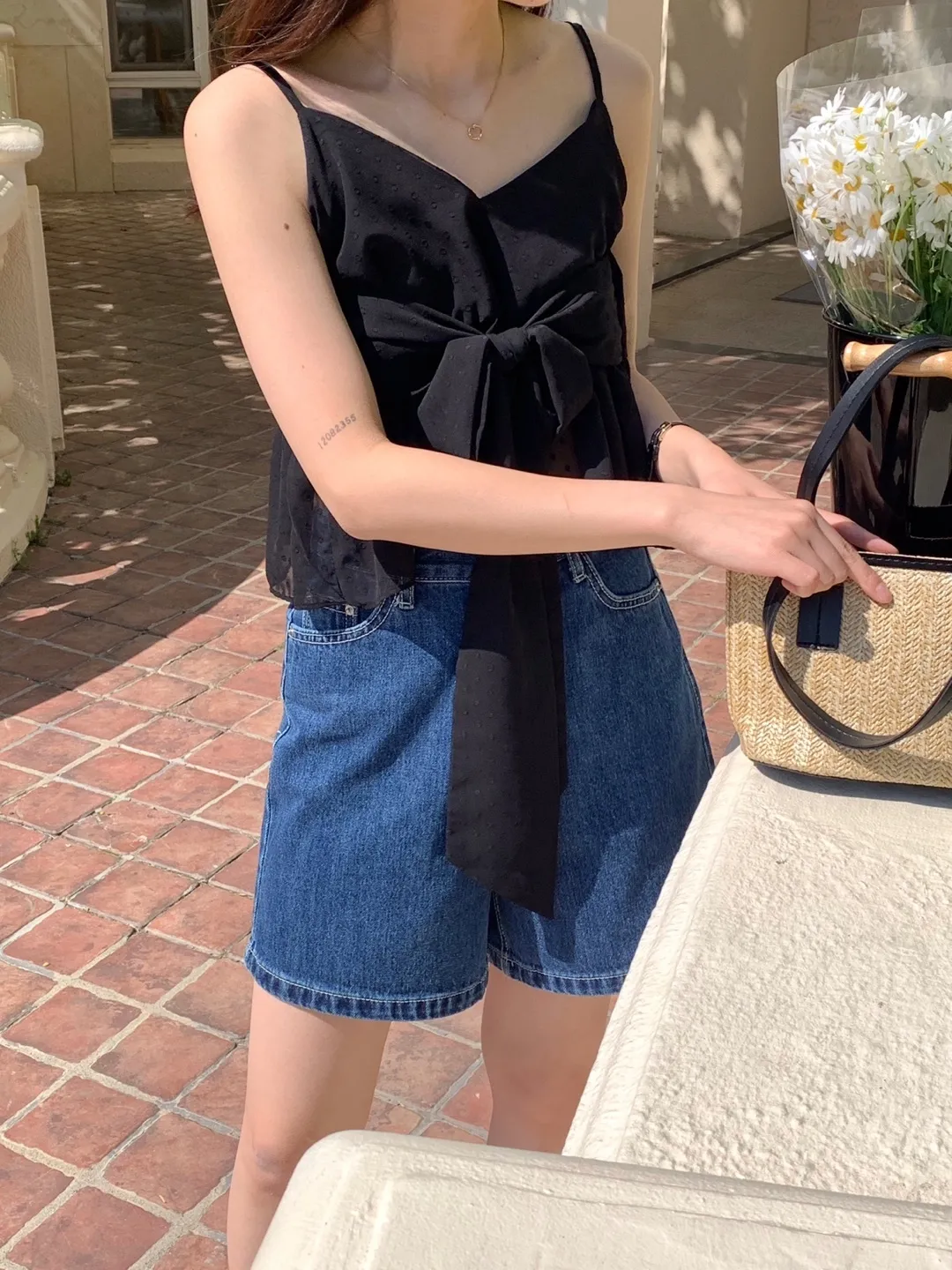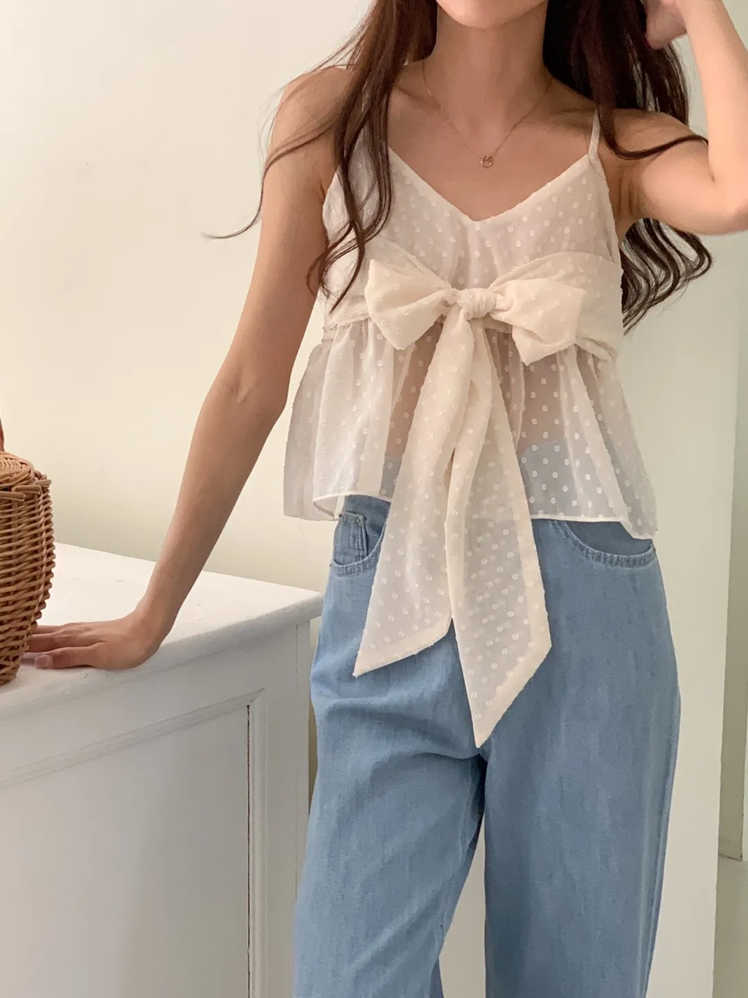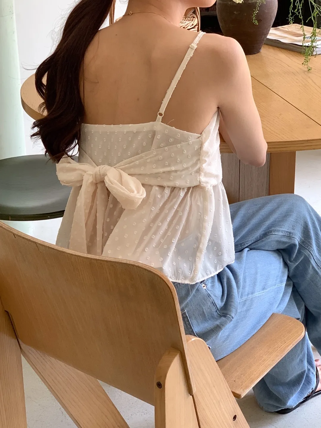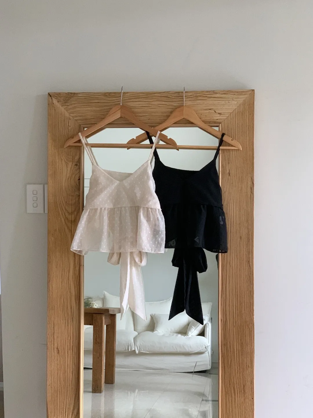 KM572細肩綁帶蝴蝶結小圈圈上衣 米 黑 官網價$820 線上價$790