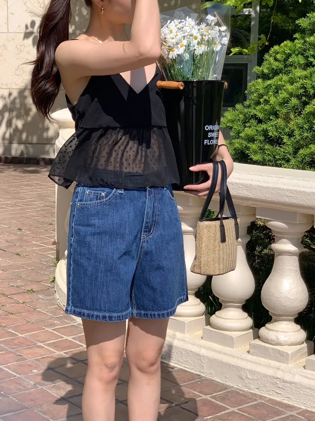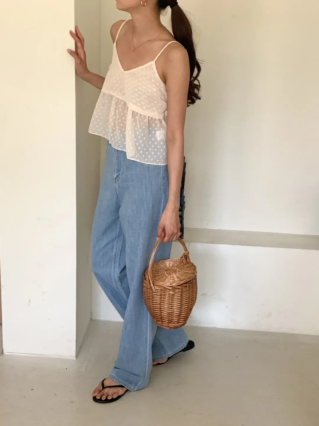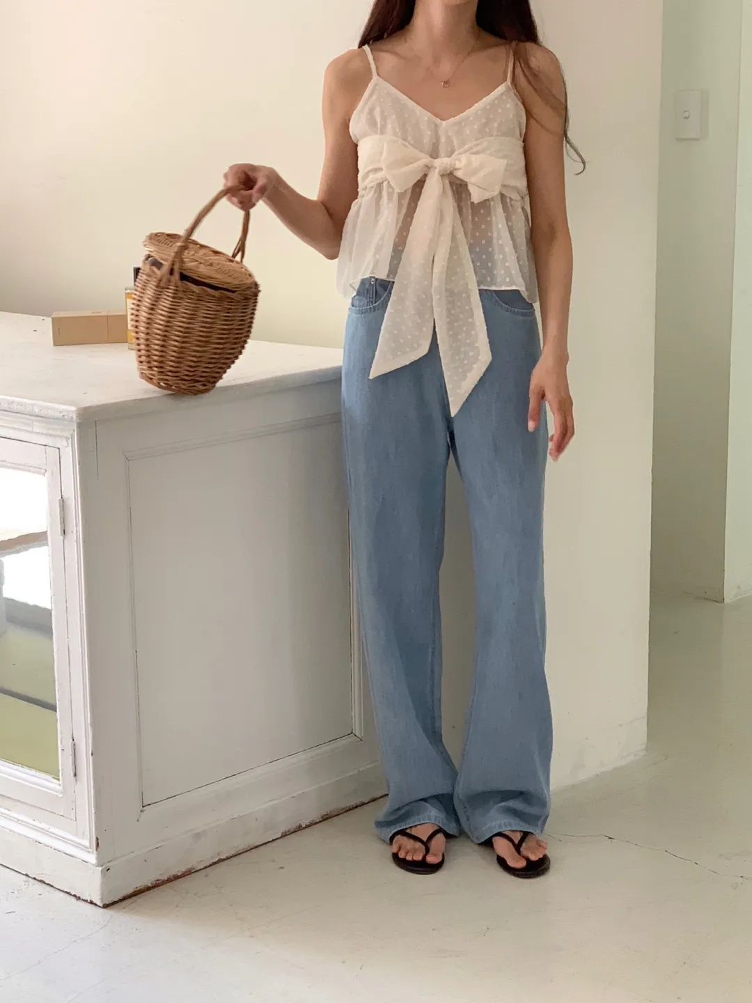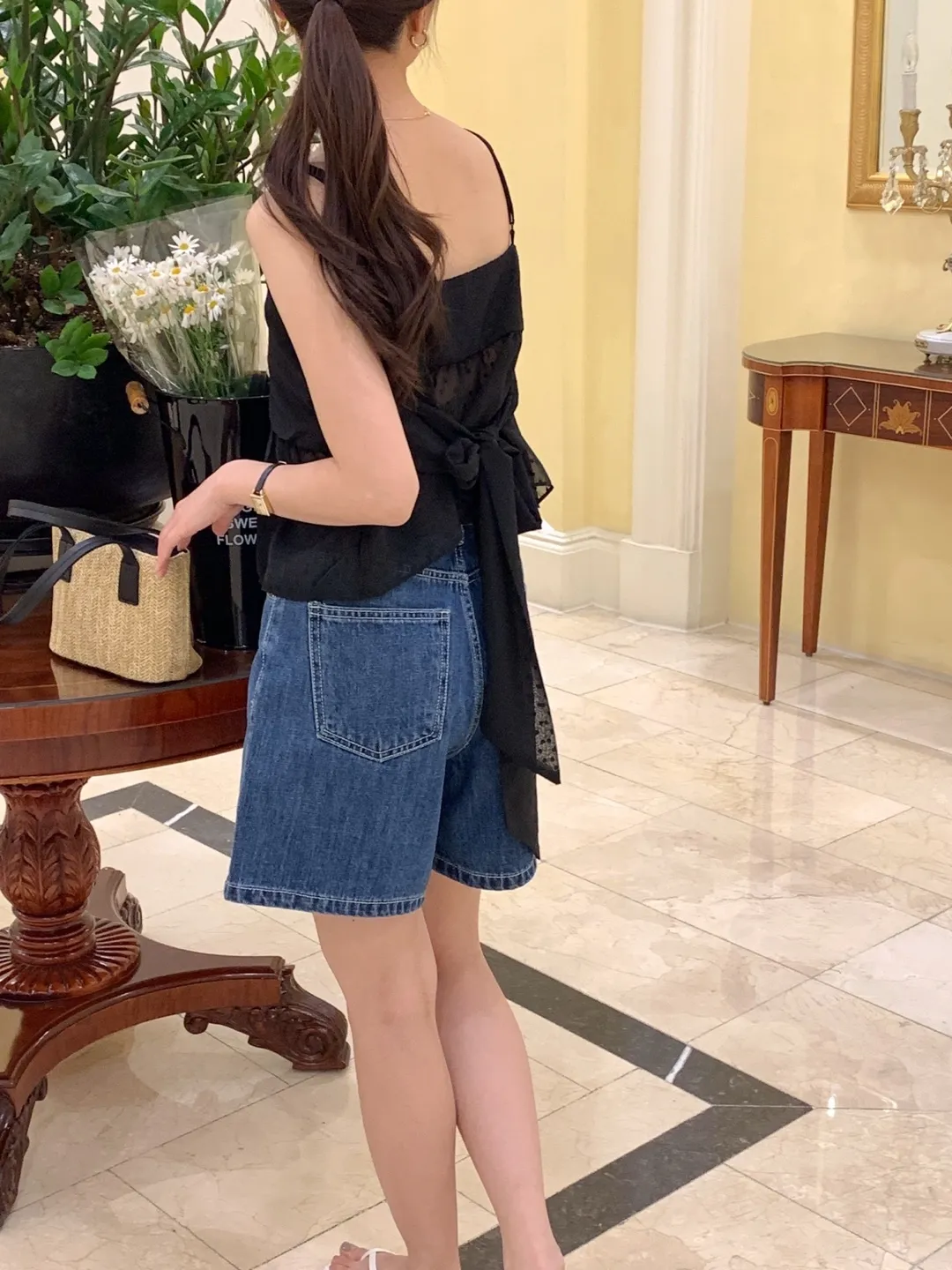 KM572細肩綁帶蝴蝶結小圈圈上衣 米 黑 官網價$820 線上價$790
