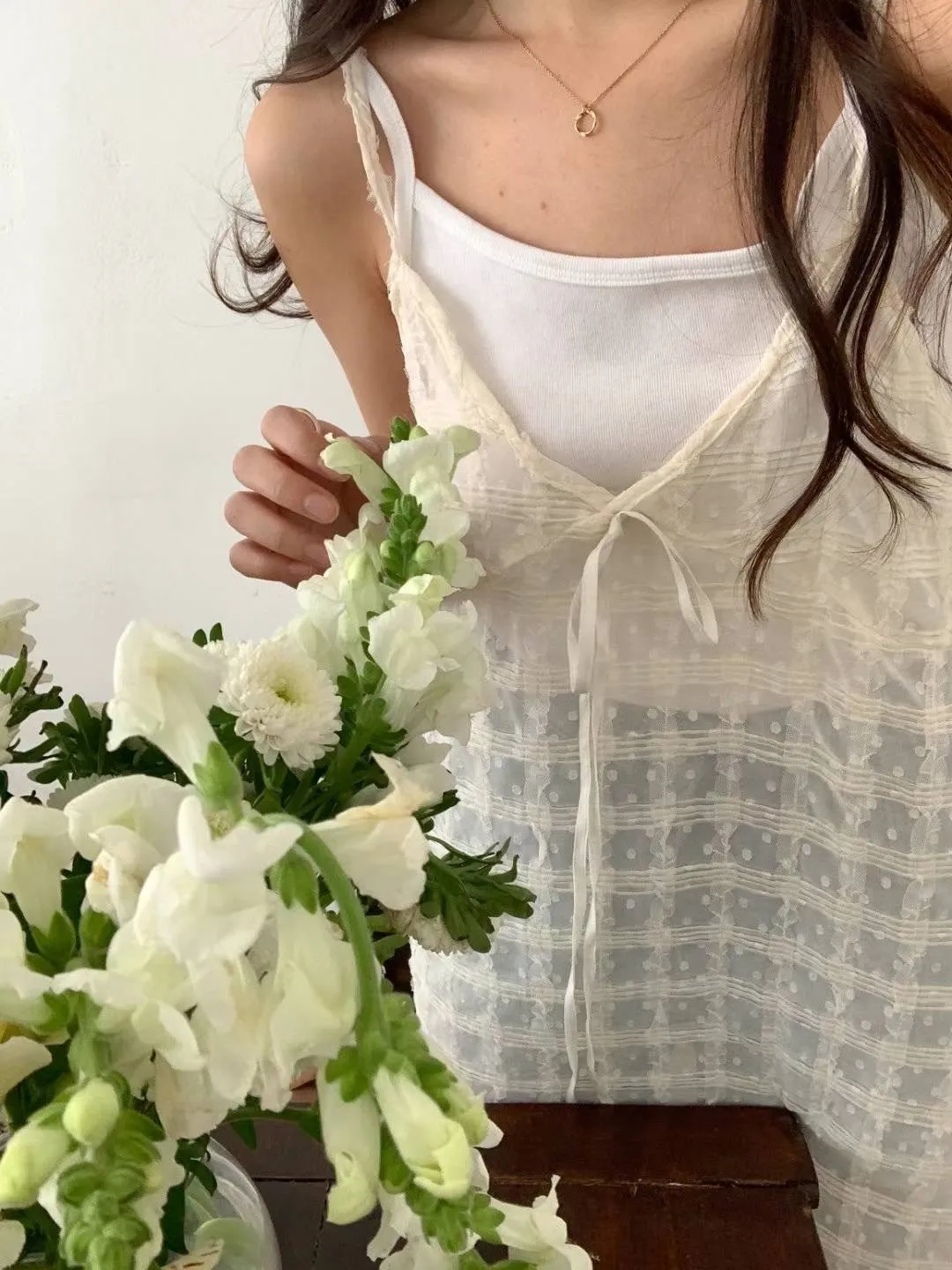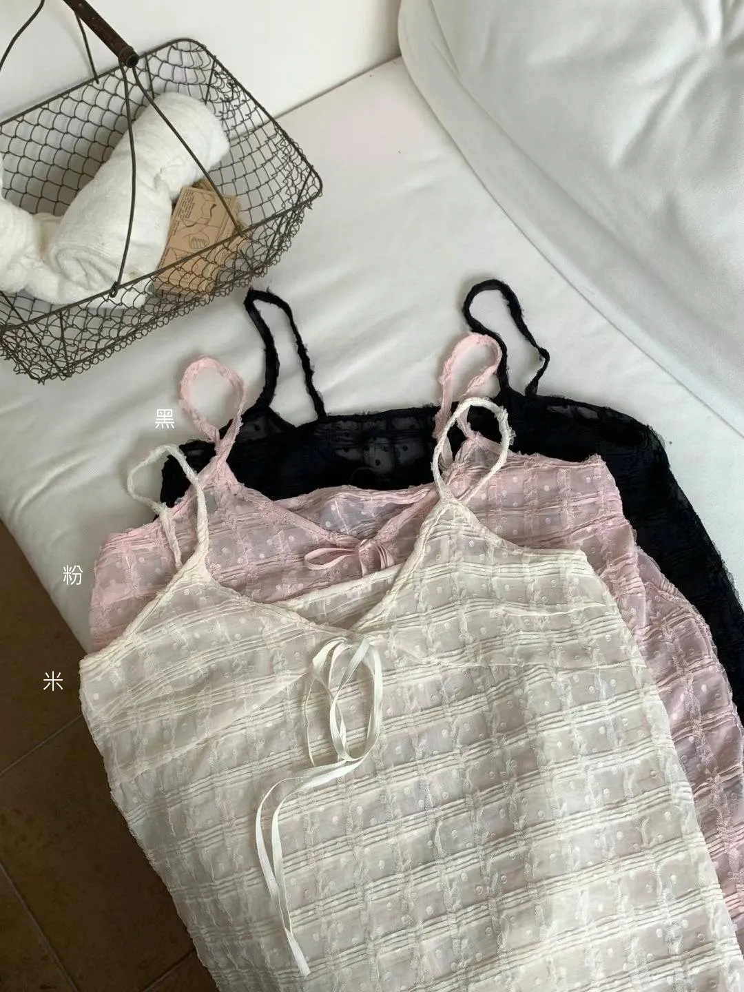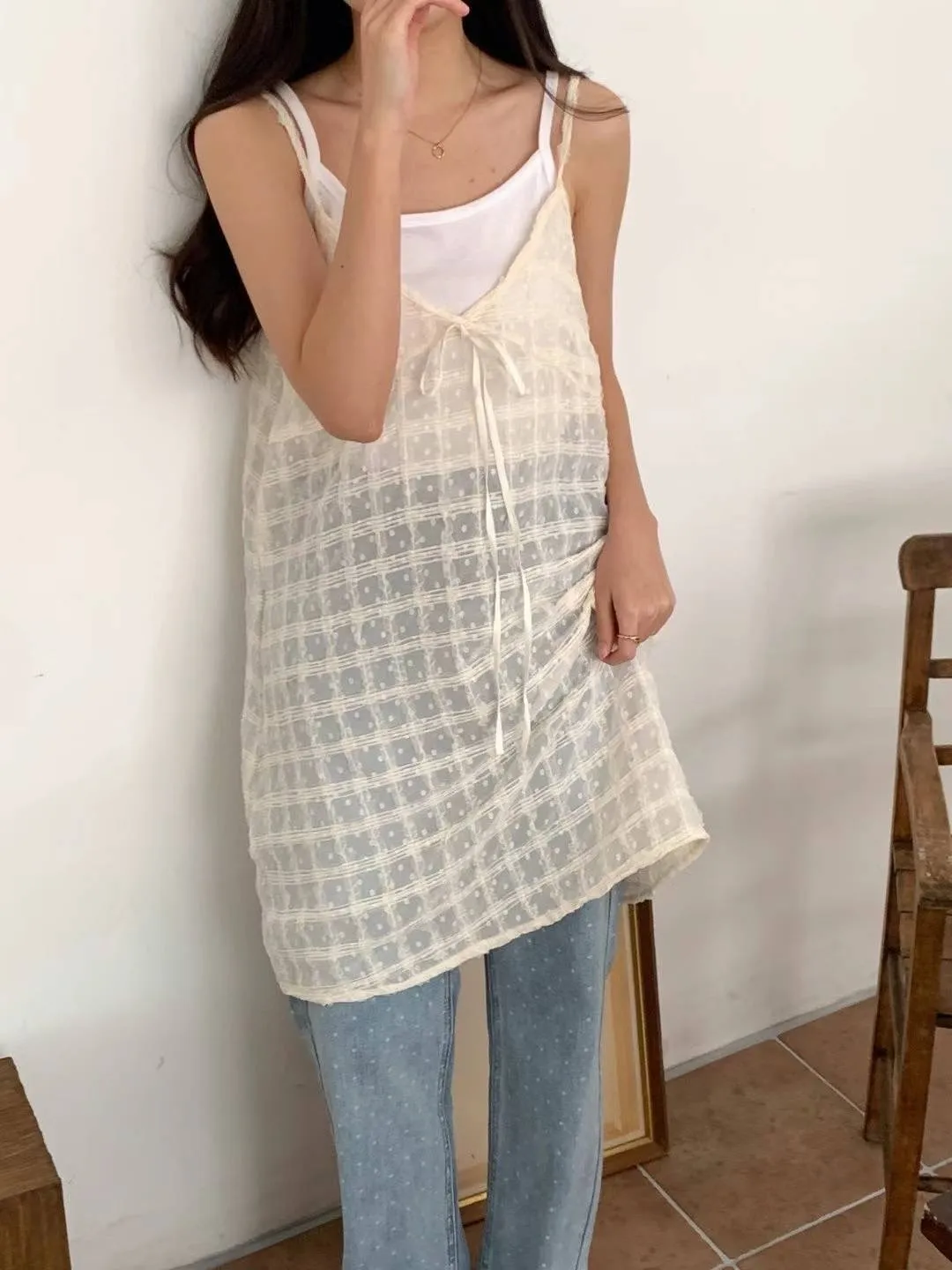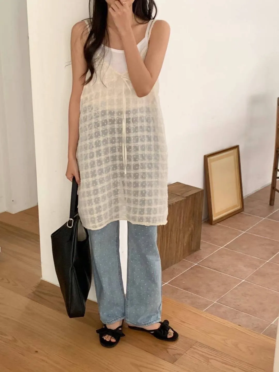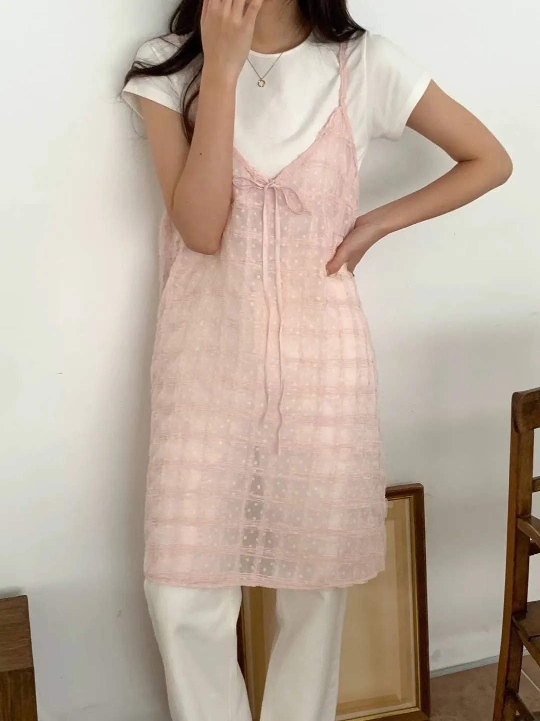 KM576透光格紋細肩帶連身洋裝罩衫 米 粉 黑 官網價$799 線上價$769