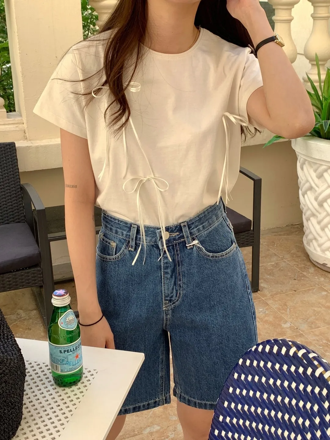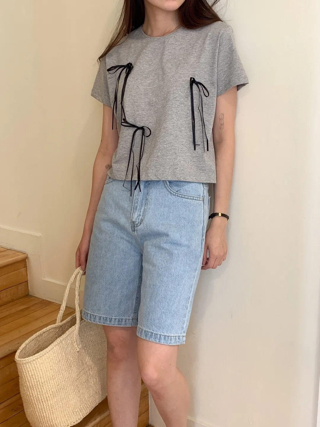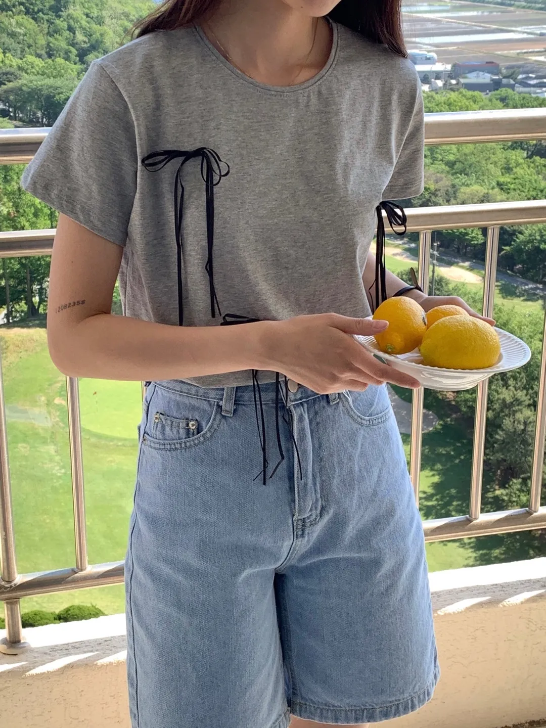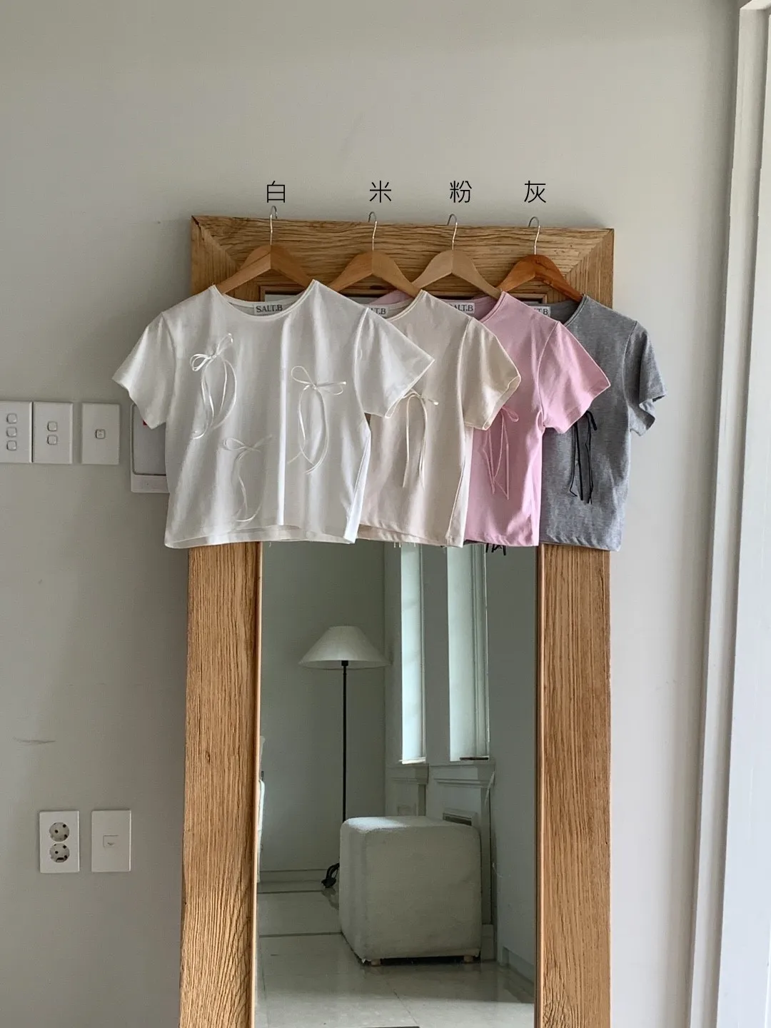 KM585細緞帶蝴蝶結短袖上衣 白 米 粉 灰 官網價$499 線上價$469