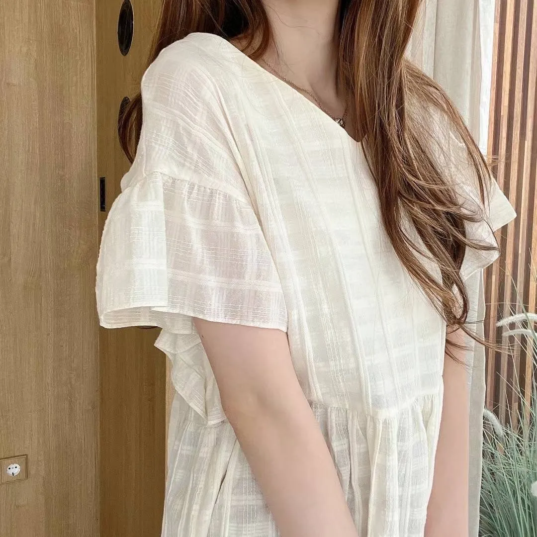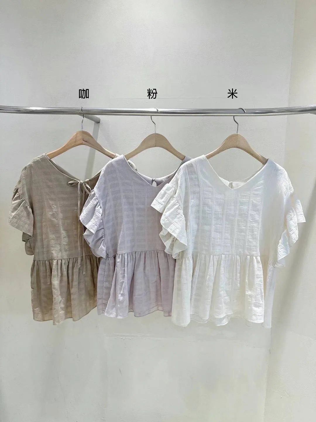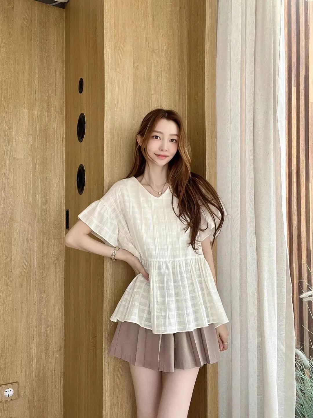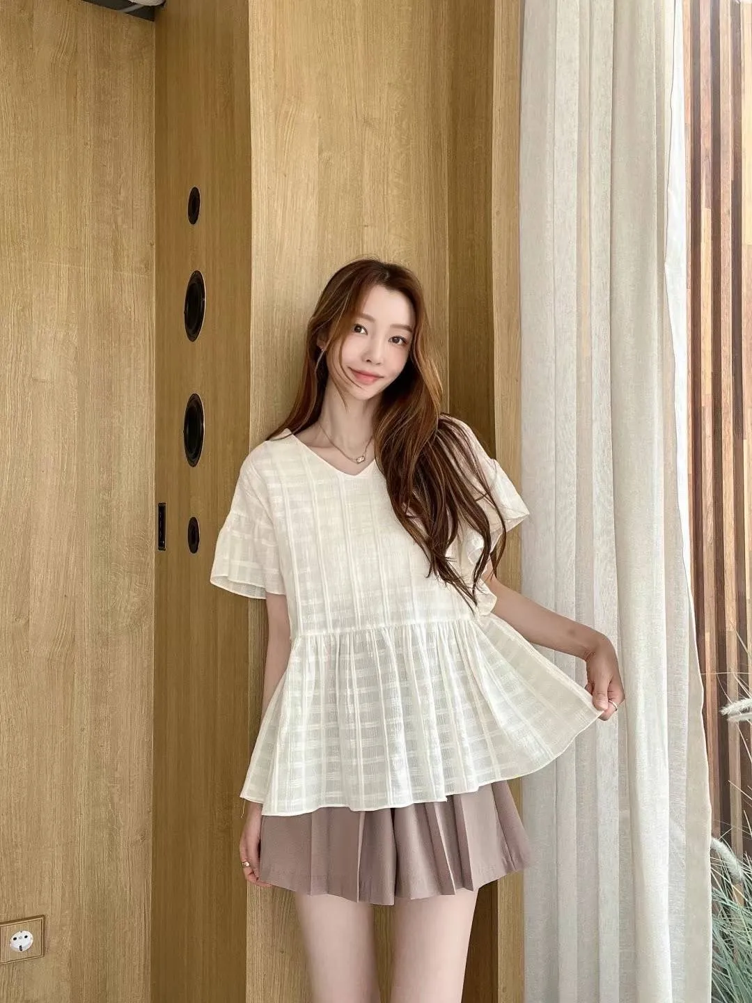 KM615高級飄逸隱約格紋娃娃裝上衣 米 粉 咖 官網價$1090 線上價$1060