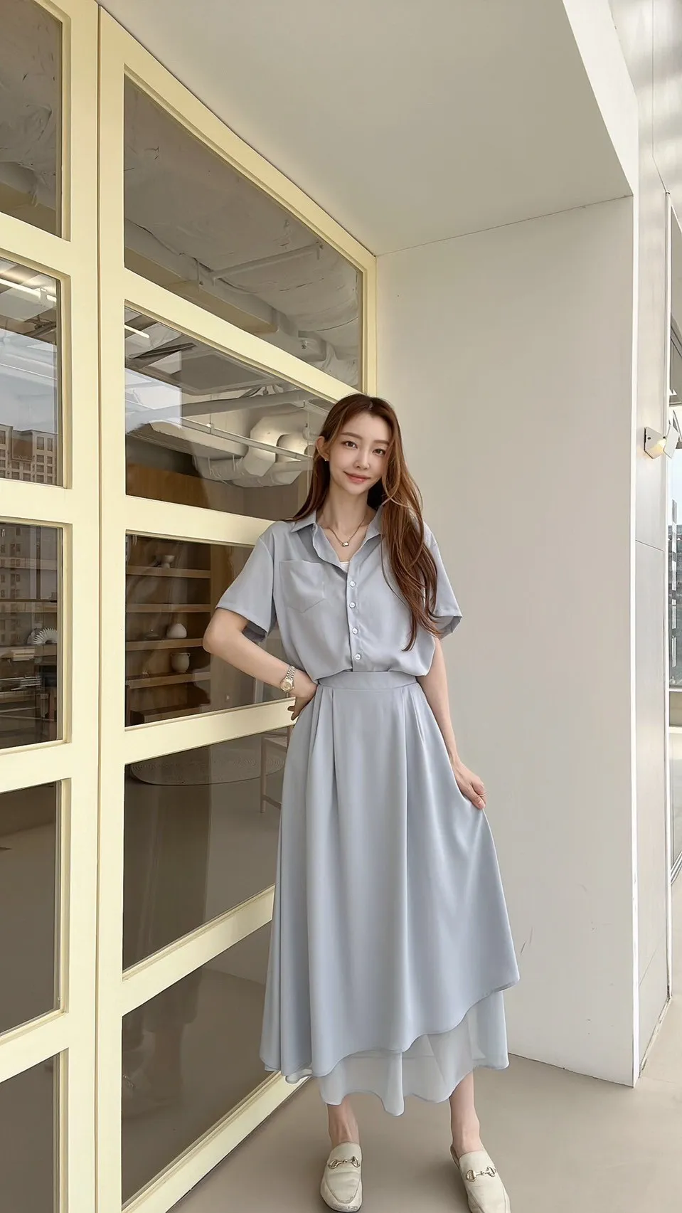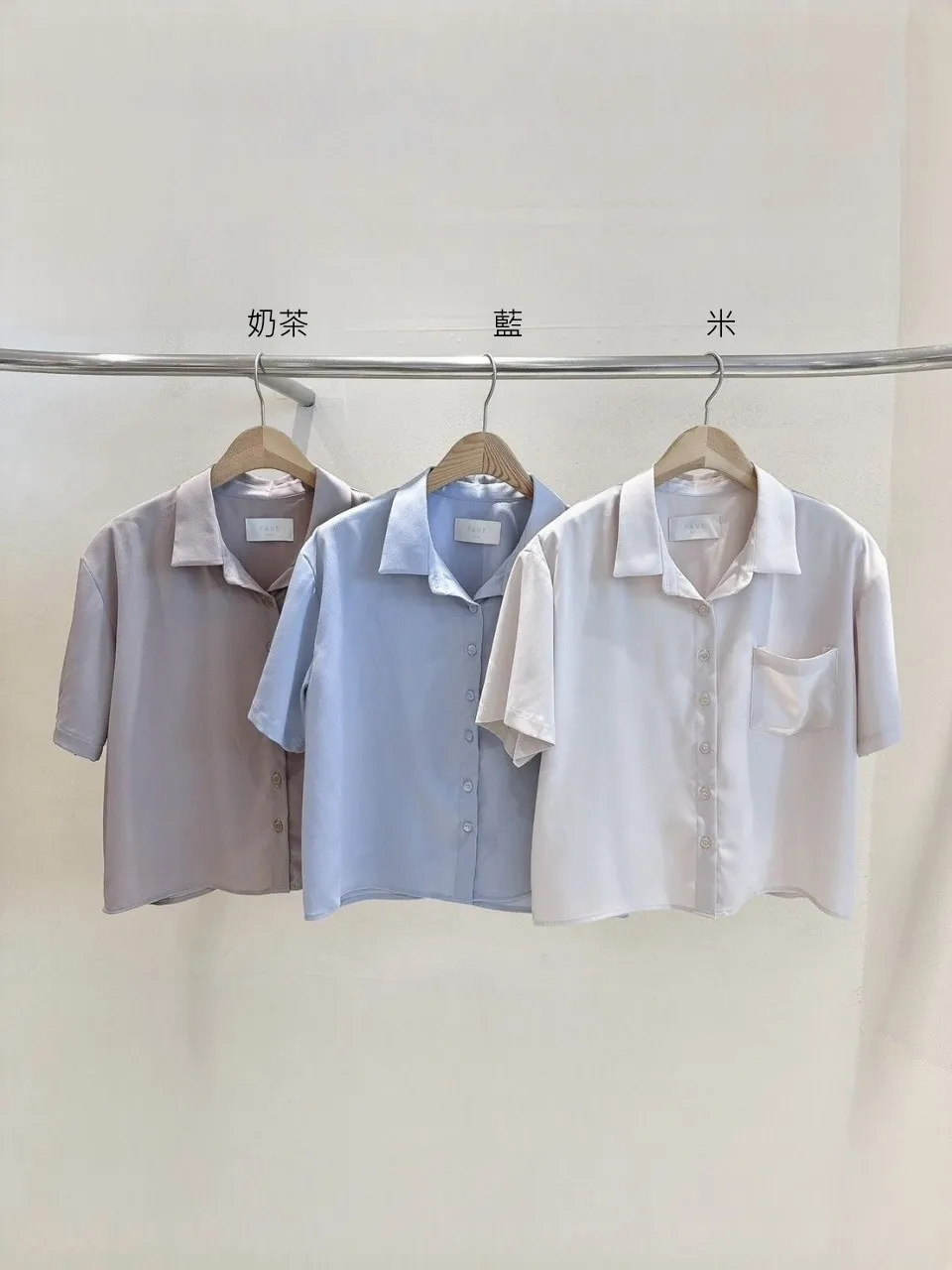 KM618套裝的推薦款質感單口袋短版襯衫 米 藍 奶茶 官網價$899 線上價$869雪紡,質感視覺 輕盈薄款 貝殼釦 短版好比例