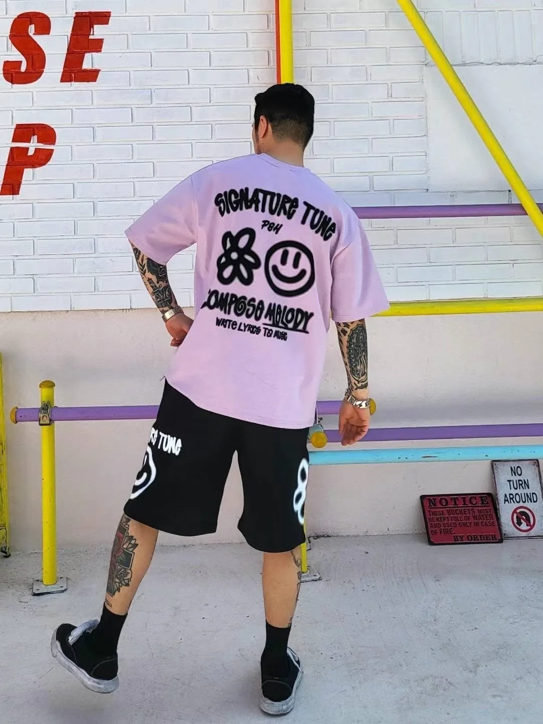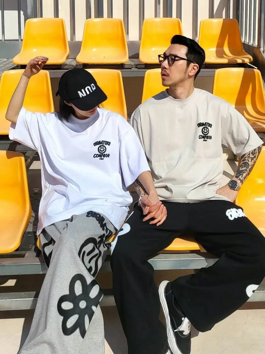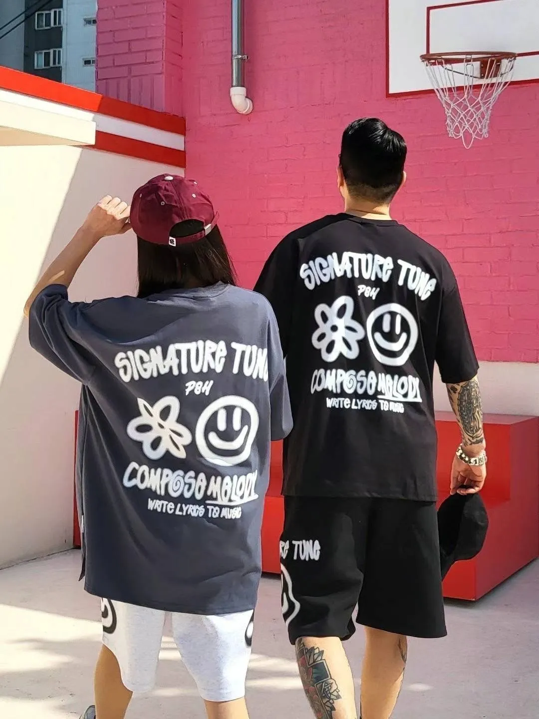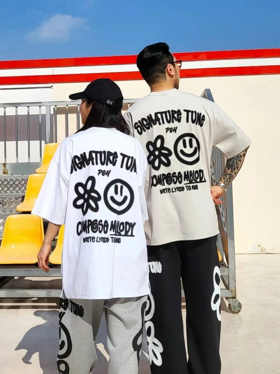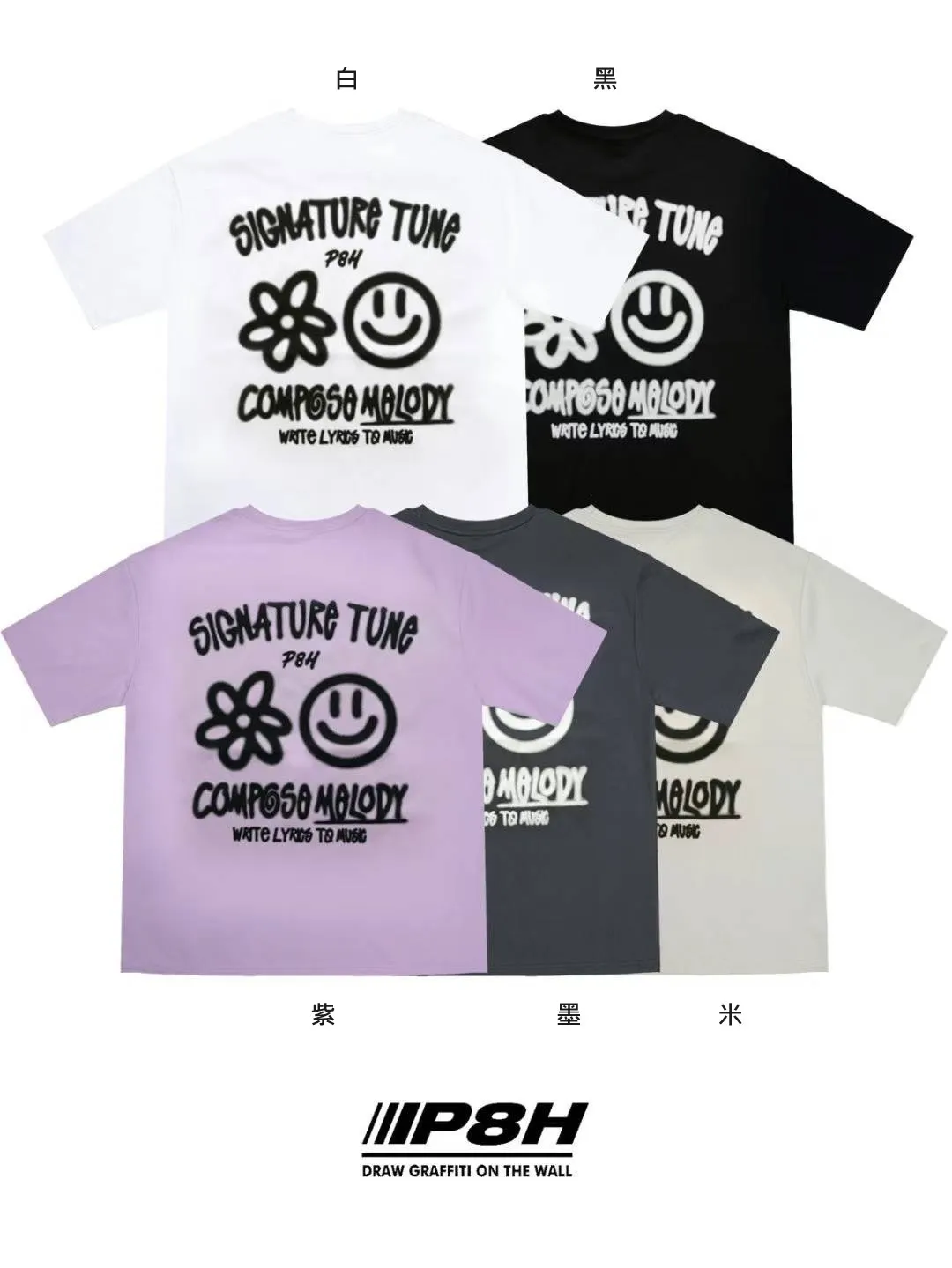 KM639潮流小花笑臉韓風Tshirt 白 黑 墨 米 紫 官網價$580 線上價$550