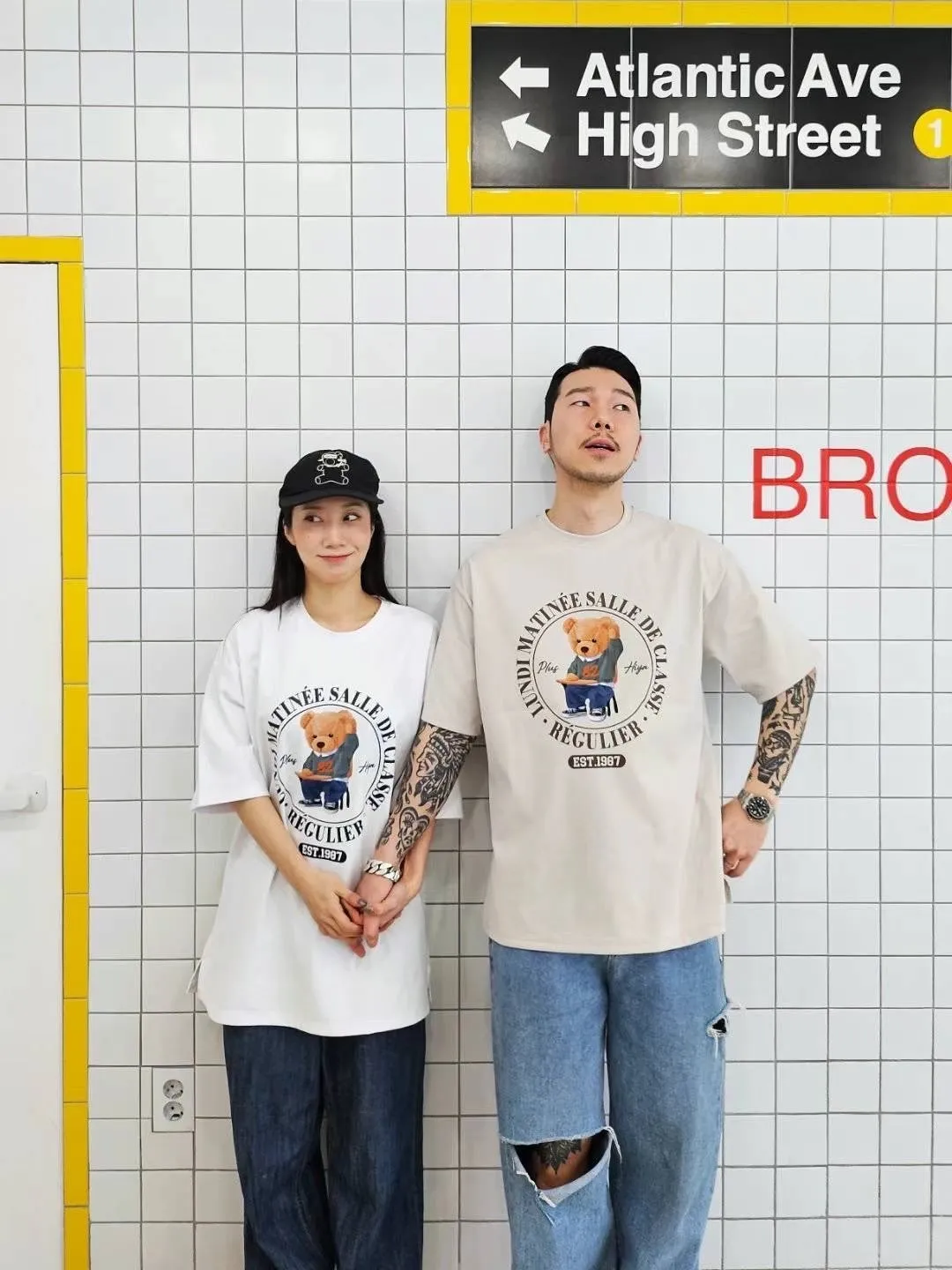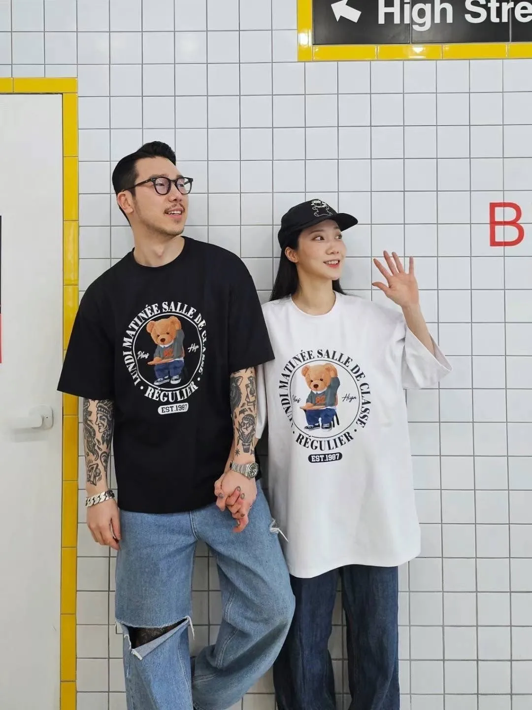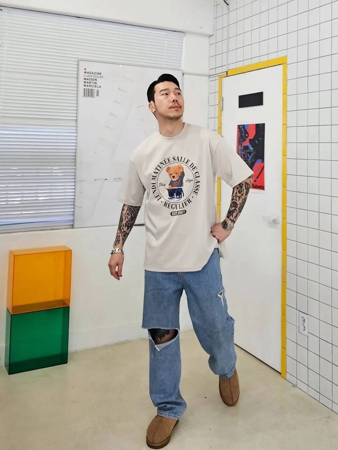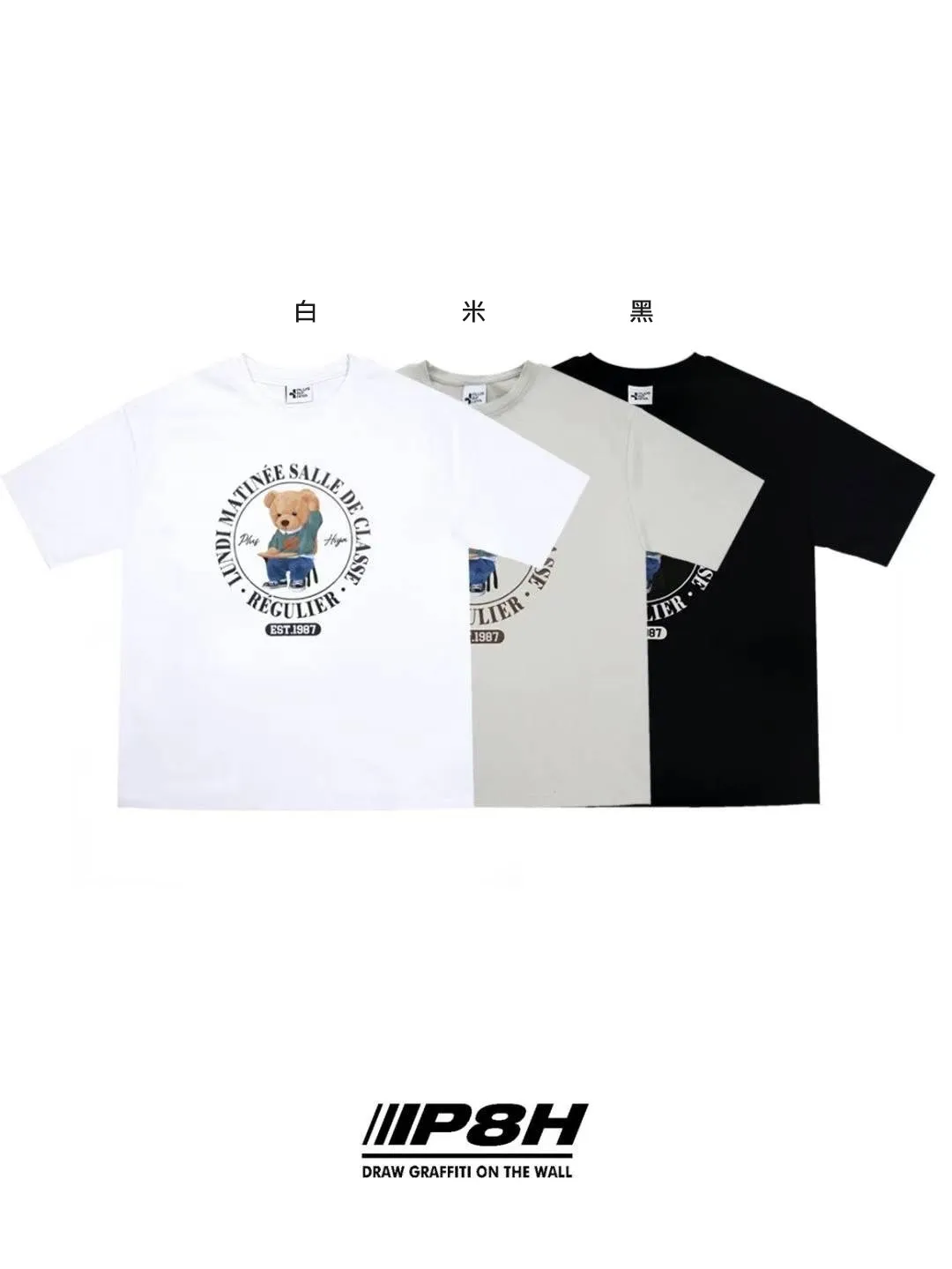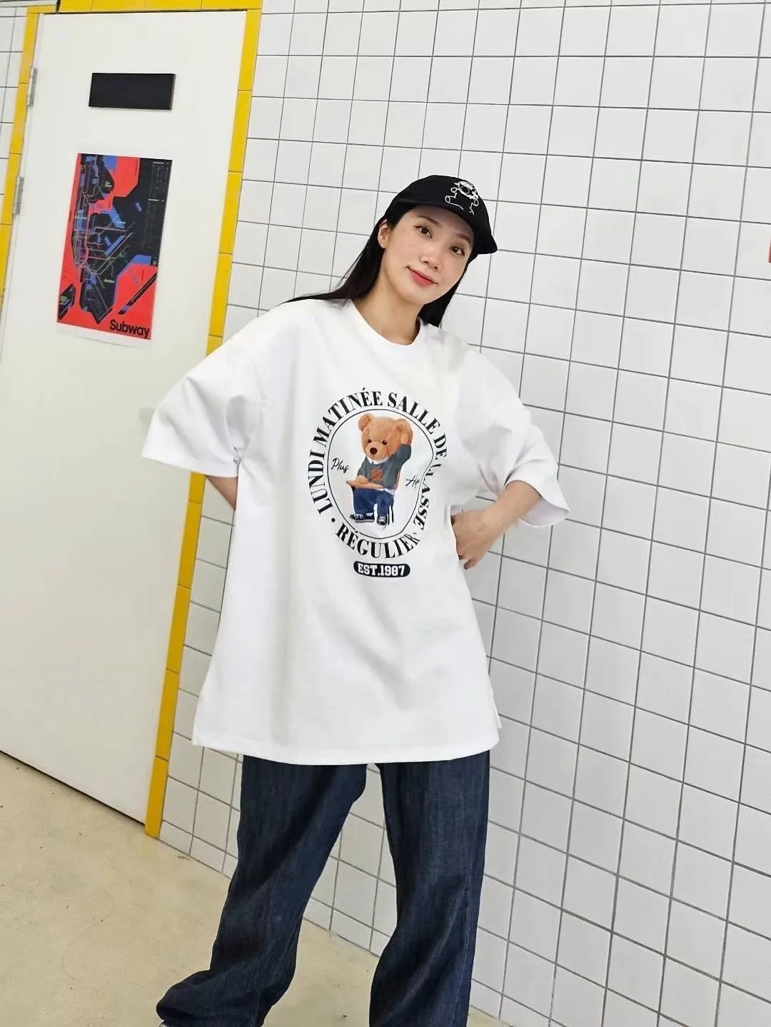 KM645可愛舉手牛仔褲熊熊Tshirt 白 米 黑 官網價$629 線上價$599
