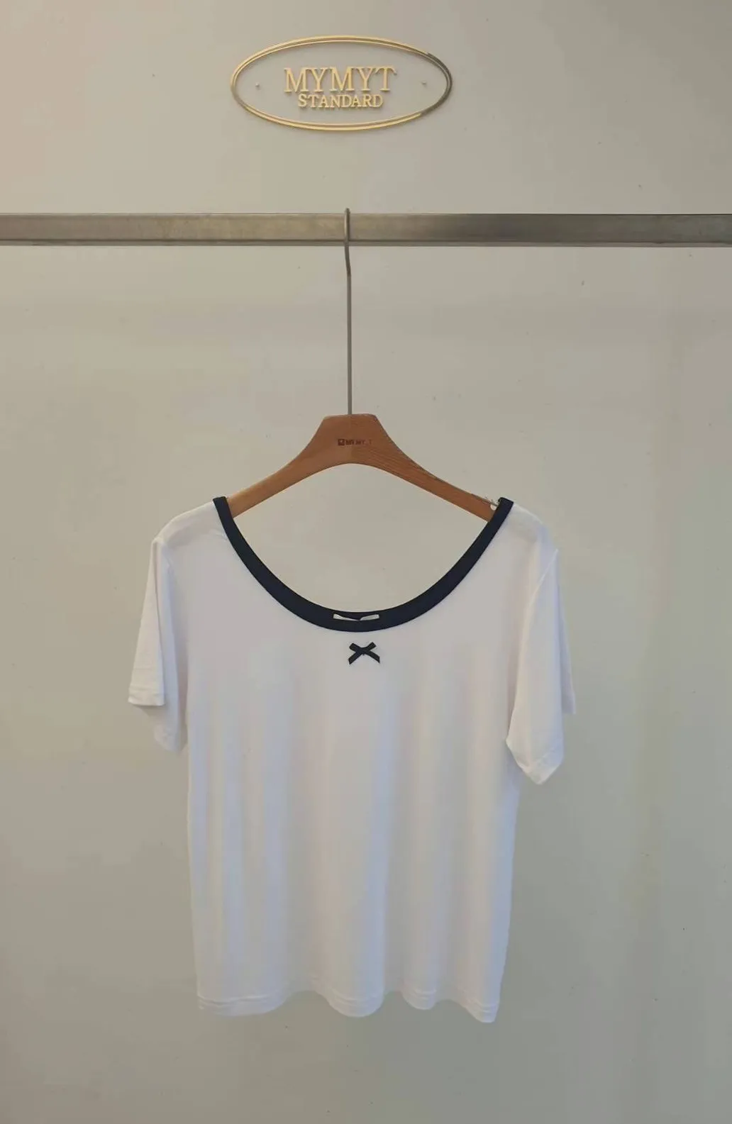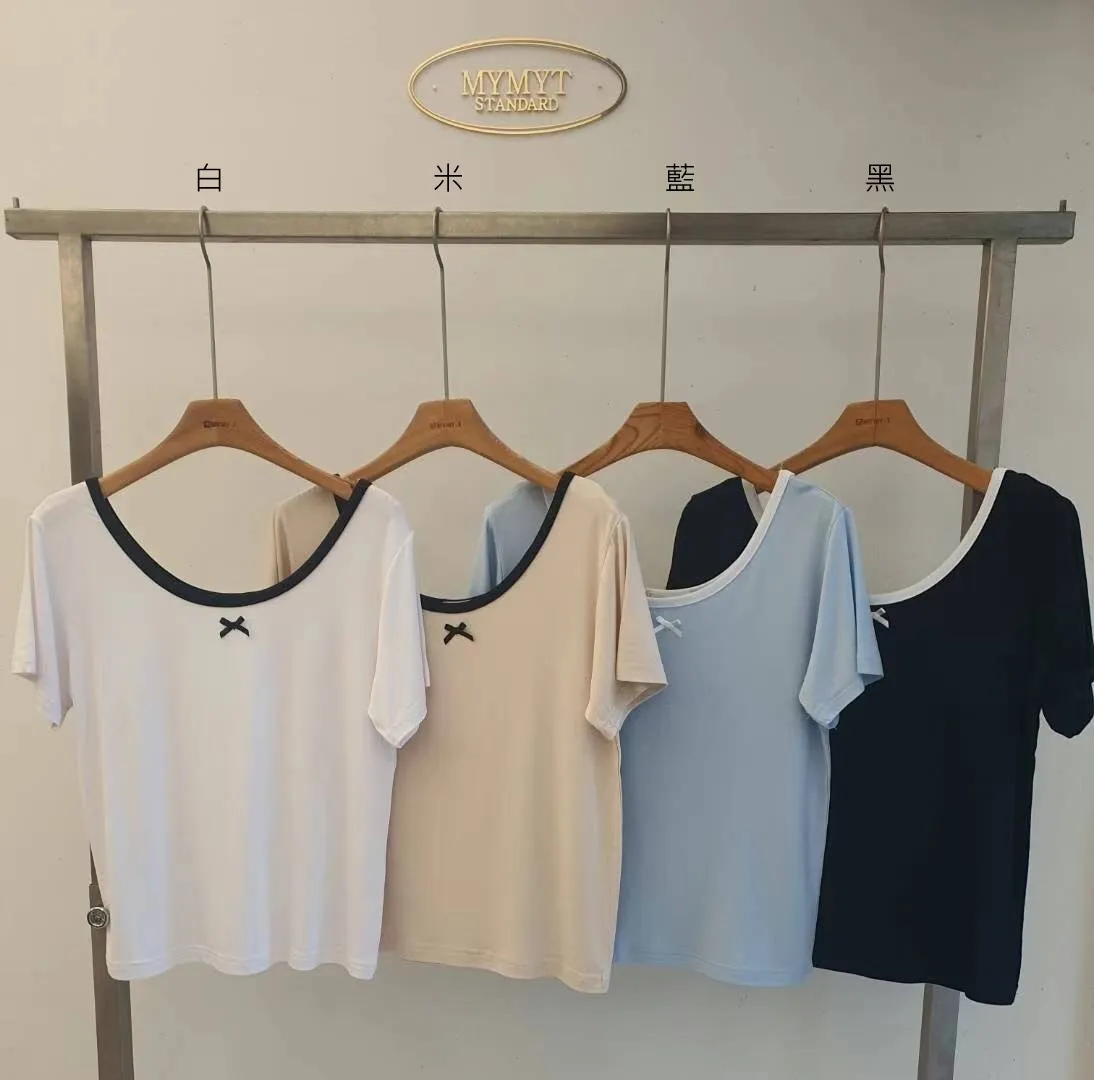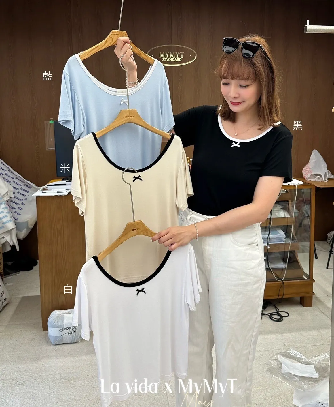 KM668推薦款小小蝴蝶結U領滾邊Tshirt 白 米 藍 黑 官網價$229 線上價$199