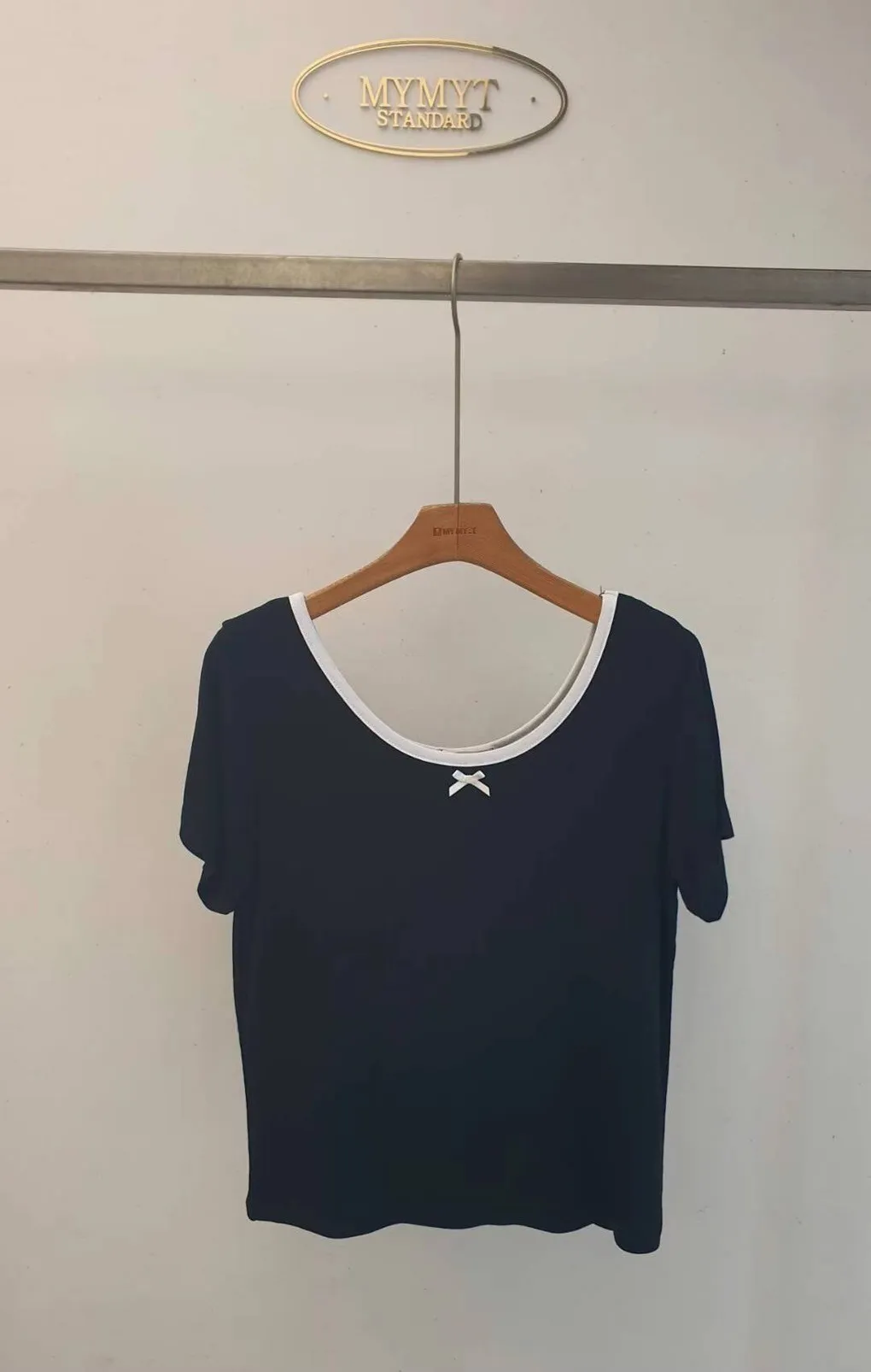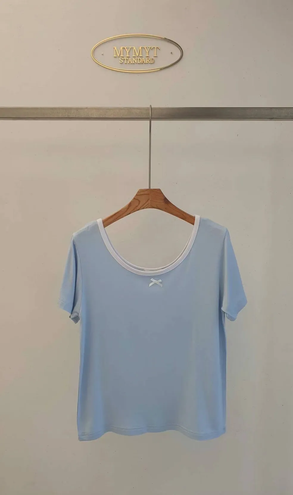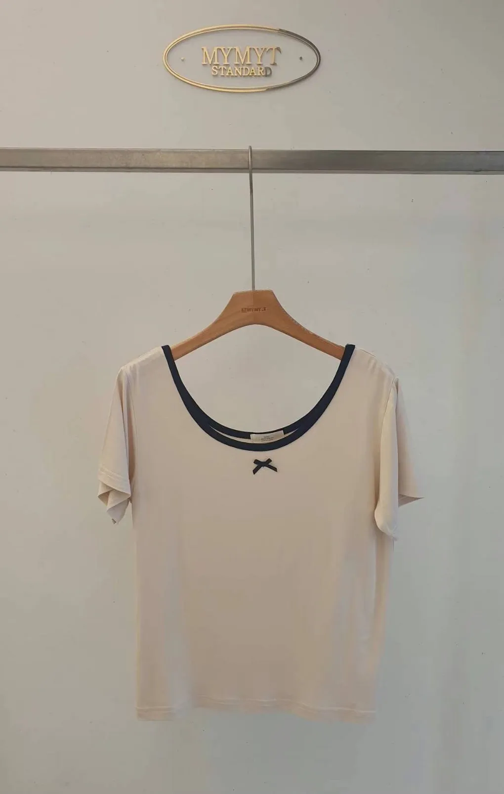 KM668推薦款小小蝴蝶結U領滾邊Tshirt 白 米 藍 黑 官網價$229 線上價$199