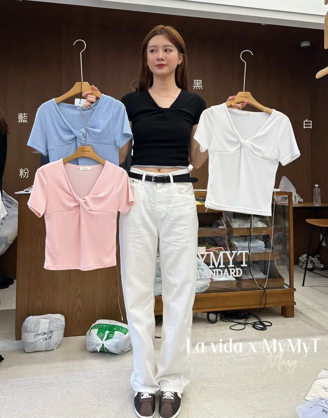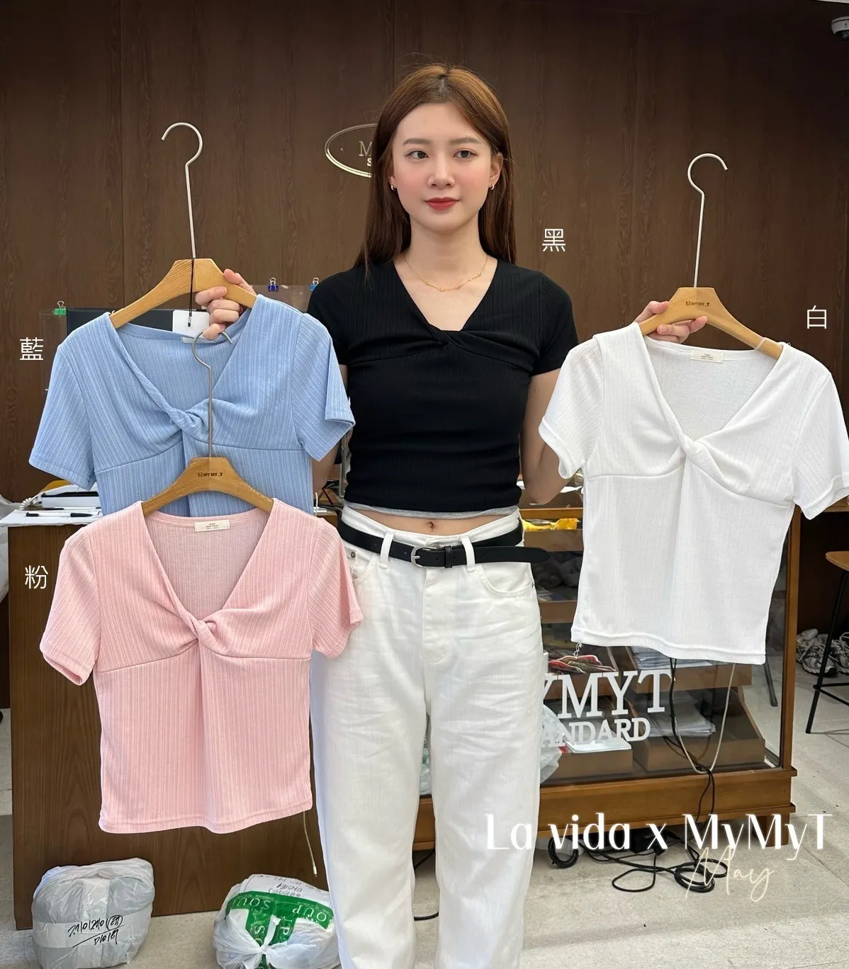 KM669推薦款V領扭結上衣 白 粉 藍 黑 官網價$240 線上價$210