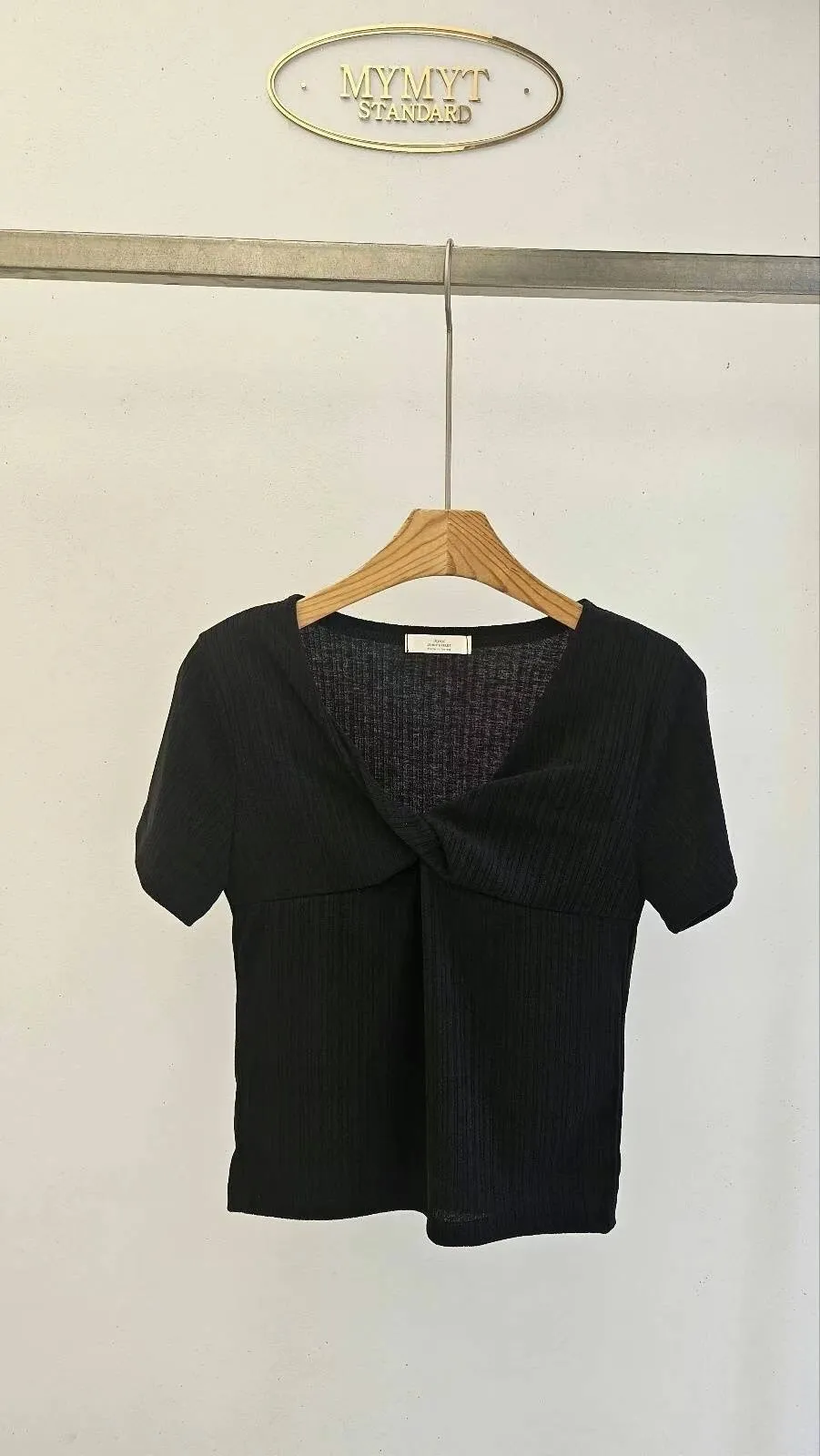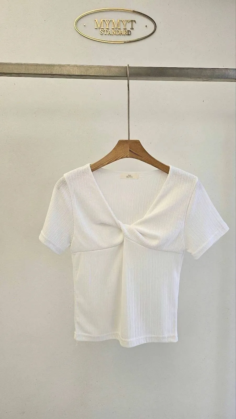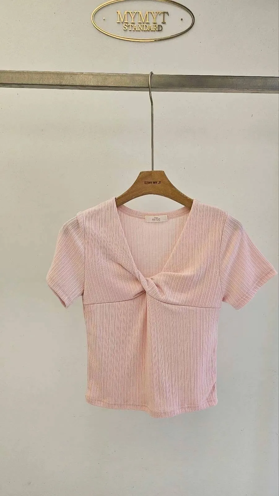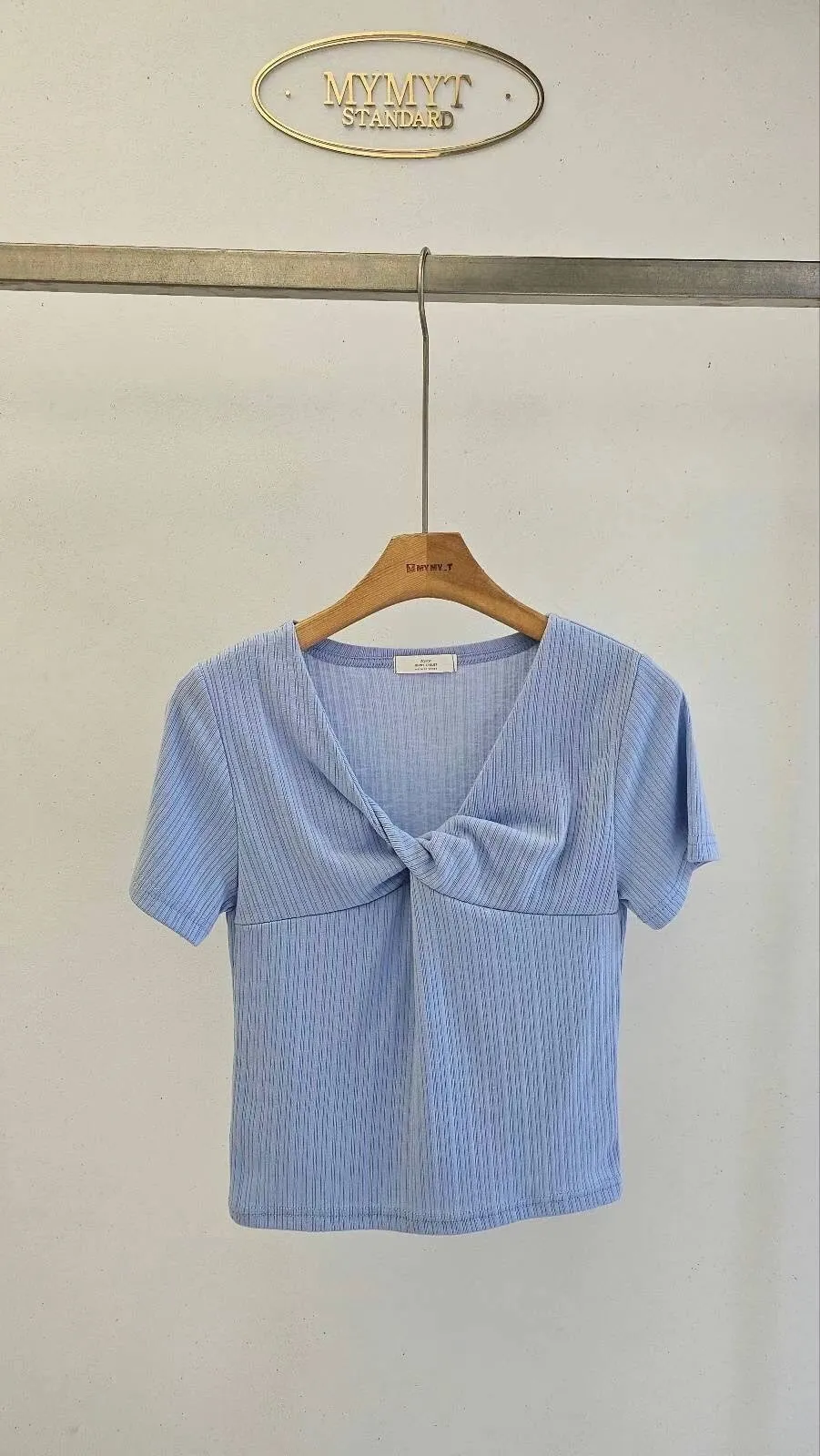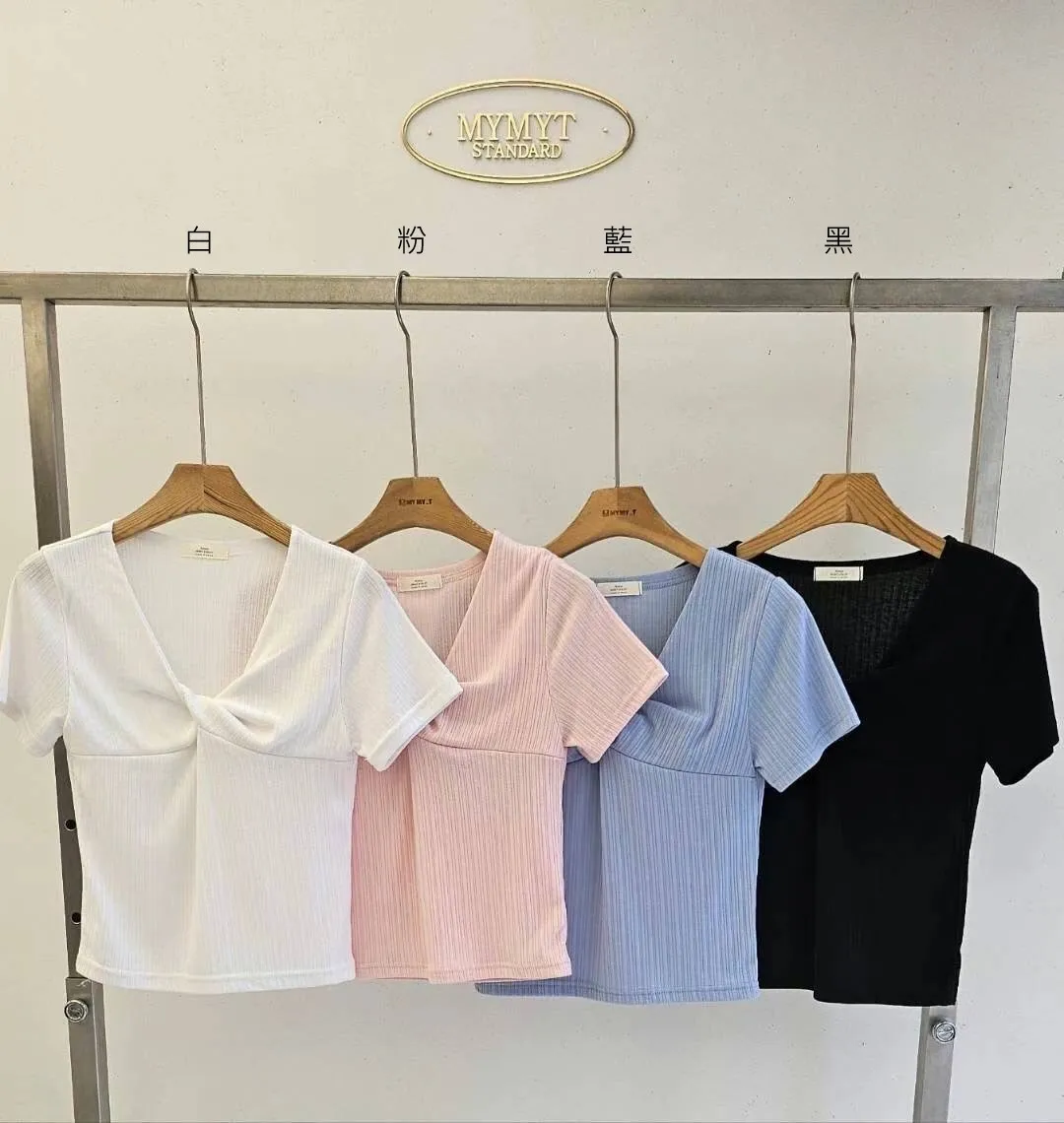 KM669推薦款V領扭結上衣 白 粉 藍 黑 官網價$240 線上價$210棉 推薦款 細緻透薄針織坑條紋理 彈性佳 合身修飾 簡單好看