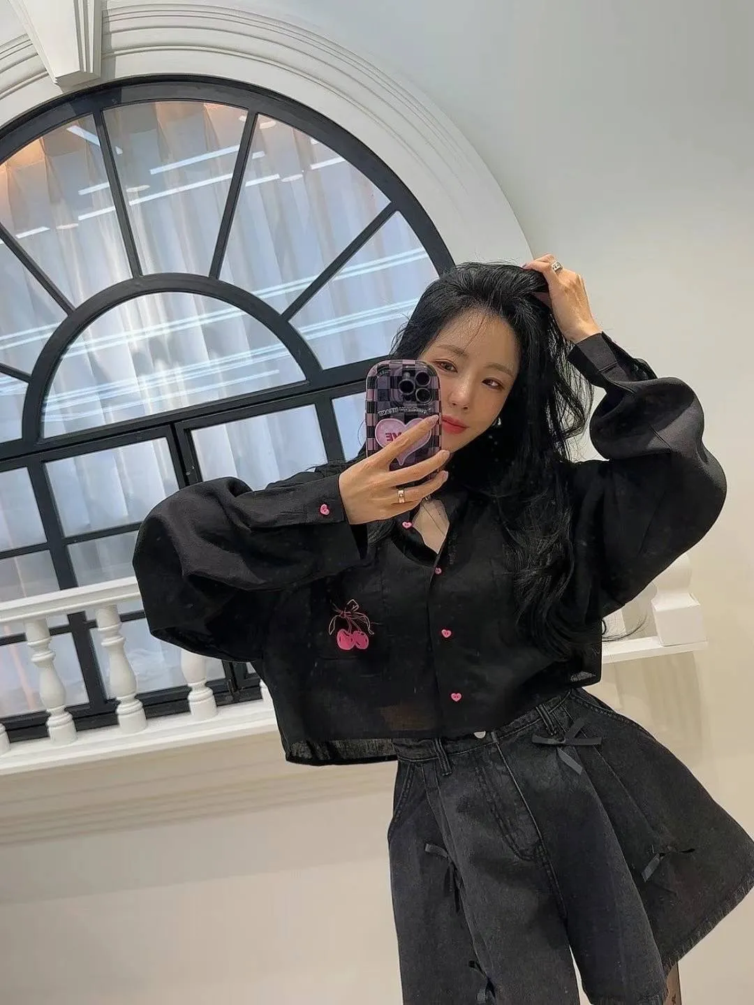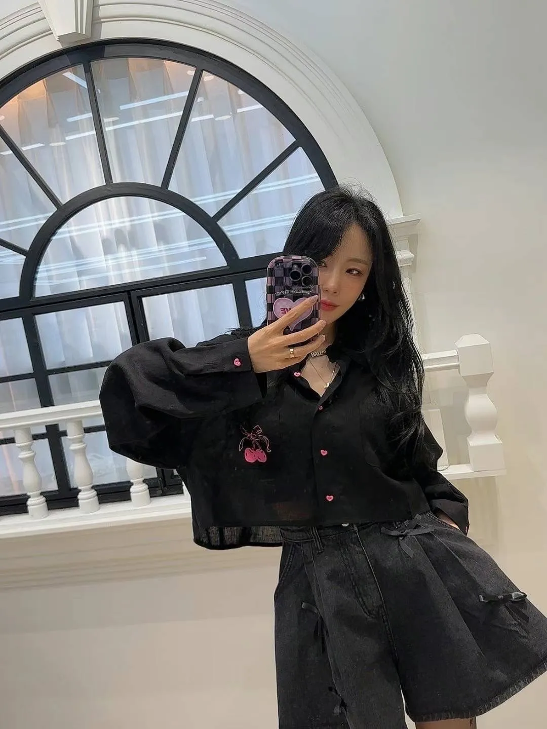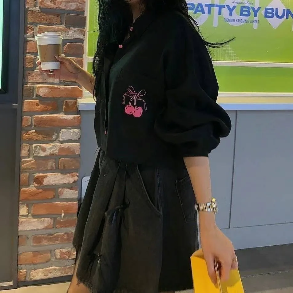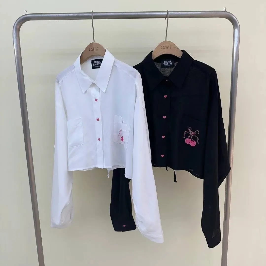 KM736粉紅愛心釦櫻桃襯衫 白 黑 官網價$970 線上價$940