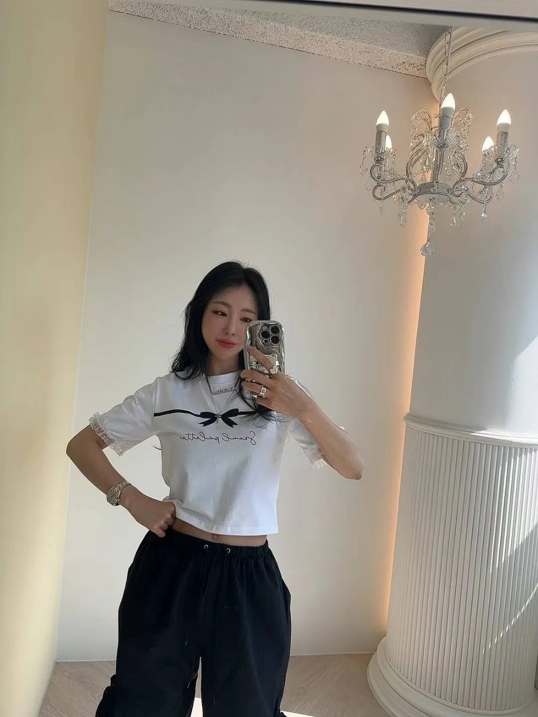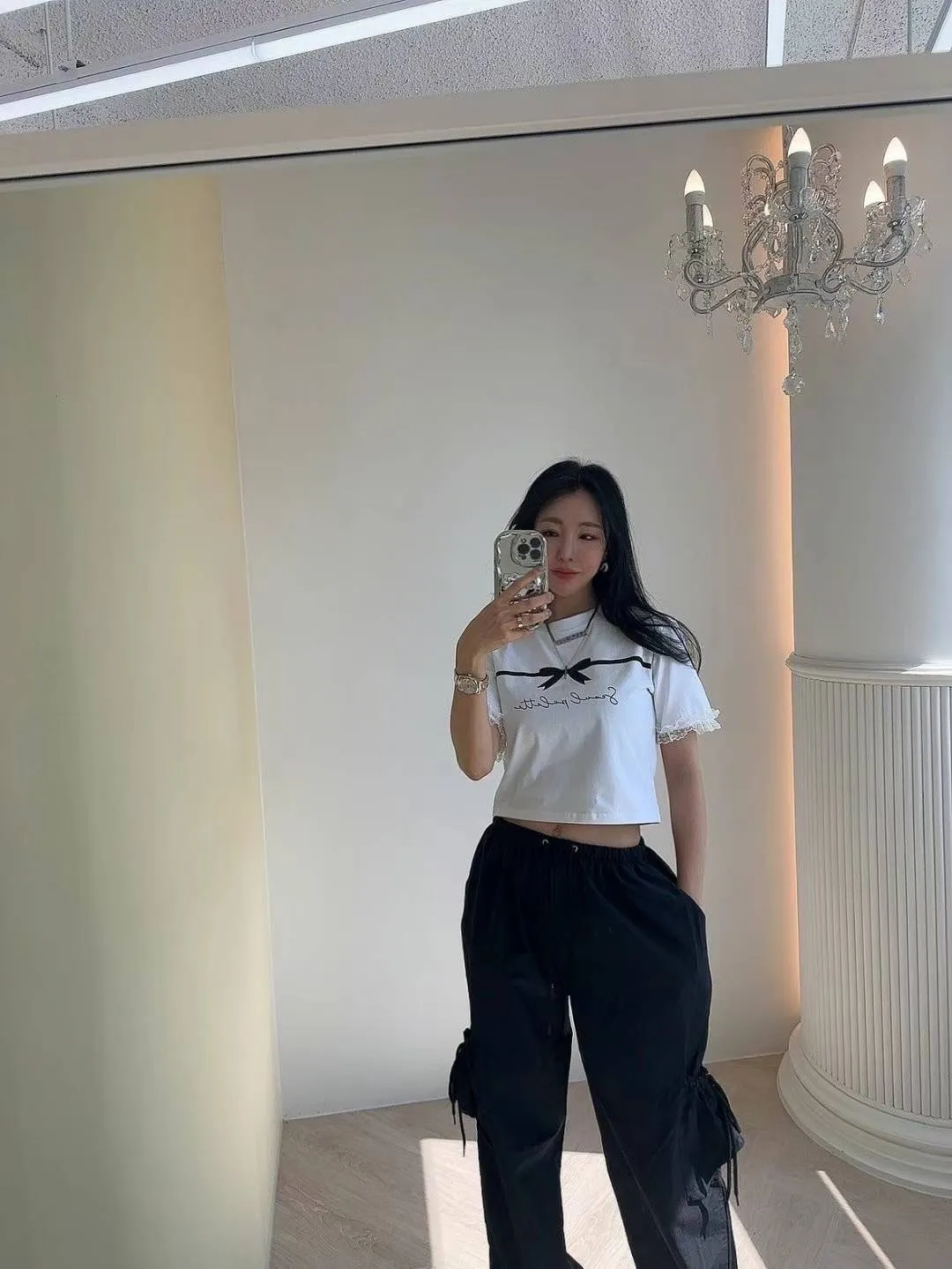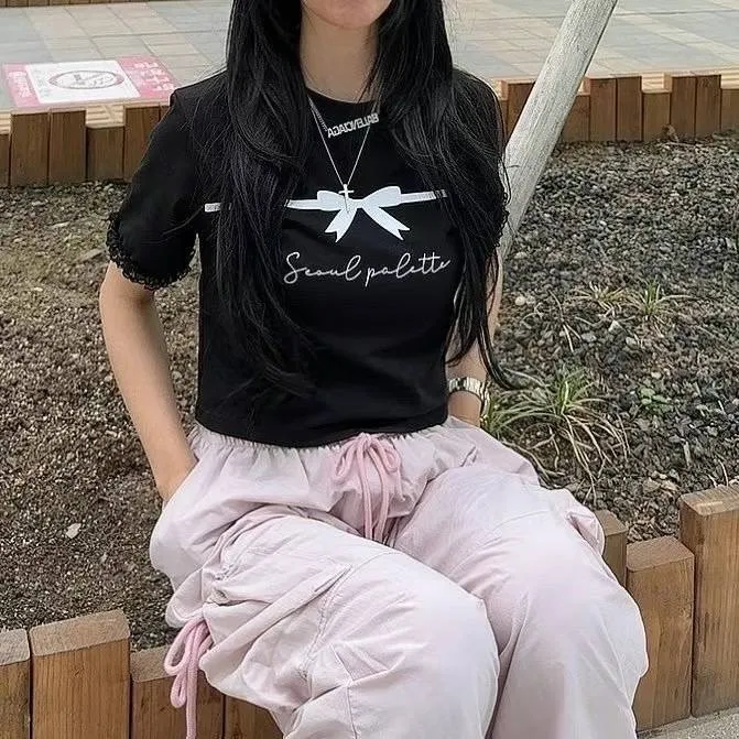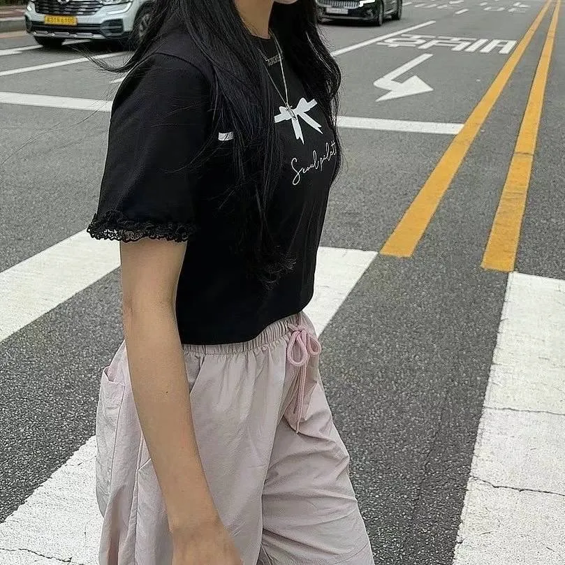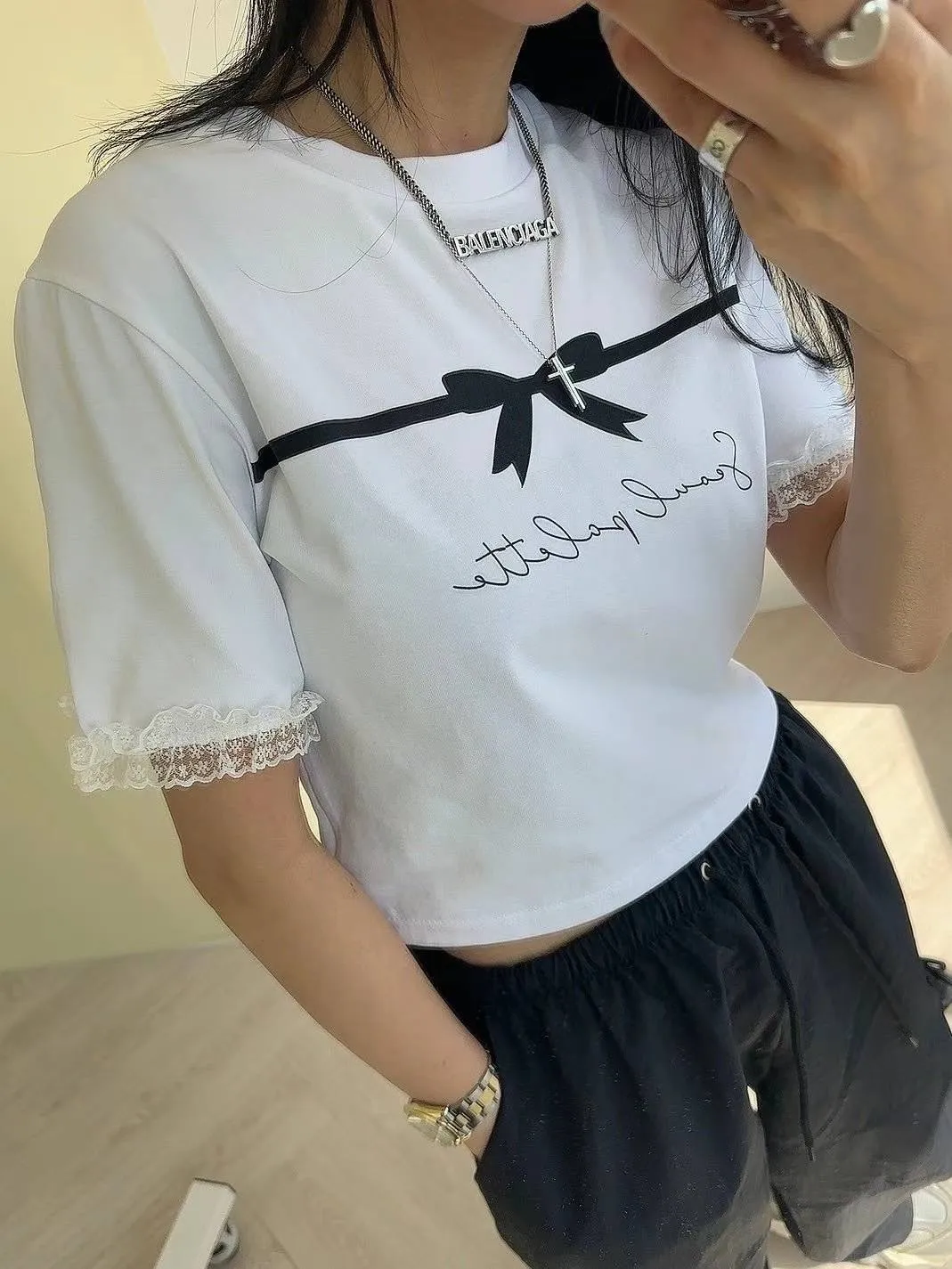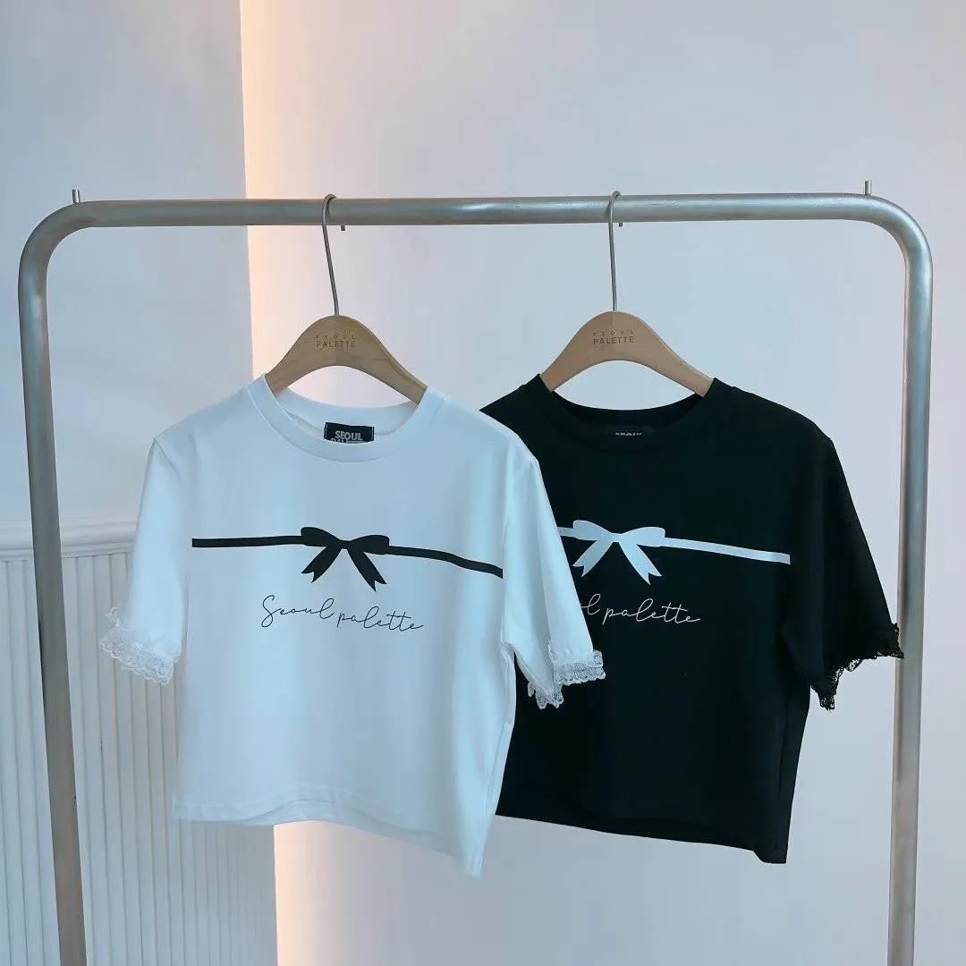 KM742冰絲棉蝴蝶結美袖蕾絲上衣 白 黑 官網價$620 線上價$590