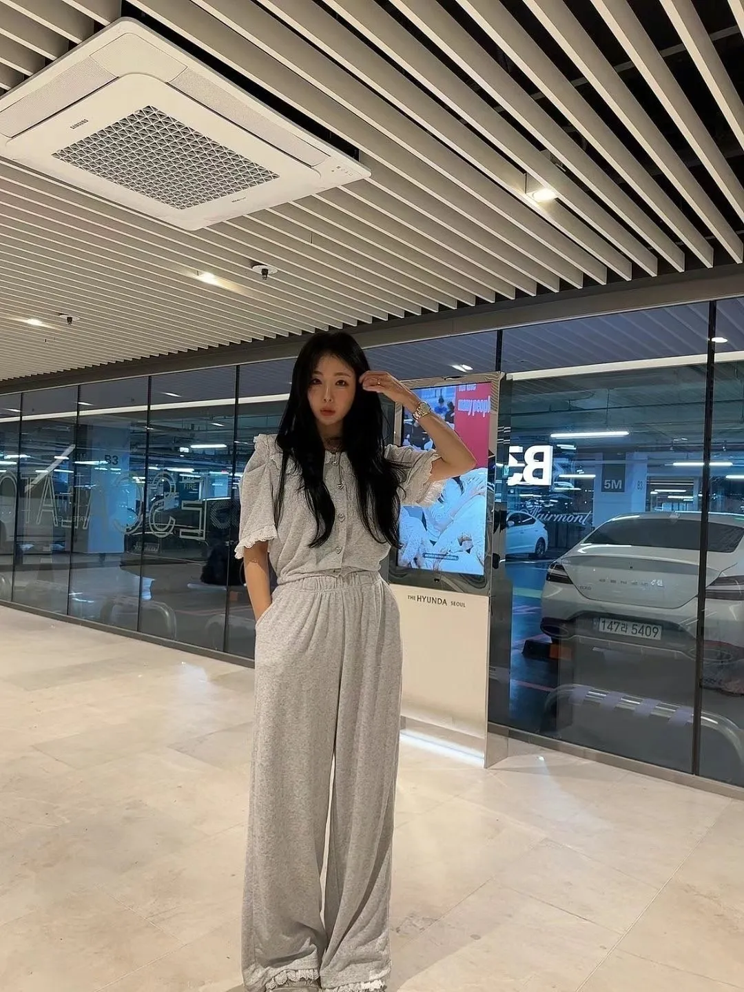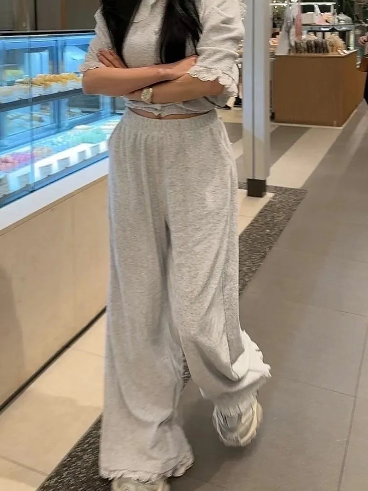 KM755套裝的蕾絲褲管鑲邊長褲 灰 藍 官網價$990 線上價$960
