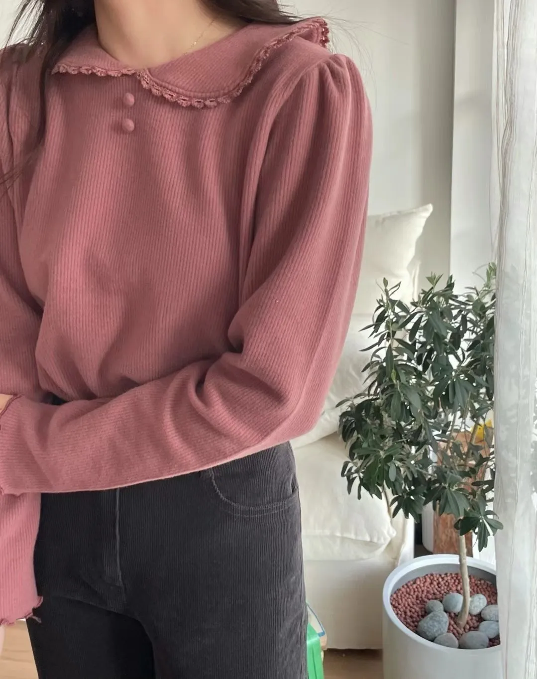 LV1013蕾絲滾邊翻領雙釦上衣 白 粉 官網價$770 永恆甜甜價$740