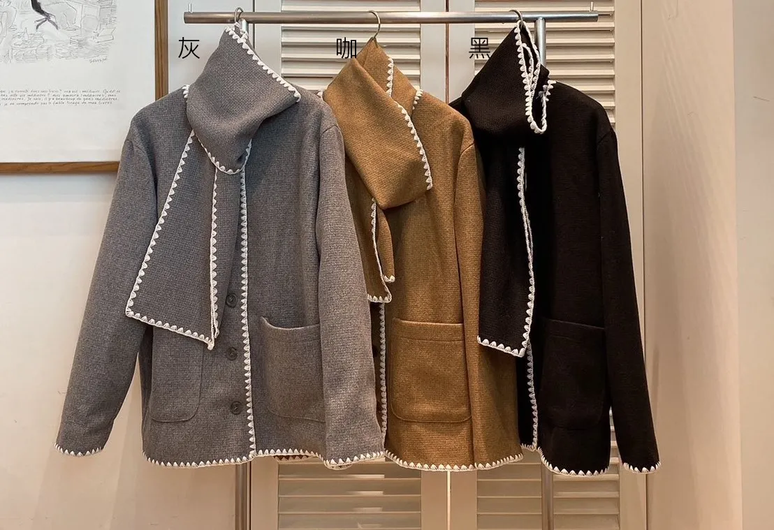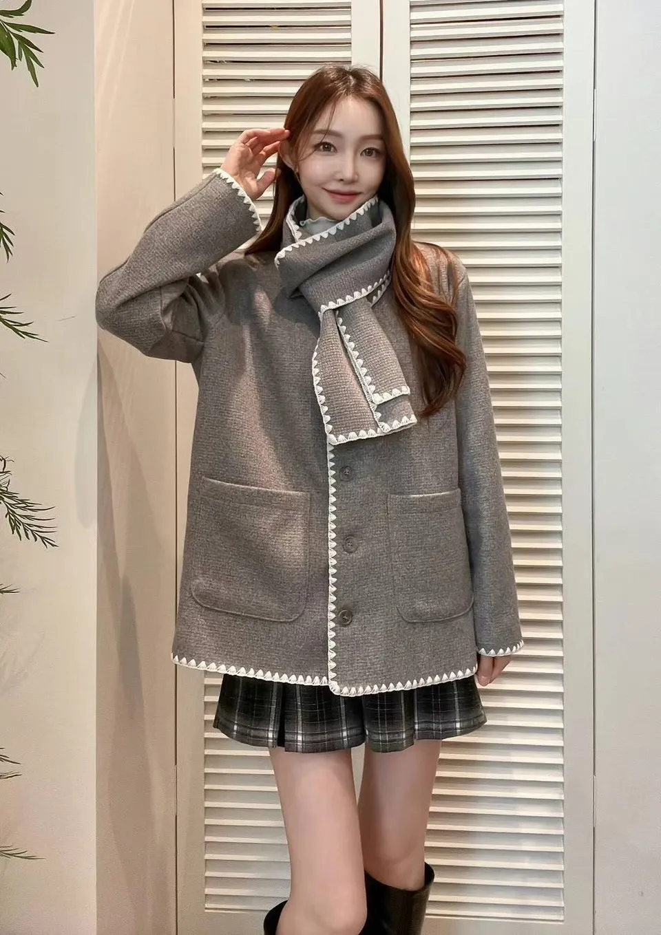 LV1040華夫格跳色線編織外套(附圍巾) 黑 灰 咖 官網價$2190 線上價$2160