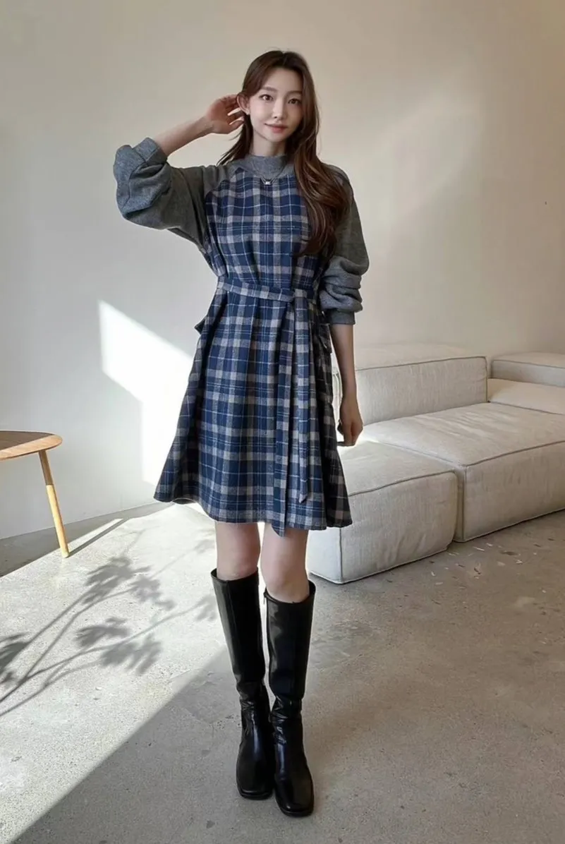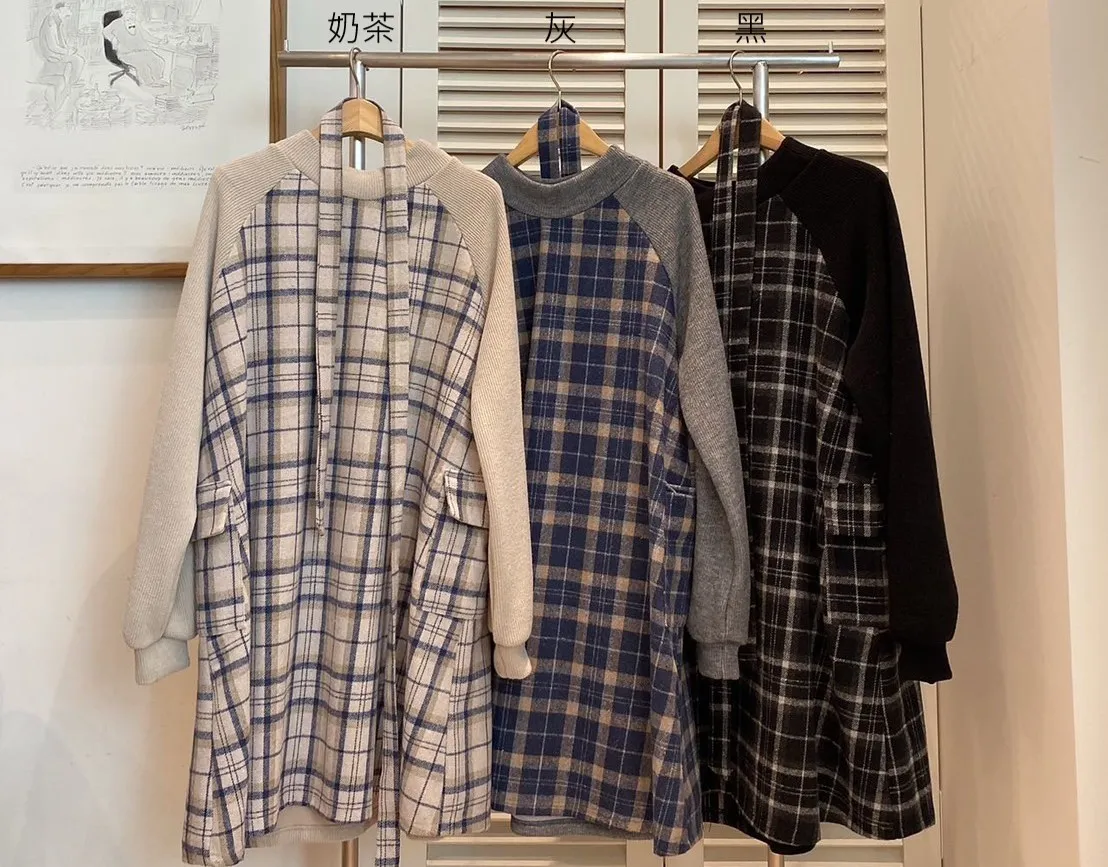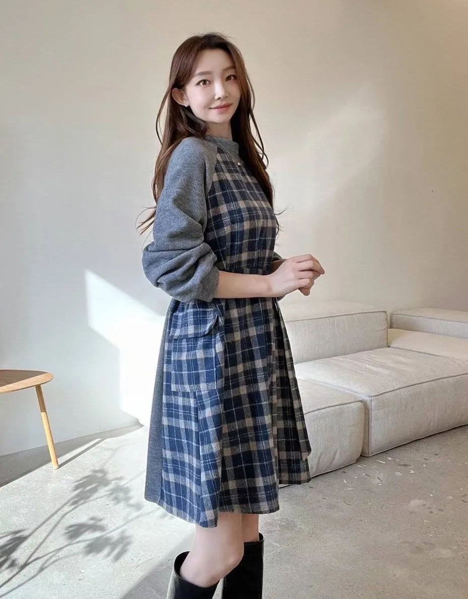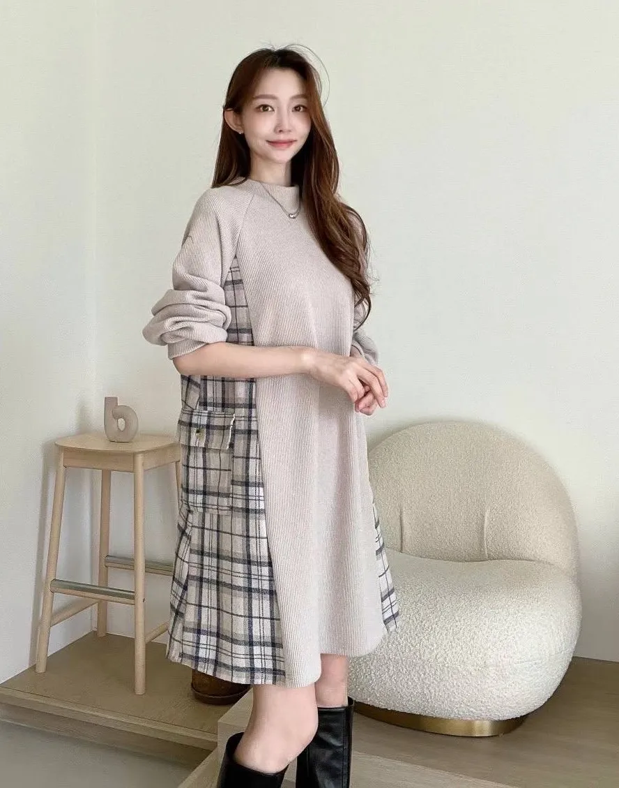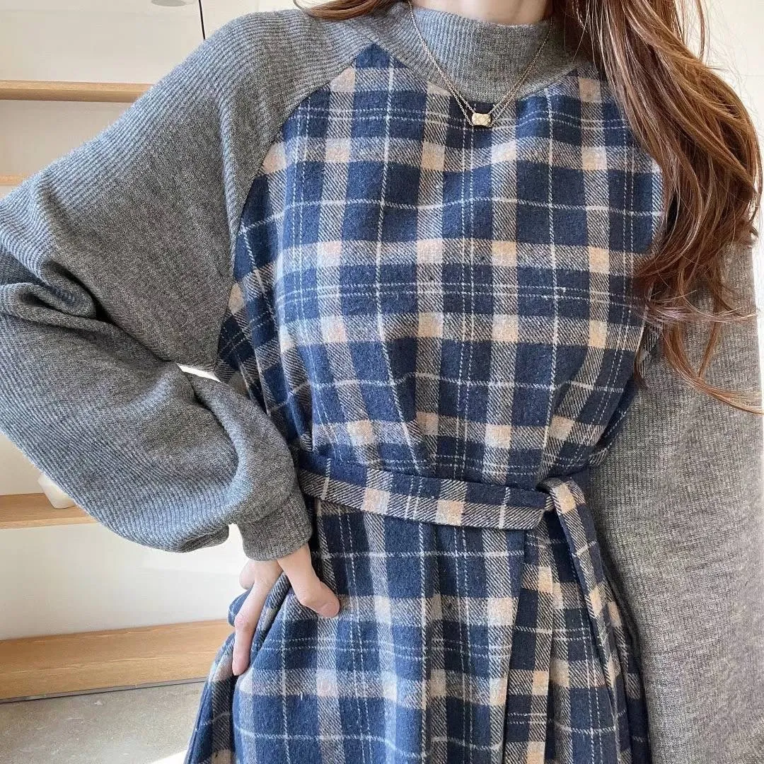 LV1041格紋拼接針織洋裝(附綁帶) 黑 灰 奶茶 官網價$1490 線上價$1460