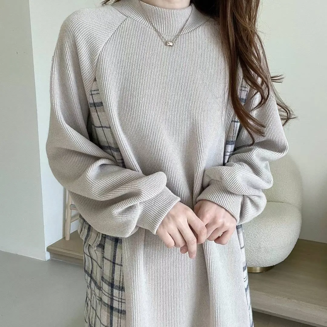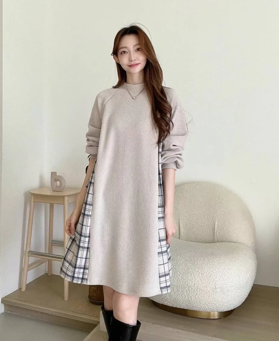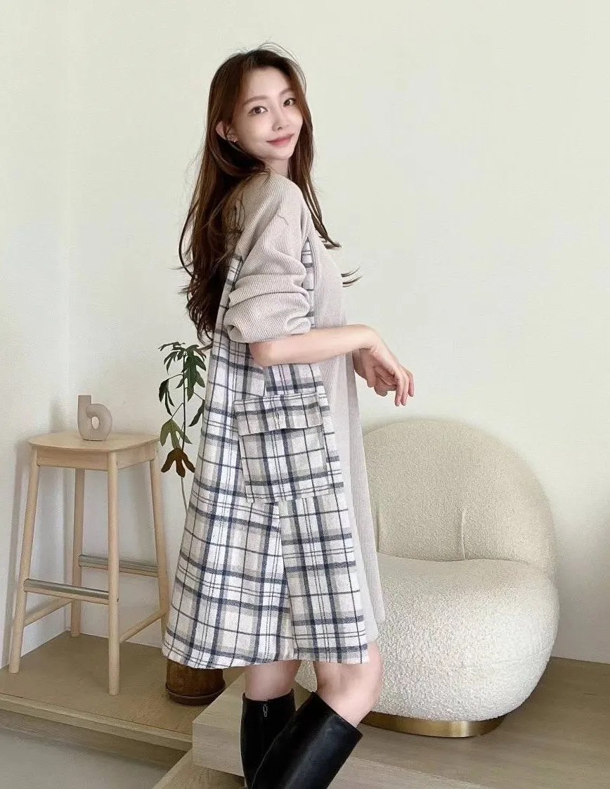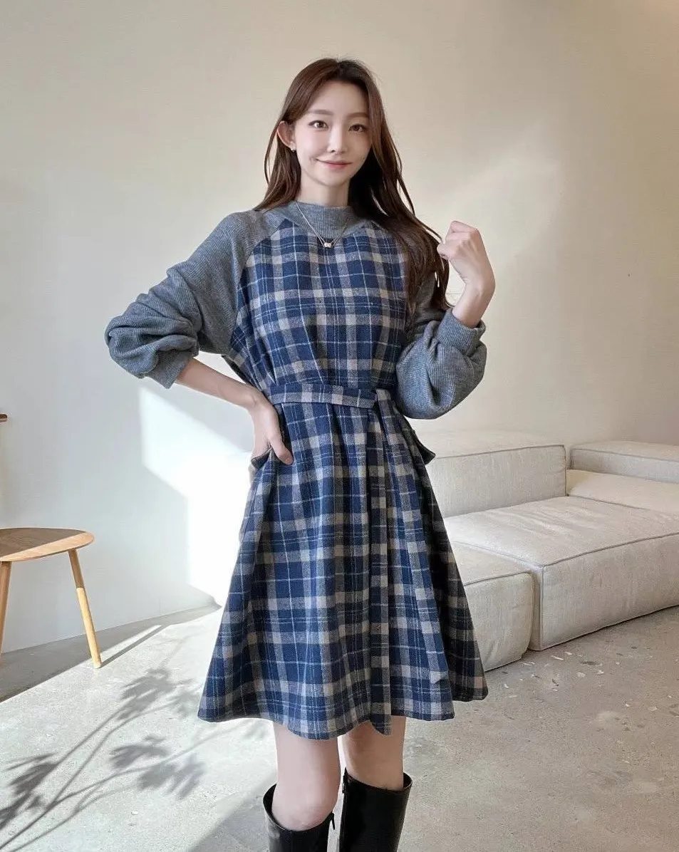 LV1041格紋拼接針織洋裝(附綁帶) 黑 灰 奶茶 官網價$1490 線上價$1460