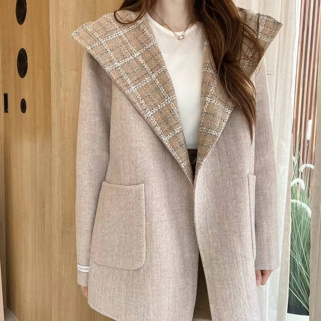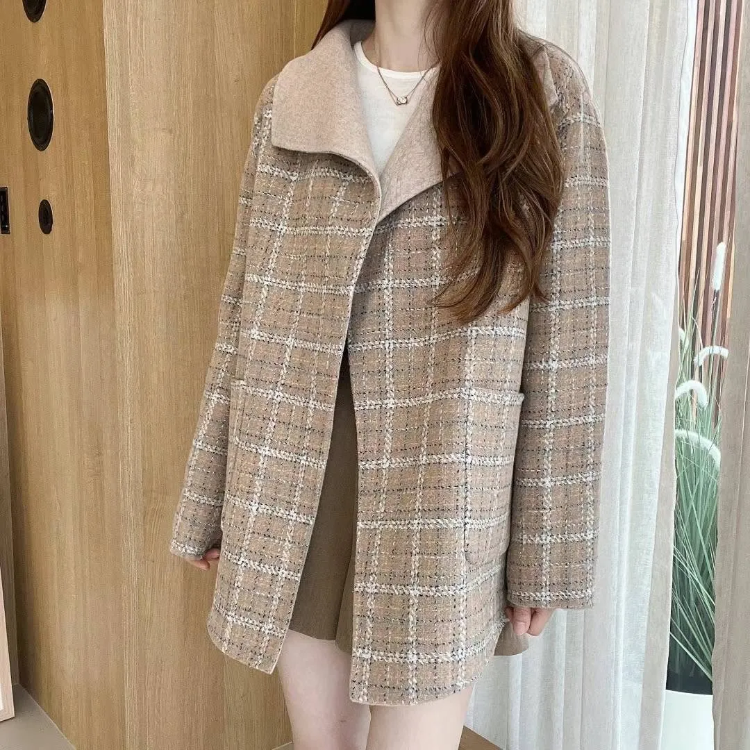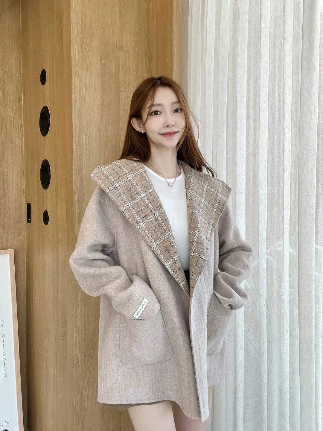 羊毛70% 兩面穿搭 一面素色 一面格紋 雙面都有口袋