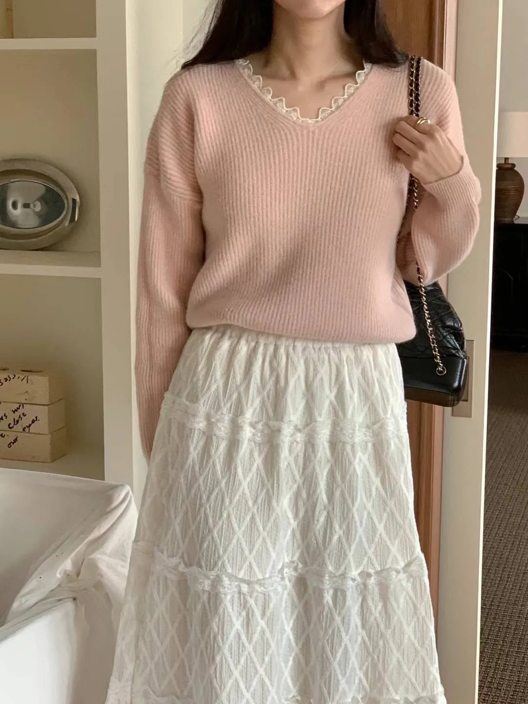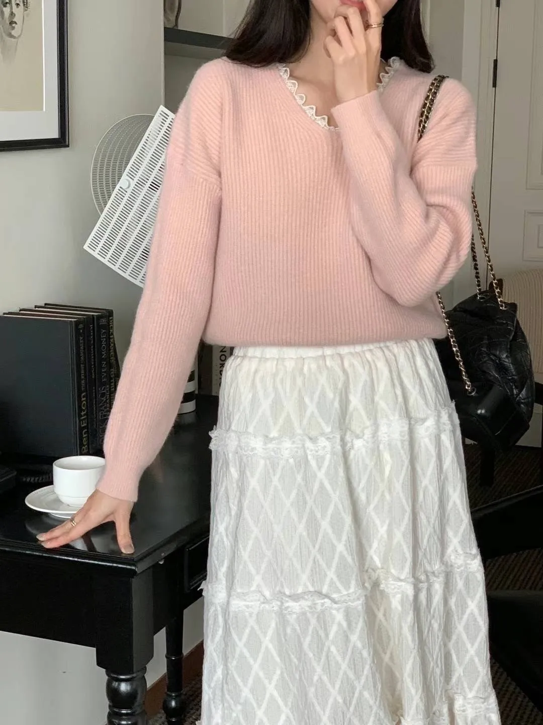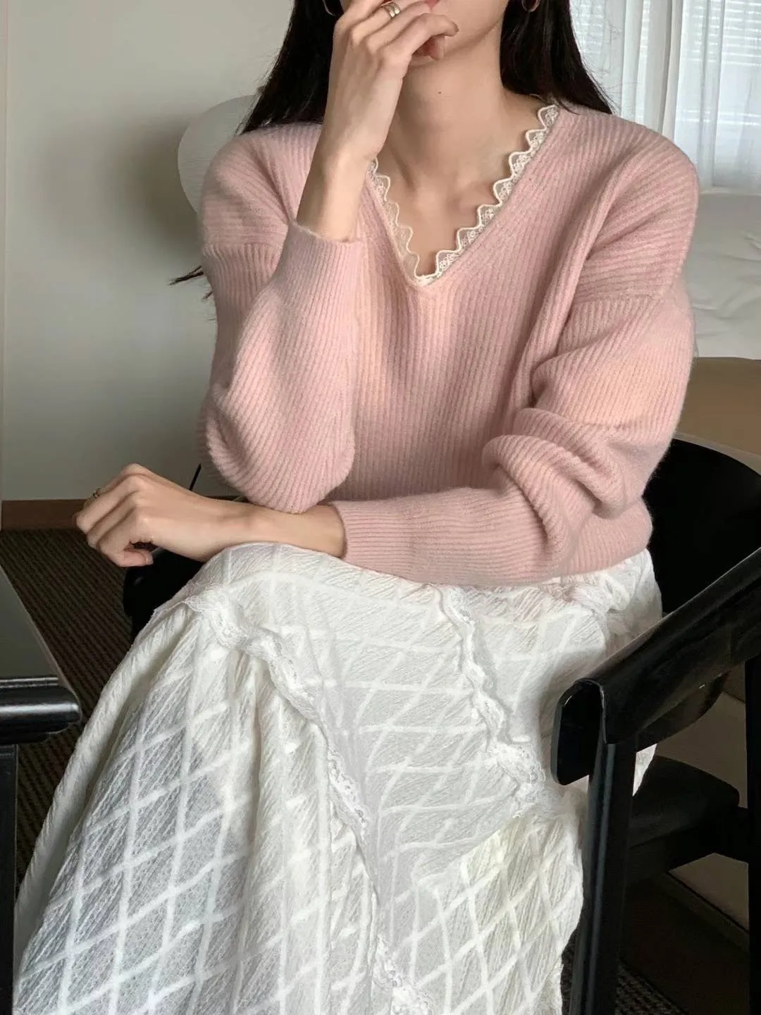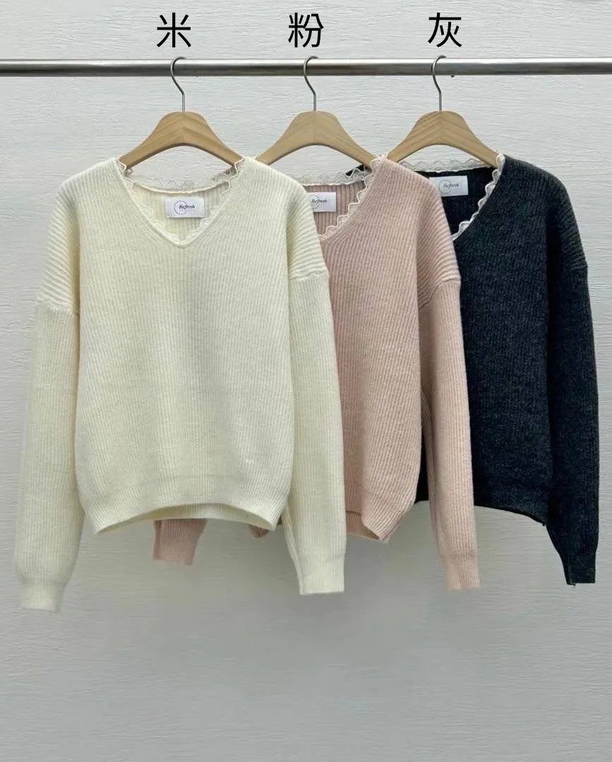 羊毛10%+縲縈+壓克力 V領拼接細緻蕾絲 大彈性