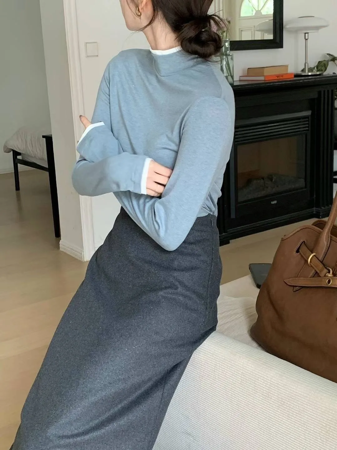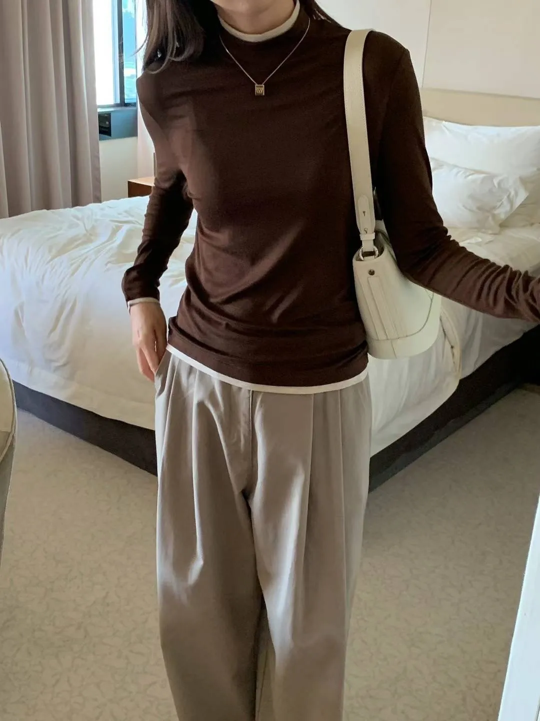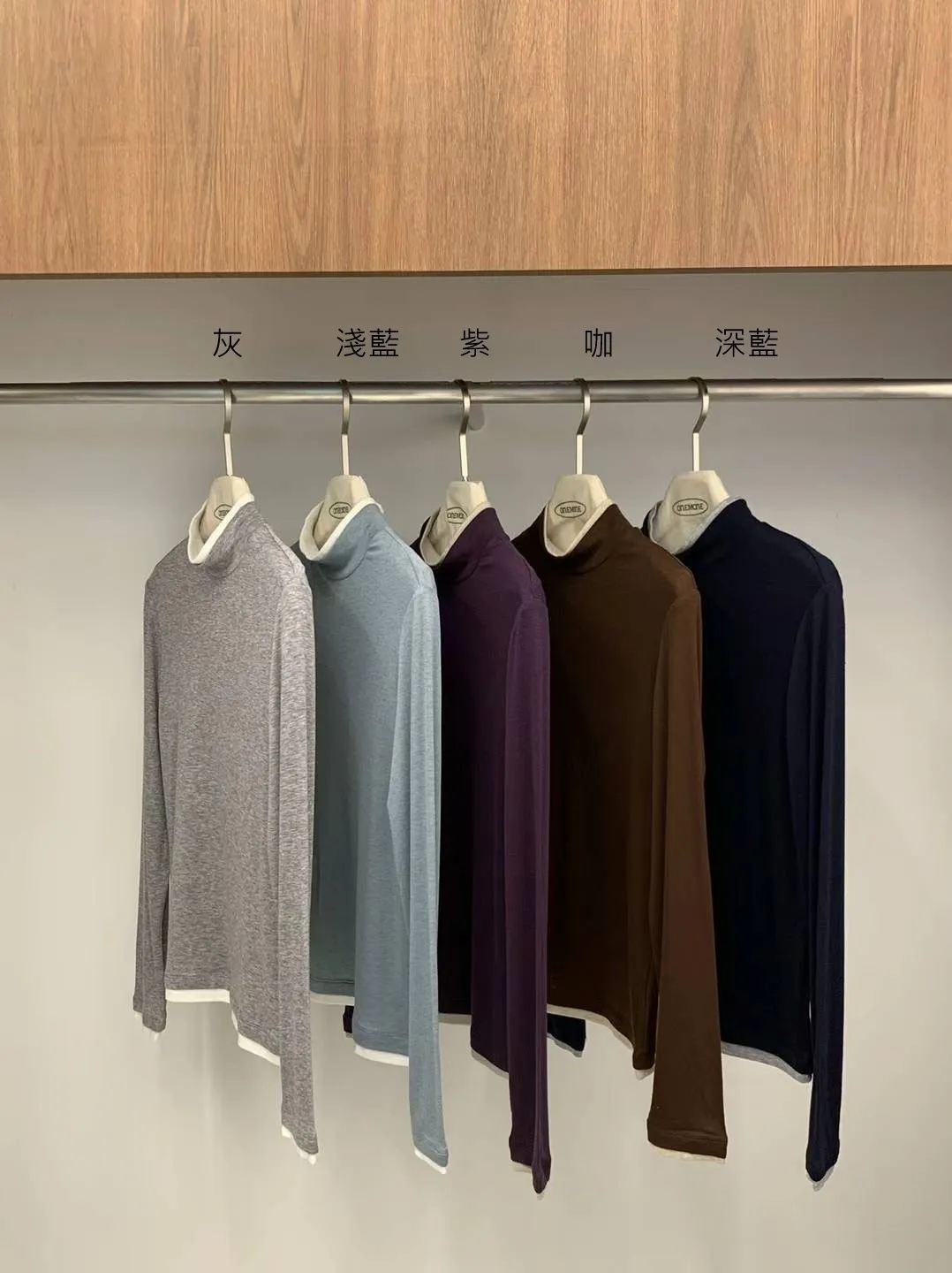 LV132天絲羊毛拼接5色上衣 灰 咖 紫 淺藍 深藍 官網價$680 線上價$650