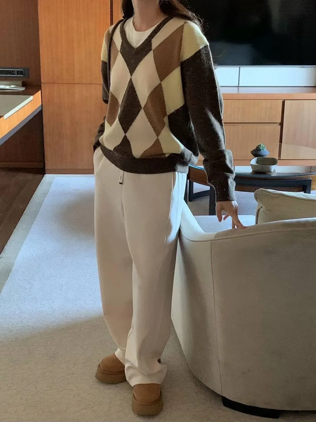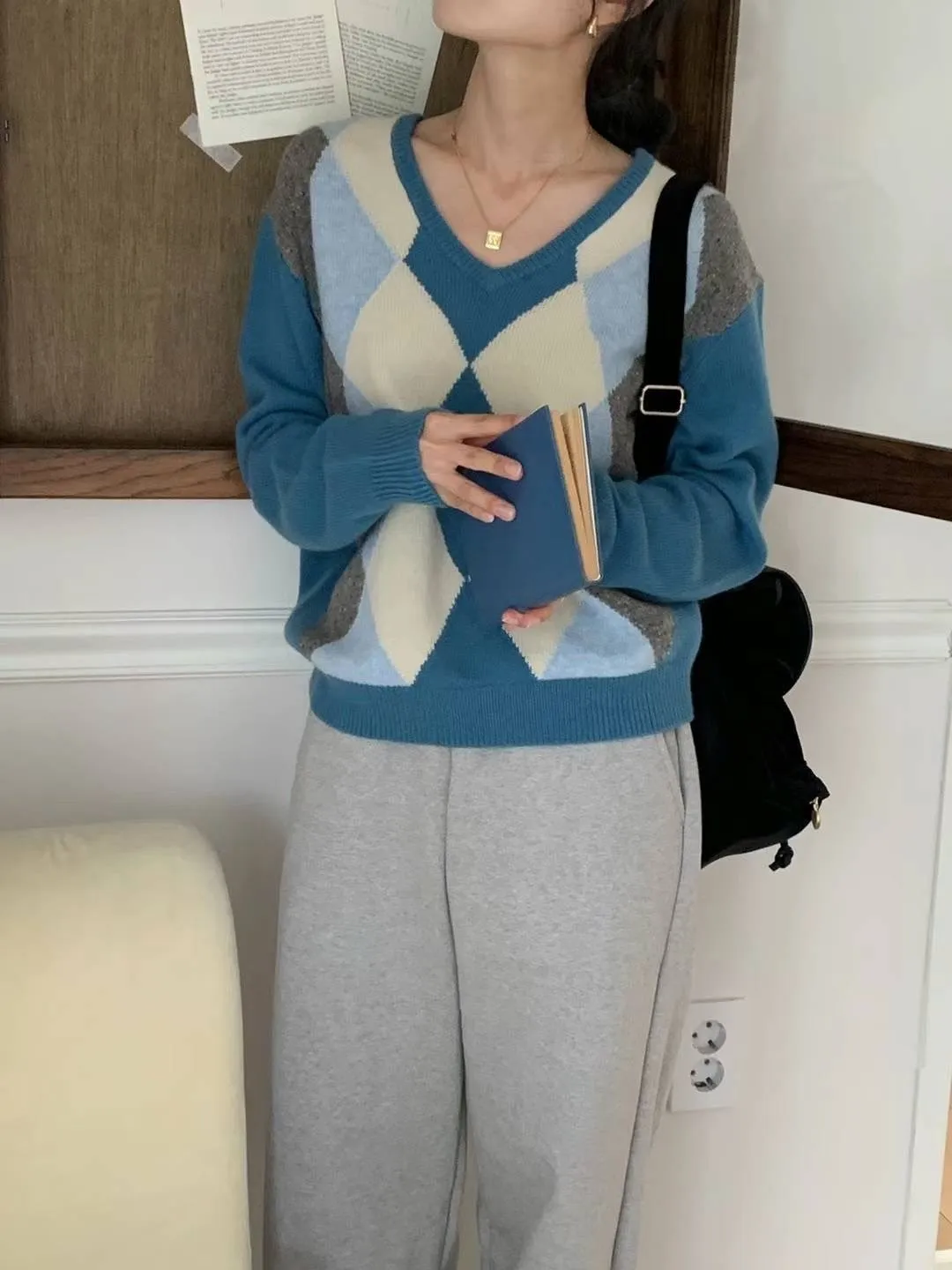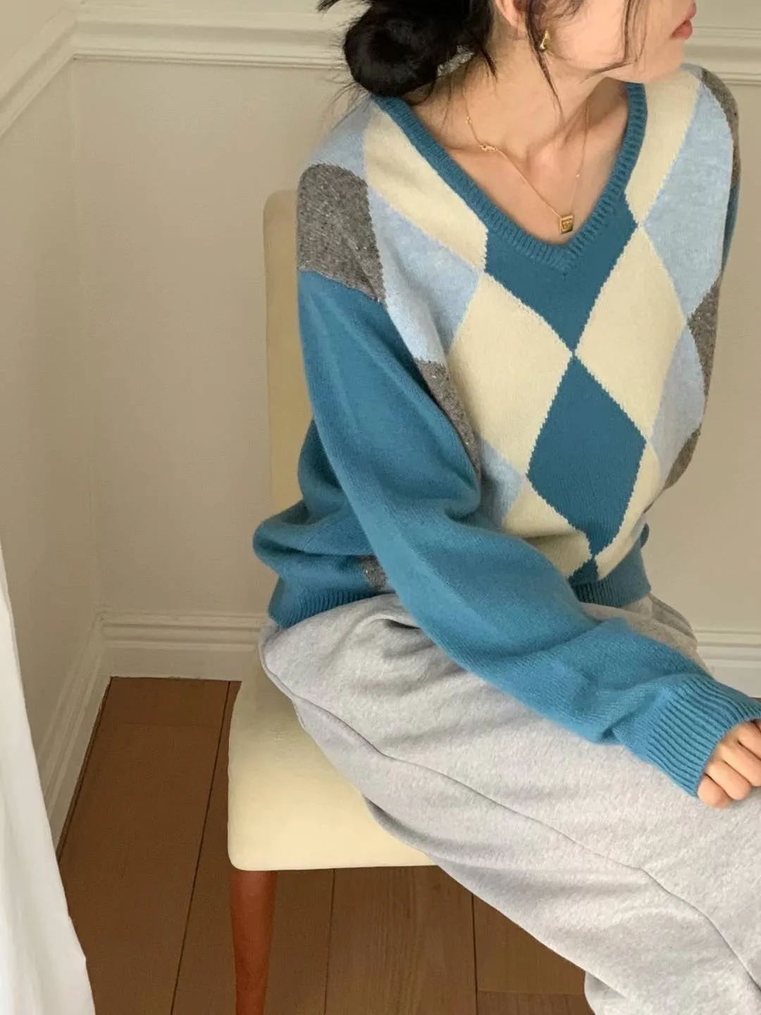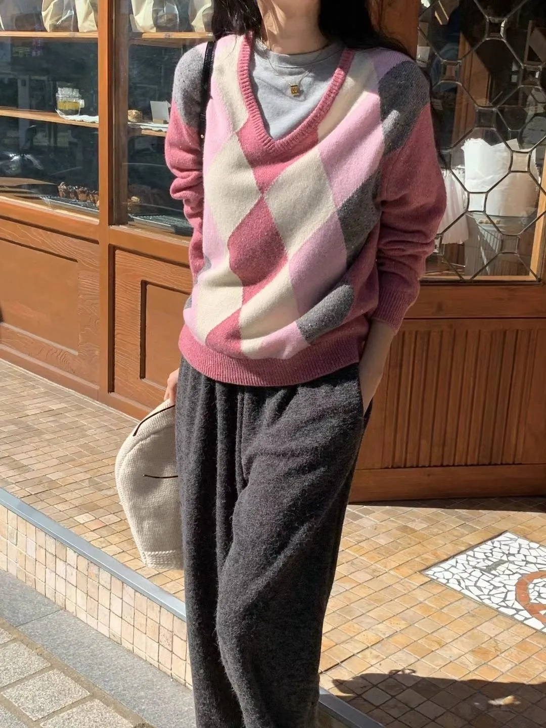 LV133特價格紋V領鬆弛感上衣 藍 咖 黑 粉 原價$1400 特價$1180