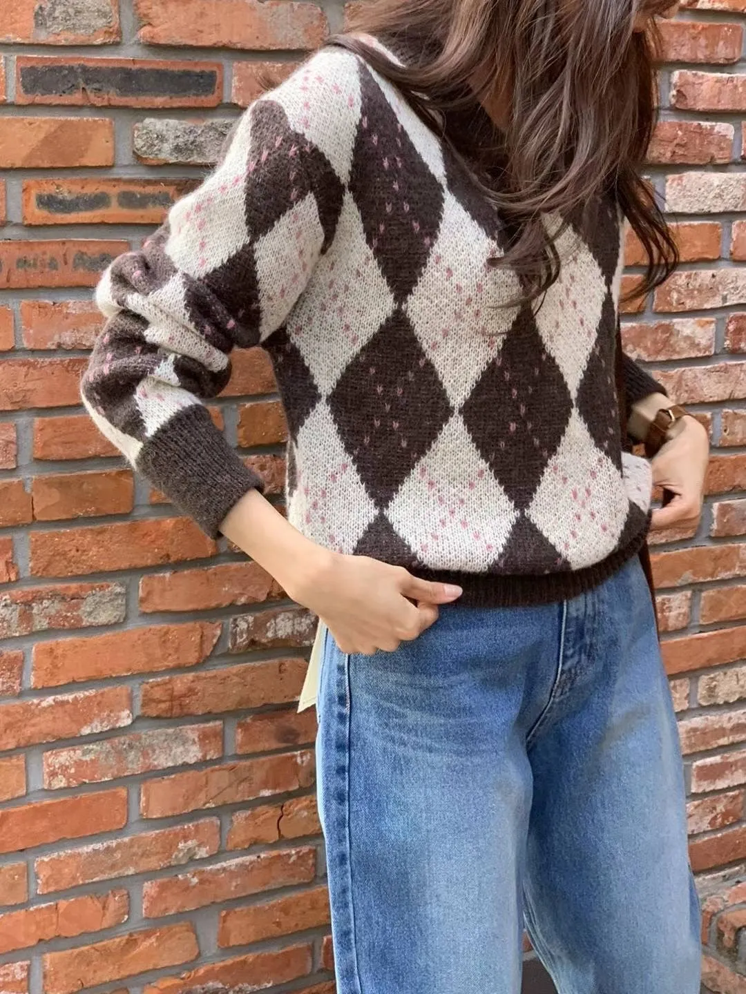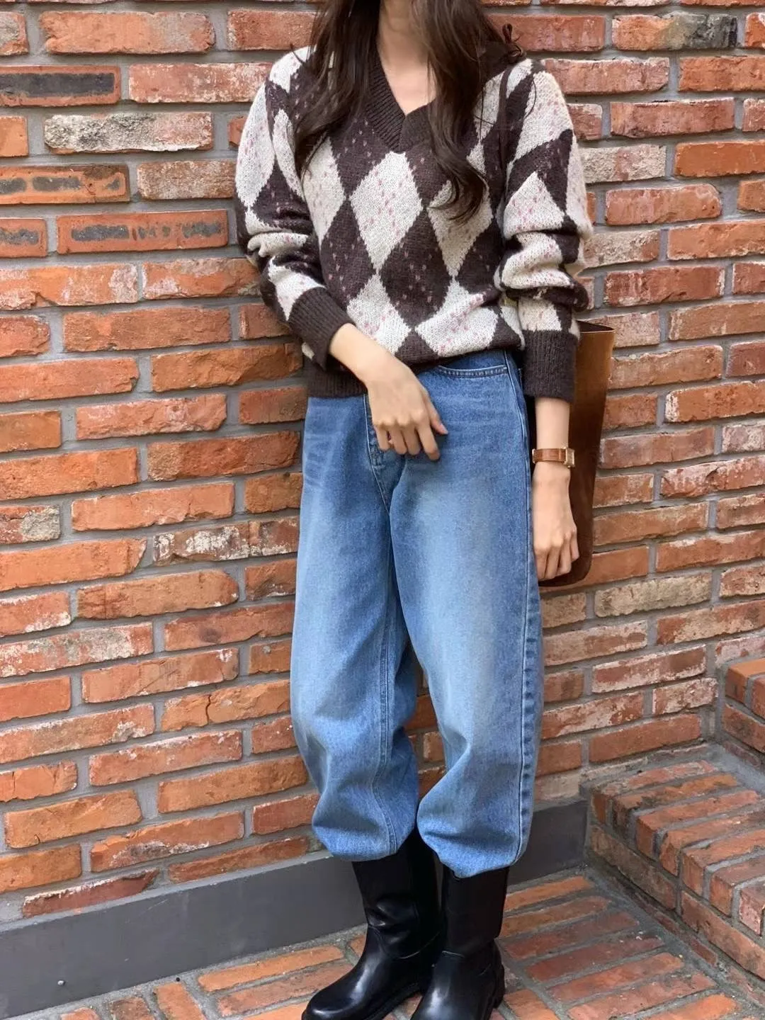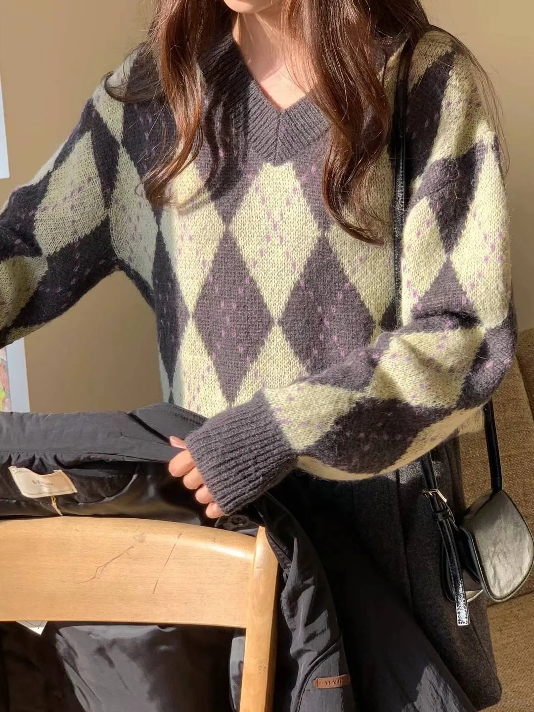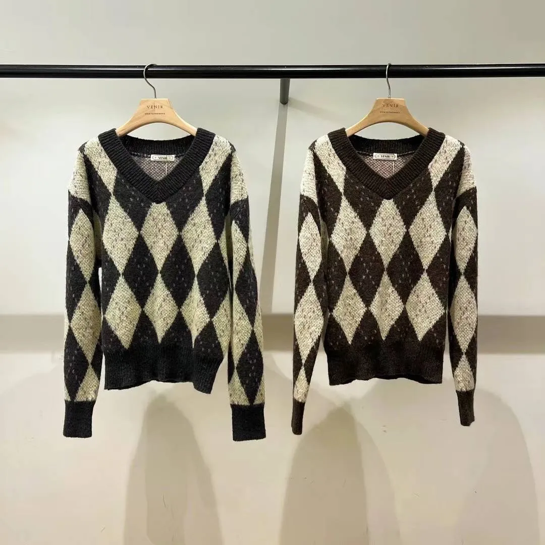LV145菱形格紋V領毛衣 灰 咖 官網價$1190 線上價$1160
