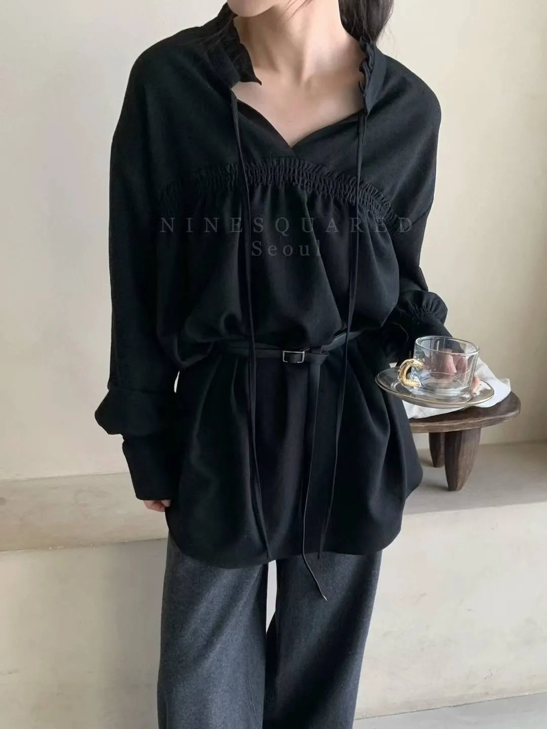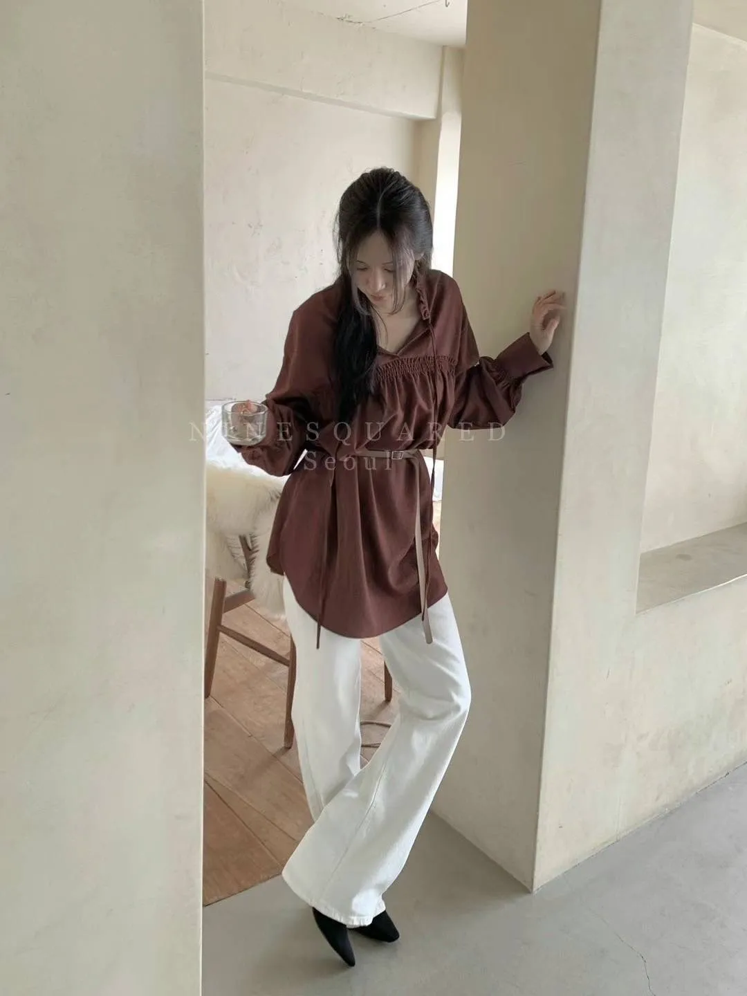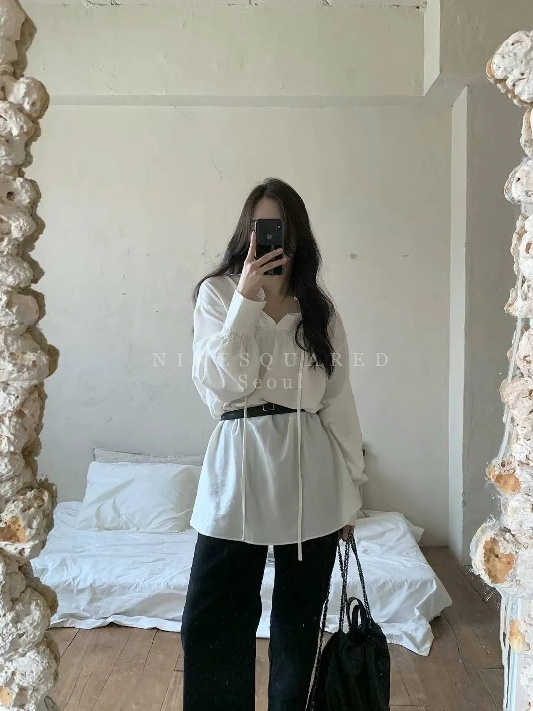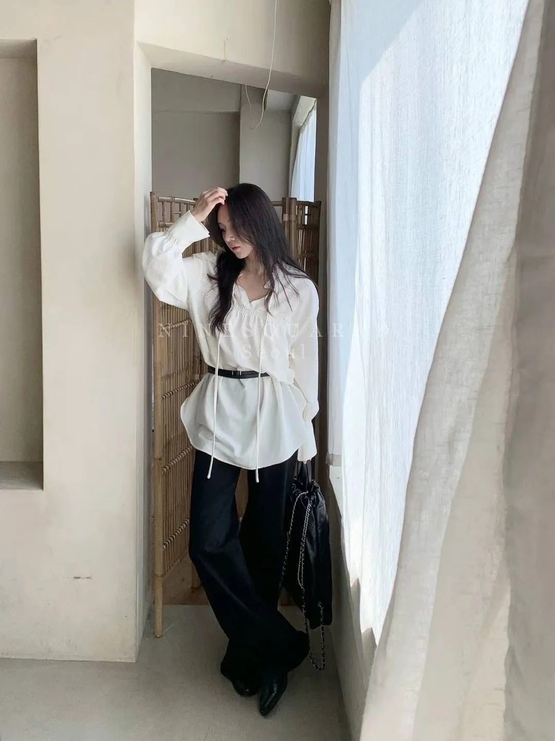 LV179荷葉領愜意鬆弛感胸綁帶上衣 白 咖 黑 官網價$1250 線上價$1220
