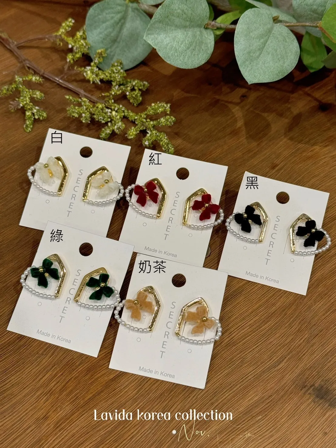 LV287不對稱珍珠金邊愛心蝴蝶結耳環 白 紅 綠 黑 奶茶 耳針$240 耳夾(矽)$260