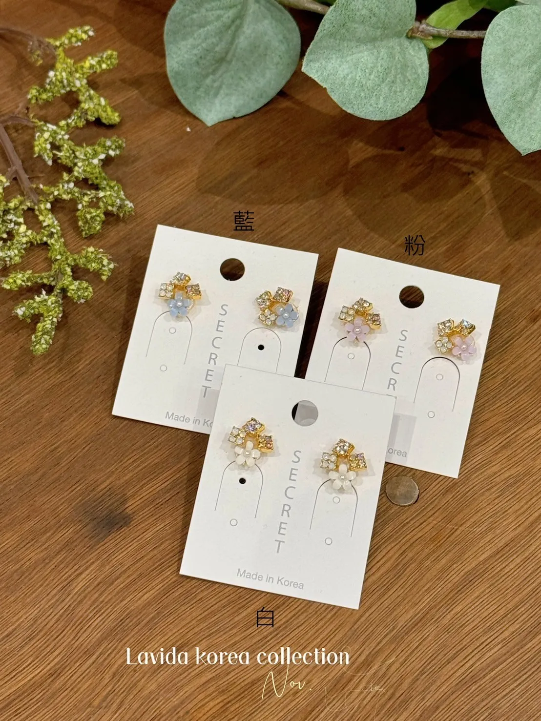 LV292細緻菱鑽小花耳環 白 粉 藍 耳針$230 耳夾(矽)$250