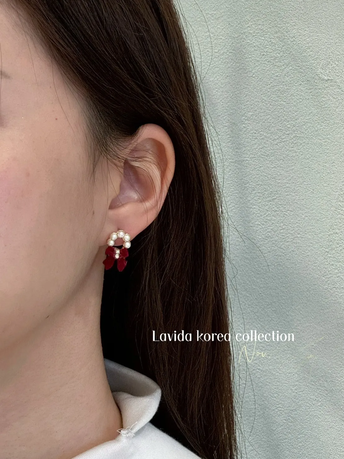 LV293珍珠小花圈細絨蝴蝶結耳環 白 紅 綠 奶茶 耳針$220 耳夾(矽)$240