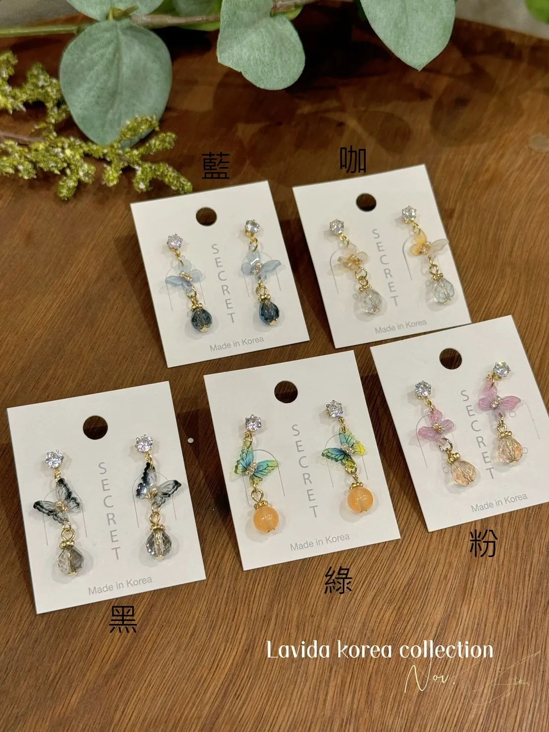 LV296美蝶縈鑽搖曳耳環 粉 咖 藍 綠 黑 耳針$250 耳夾(矽)$270