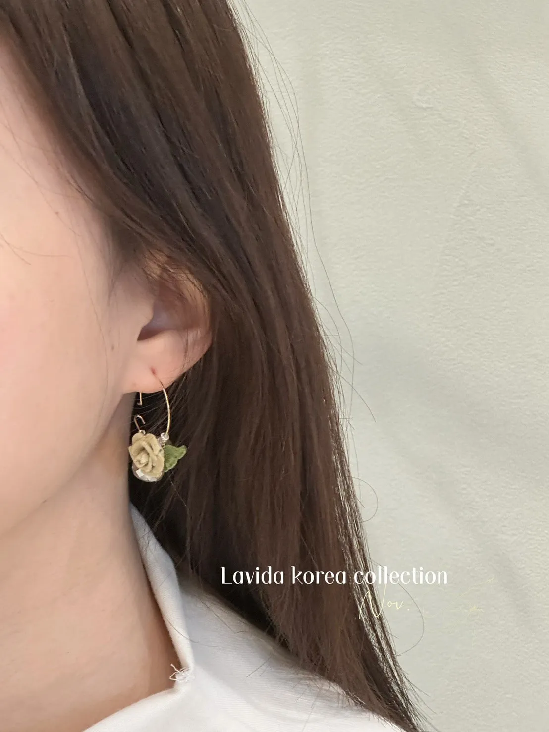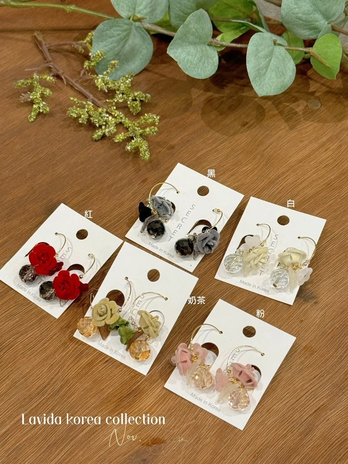 LV305季節限定絲絨玫瑰水晶耳環 白 粉 紅 黑 奶茶 $250
