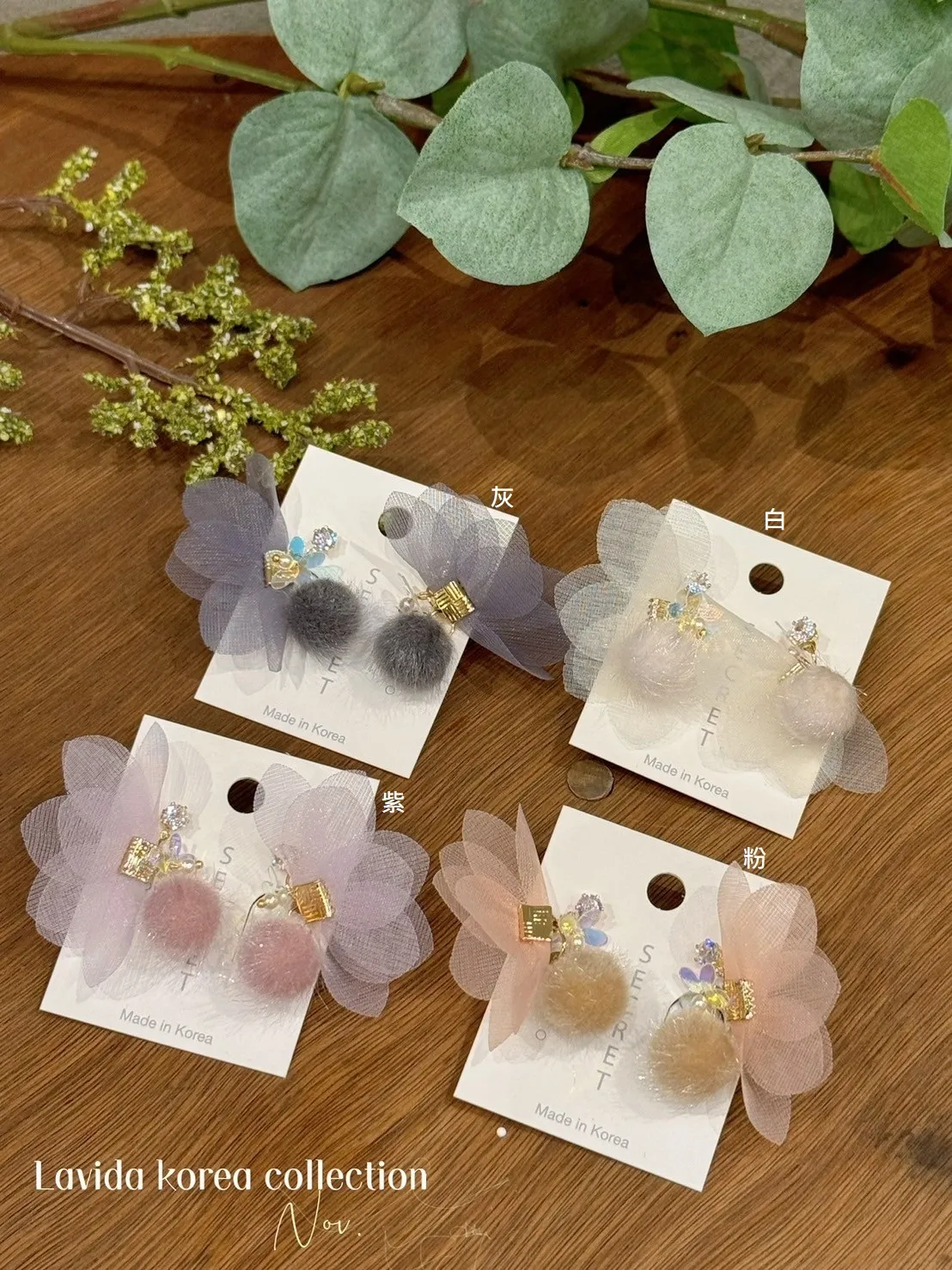 LV311推薦款透光蝶翼毛球耳環 白 粉 紫 灰 耳針$230 耳夾(矽)$250