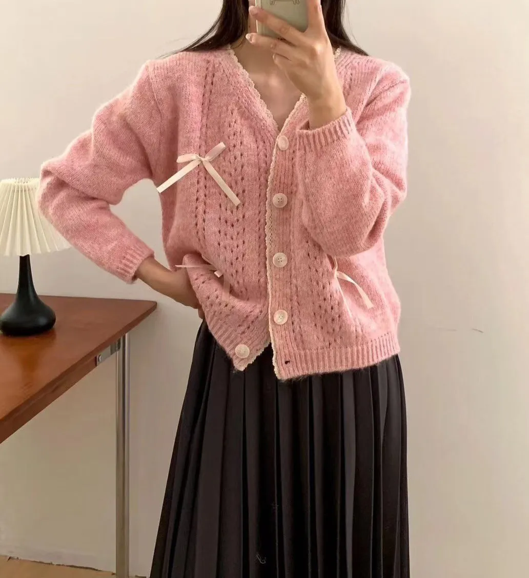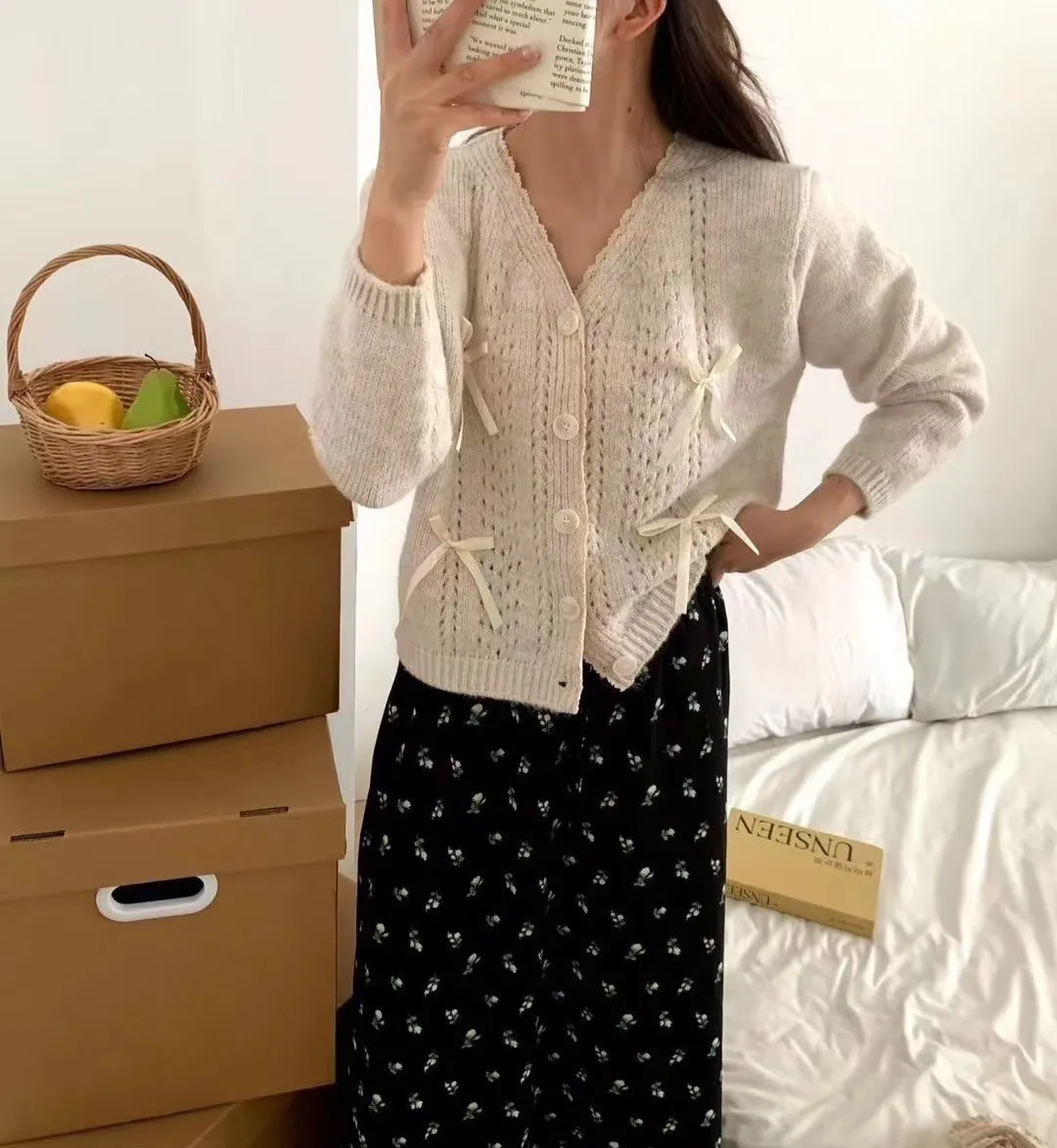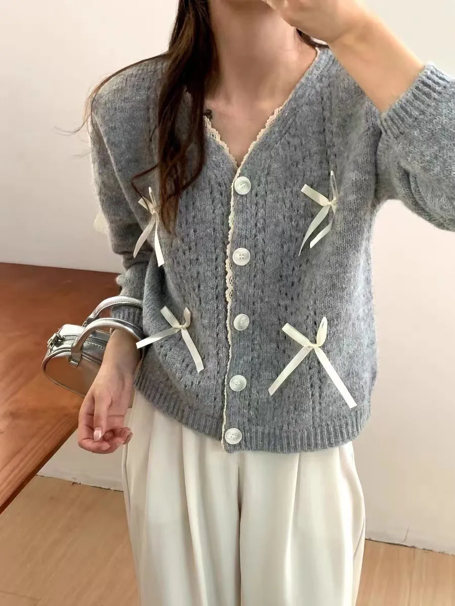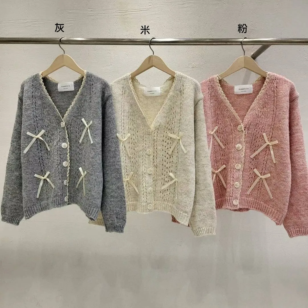 LV520蝴蝶結蕾絲滾邊針織上衣外套 米 粉 灰 官網價$729 線上價$699